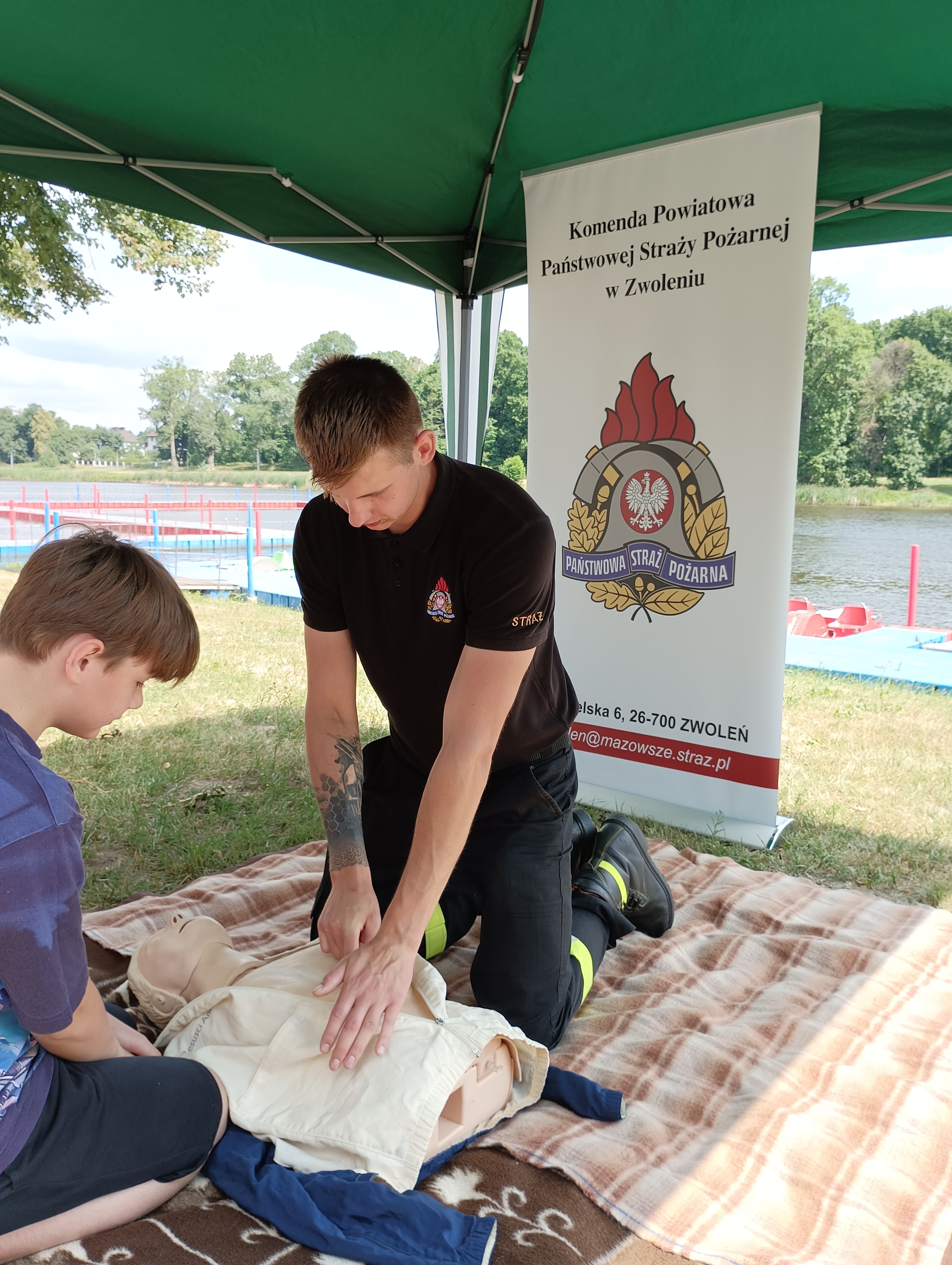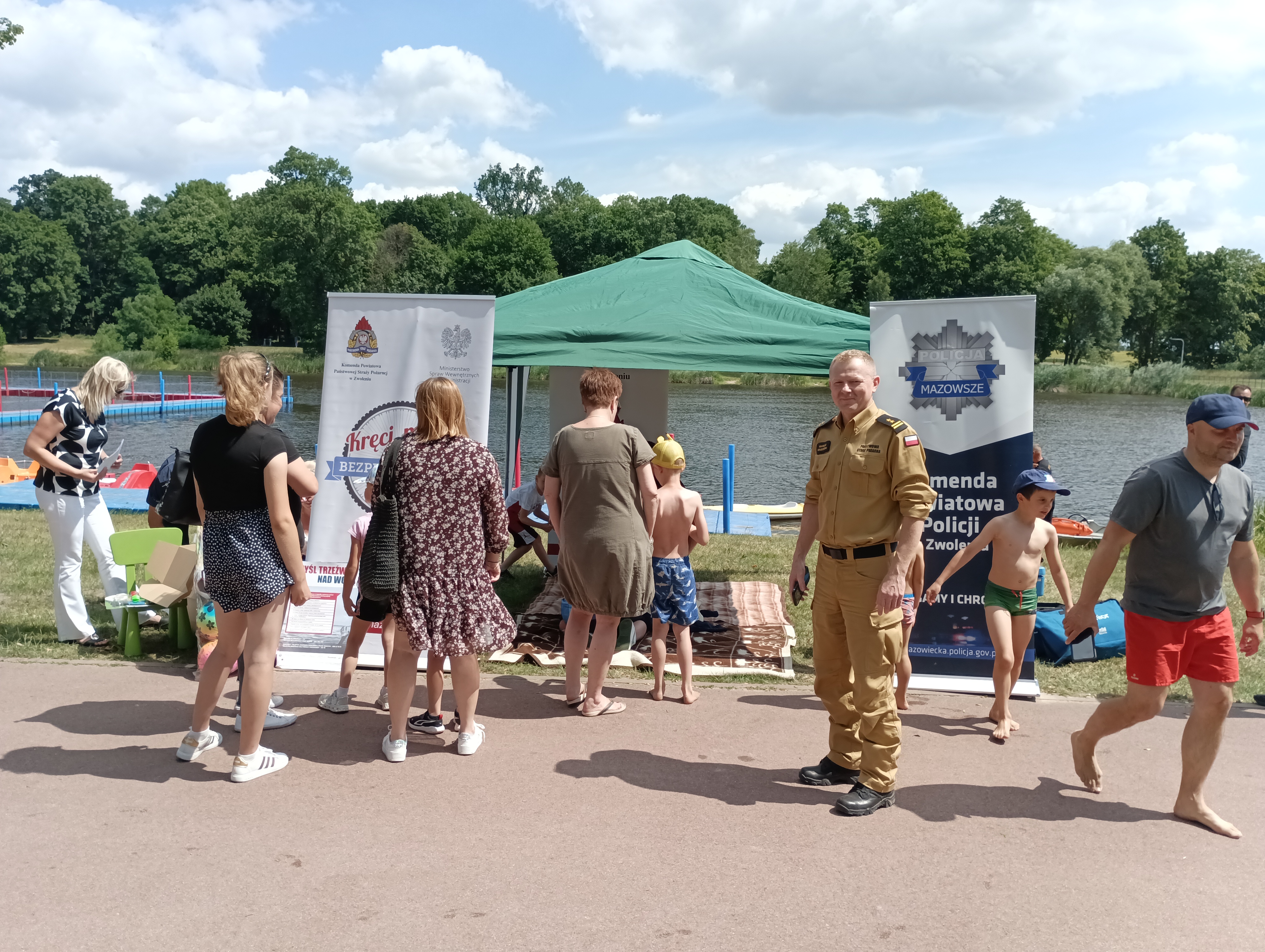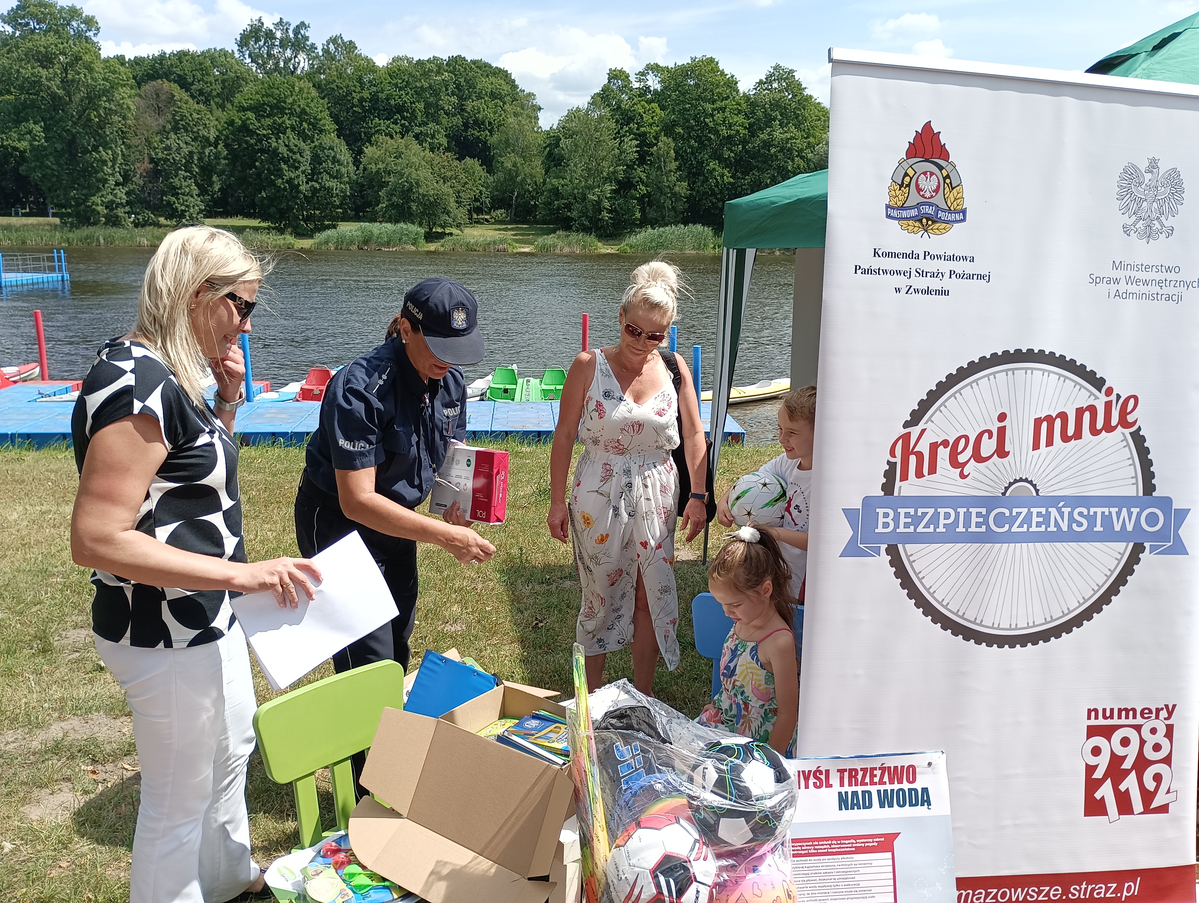 W ramach ogólnopolskiej akcji informacyjno-edukacyjnej "Kręci mnie bezpieczeństwo nad wodą" Komenda Powiatowa Państwowej Straży Pożarnej w Zwoleniu wspólnie z Komendą Powiatową Policji oraz Miejskim Ośrodkiem Pomocy Społecznej w dniu 30.06.2023 r. na terenie kąpieliska MOSiR-u w Zwoleniu przeprowadziła plenerowe spotkanie informacyjno-edukacyjne z dziećmi i młodzieżą. Były m.in. pokazy służb związane z interwencjami nad wodą, a także gry i zabawy dla uczestników. W programie odbyły się pokazy ratownictwa wodnego, sprzętu policyjnego, strażackiego i ratowniczego. Nauczano młodych ludzi zasad bezpiecznej kąpieli w miejscach dozwolonych i bezpiecznego udzielania pomocy osobom tonącym.