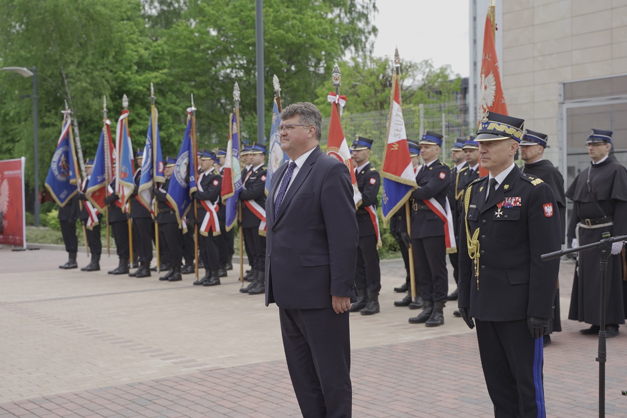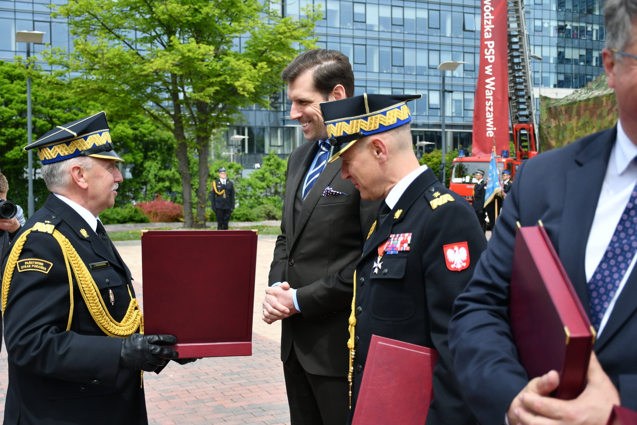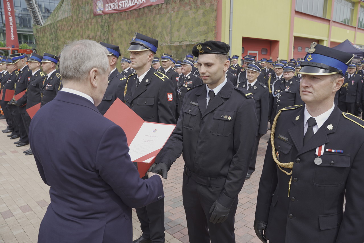 Uroczystość rozpoczęła się złożeniem meldunku, który przyjął Pan Maciej Wąsik - Sekretarz Stanu w Ministerstwie Spraw Wewnętrznych i Administracji w asyście gen. brygadiera Andrzeja Bartkowiaka - Komendanta Głównego Państwowej Straży Pożarnej. Po podniesieniu flagi państwowej i odegraniu Mazurka Dąbrowskiego, Mazowiecki Komendant Wojewódzki PSP nadbryg. Jarosław Piotrowski przywitał uczestników obchodów oraz podziękował Kierownictwu Ministerstwa Spraw Wewnętrznych i Administracji oraz Komendy Głównej PSP za zaangażowanie i dbałość o poprawę warunków służby. Podziękował także wszystkim przedstawicielom instytucji zarówno szczebla państwowego, jak i samorządowego, wszystkim sympatykom służby za doskonałą współpracę i ogromne wsparcie finansowe, które kierowane jest do jednostek PSP i OSP z terenu Mazowsza. Wyrazy wdzięczności popłynęły również do strażaków największego garnizonu w Polsce, za profesjonalizm i bohaterstwo każdego dnia, kiedy wypełniają rotę strażackiego ślubowania, za oddanie i służbę. Ponadto wręczano odznaczenia państwowe, awanse na wyższe stopnie służbowe oraz wyróżnienia. Funkcjonariusze naszej komendy: mł.kpt. Lis Grzegorz, st.ogn. Lewikowski Grzegorz, st.ogn. Banasik Radosław zostali uhonorowani Prezydenckimi Medalami za Długoletnią Służbę, natomiast st.str. Zaguła Mateusz otrzymał wyróżnienie Strażaka Miesiąca za ratowanie ofiary wypadku drogowego w czasie wolnym od służby. Ponadto w uroczystościach mł.asp. Kamil Stępień godnie reprezentował naszą jednostkę organizacyjną, jako flagowy pocztu flagowego mazowieckiej kompani reprezentacyjnej strażaków.
