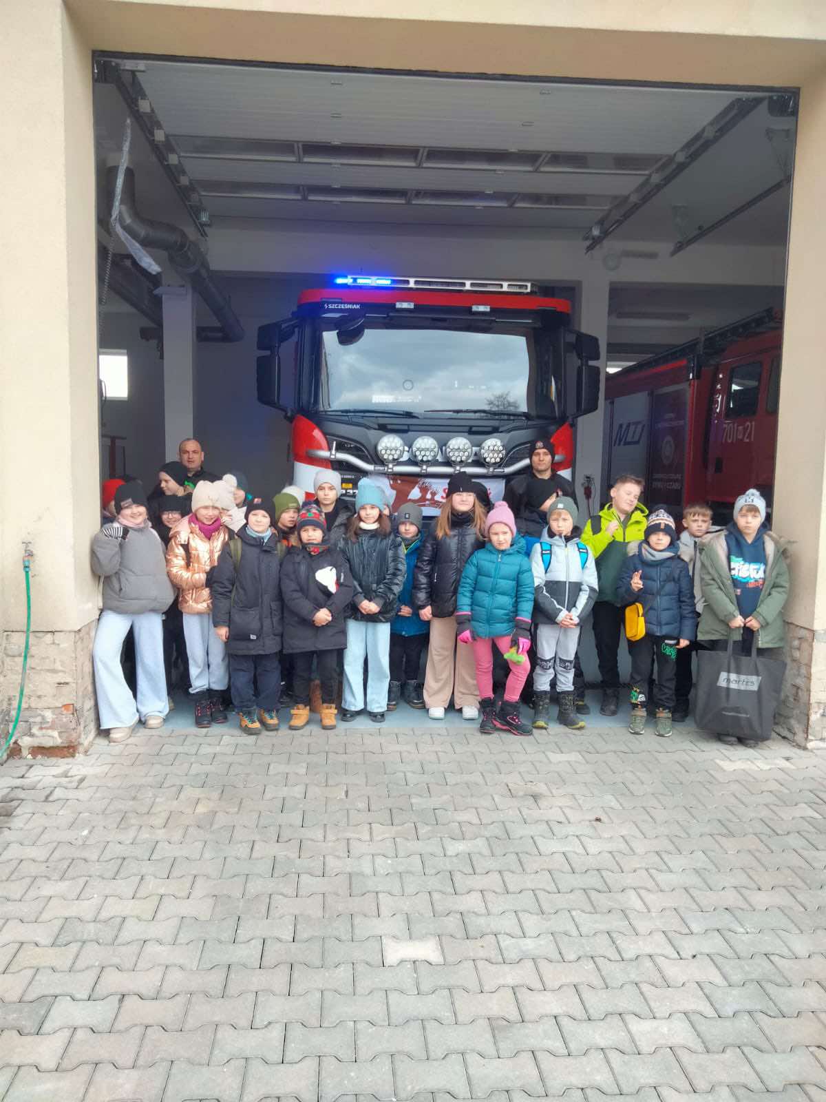 Strażacy pokazali dzieciom sprzęt znajdujący się na samochodach ratowniczo – gaśniczych oraz przeprowadzili pogadankę na temat „Bezpiecznych Ferii” i „Czujka na Straży Twojego Bezpieczeństwa”, omówili zasady udzielania kwalifikowanej pierwszej pomocy oraz przybliżyli dzieciom zawód strażaka.