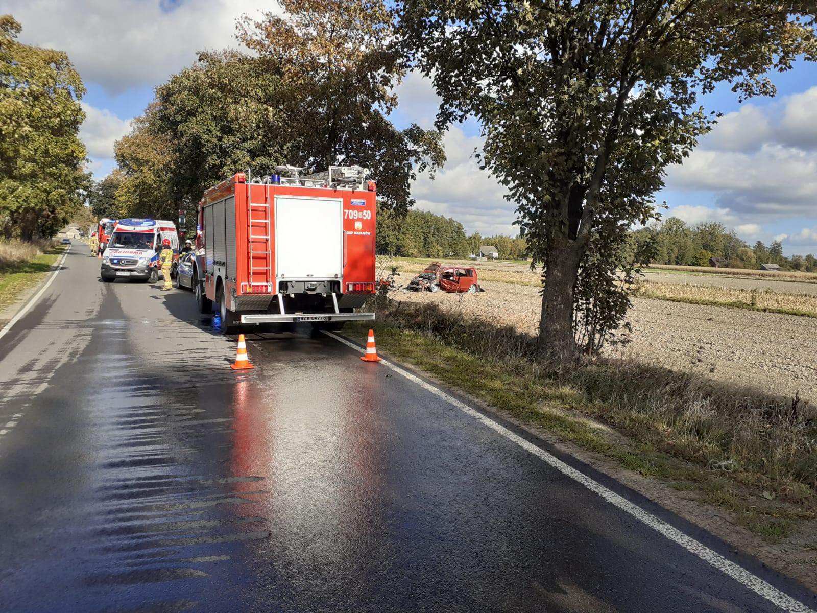 17.10.2023 roku około godziny 12.09 w miejscowości Dębnica gmina Kazanów samochód osobowy zjechał z drogi, uderzył w drzewo i zatrzymał się w polu. Wskutek zdarzenia poszkodowany został kierujący pojazdem. W działaniach udział brało 2 zastępy JRG Zwoleń oraz zastęp z OSP Kazanów.