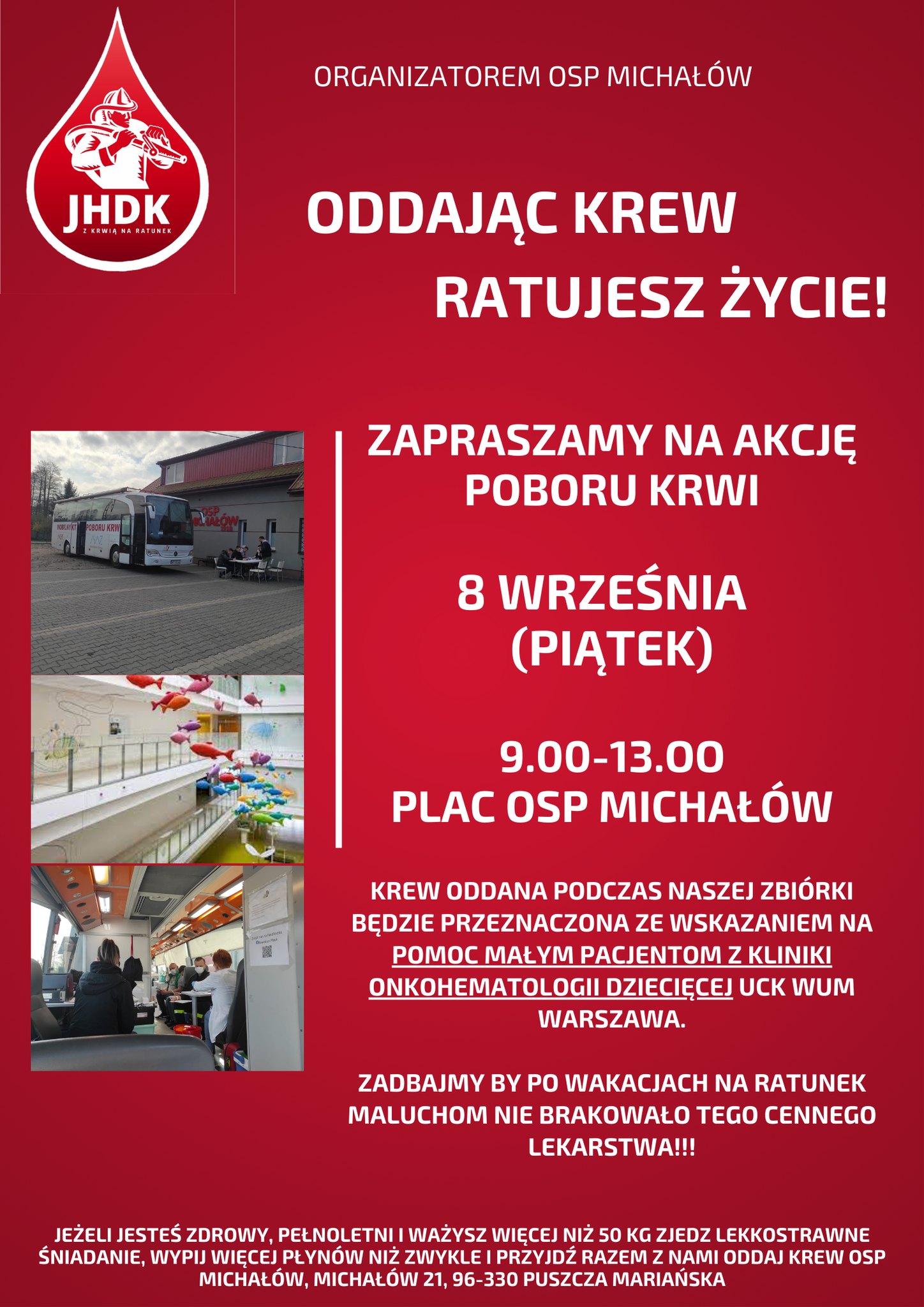 W imieniu druhów z jednostki Ochotniczej Straży Pożarnej w Michałowie zapraszamy w dniu 8 września 2023 roku na akcję honorowego krwiodawstwa. Krew oddawana podczas zbiórki będzie przeznaczona na pomoc małym pacjentom z Kliniki Onkohematologii Dziecięcej UCK WUM w Warszawie.