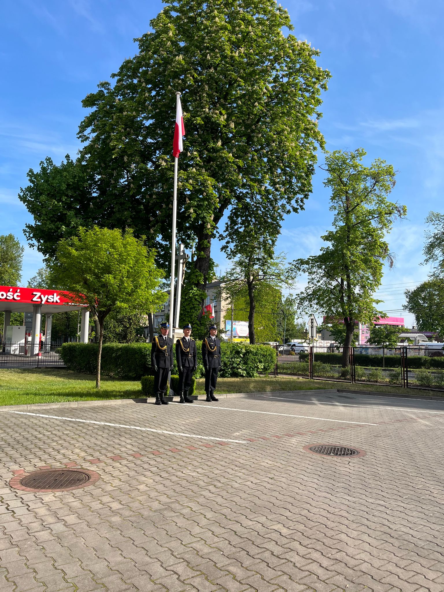 Dziś, 2 maja 2025 r. przed budynkiem Komendy Powiatowej Panstwowej Straży Pożarnej odbyła się uroczysta zmiana służby, podczas której uroczyście podniesiono Flagę Państwową na maszt i odśpiewano hymn państwowy.