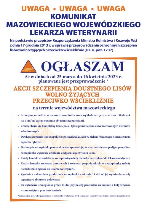 Od 25 marca do 16 kwietnia 2023 r. Mazowiecki Wojewódzki Lekarz Weterynarii z udziałem Powiatowych Lekarzy Weterynarii przeprowadzi jesienną akcję szczepienia lisów wolno żyjących przeciwko wściekliźnie na terenie całego województwa mazowieckiego. Szczepionka będzie wykładana ręcznie oraz zrzucana z samolotów na lasy, pola i łąki. Przynęty ze szczepionką nie wolno dotykać. Zwierzęta nie przyjmą tych z zapachem człowieka. Przez dwa tygodnie od wyłożenia szczepionki należy zachować ostrożność podczas wyprowadzania zwierząt.