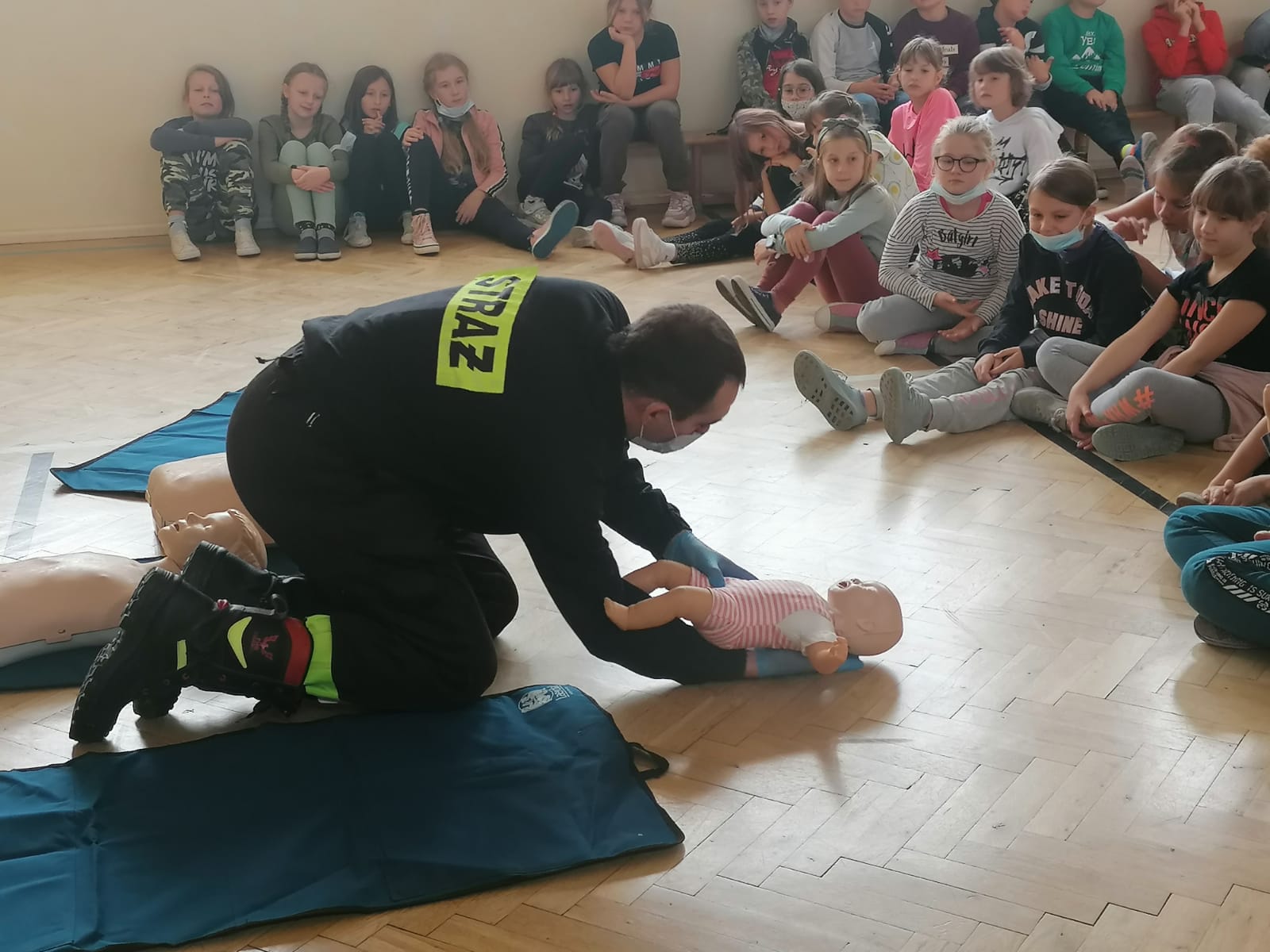 4 listopada 2021 roku żyrardowscy strażacy z Komendy Powiatowej PSP w Żyrardowie odwiedzili dzieci klas trzecich ze Szkoły Podstawowej nr 1 w Żyrardowie. Funkcjonariusze przeprowadzili zajęcia, podczas których pokazali jak prawidłowo udzielać kwalifikowanej pomocy przedlekarskiej w sytuacjach mogących wydarzyć się w życiu codziennym, takich jak: zadławienie, omdlenie czy resuscytacja krążeniowo - oddechowa. Po zakończeniu pokazu chętni uczniowie mogli samodzielnie przećwiczyć udzielanie pierwszej pomocy.