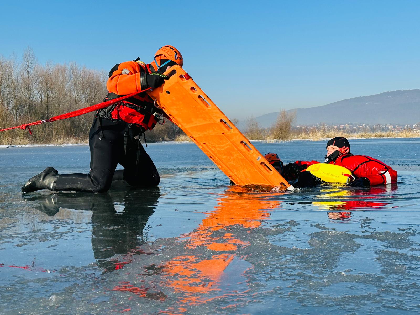 Ćwiczenia strażaków na zamarzniętym akwenie wodnym