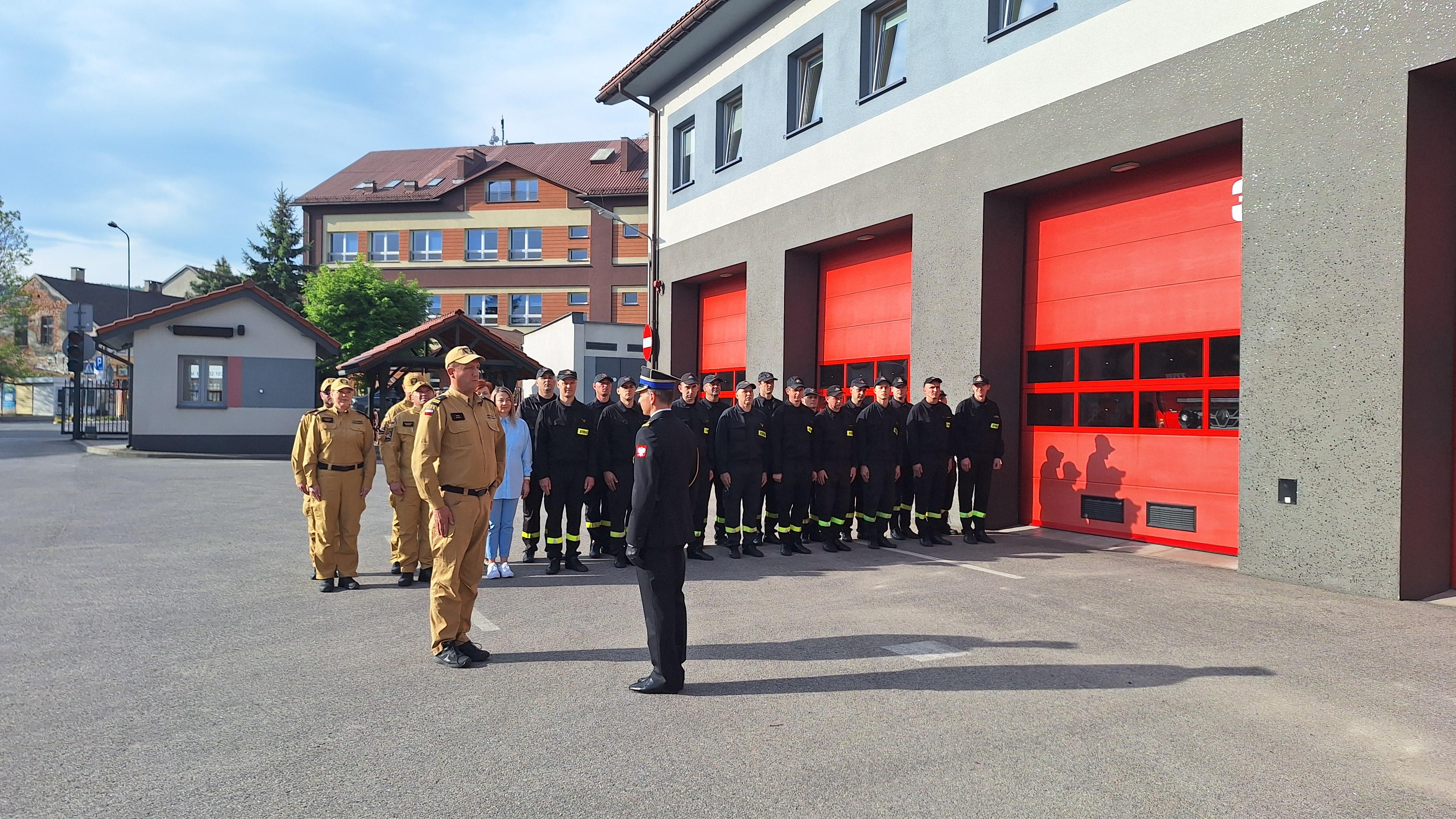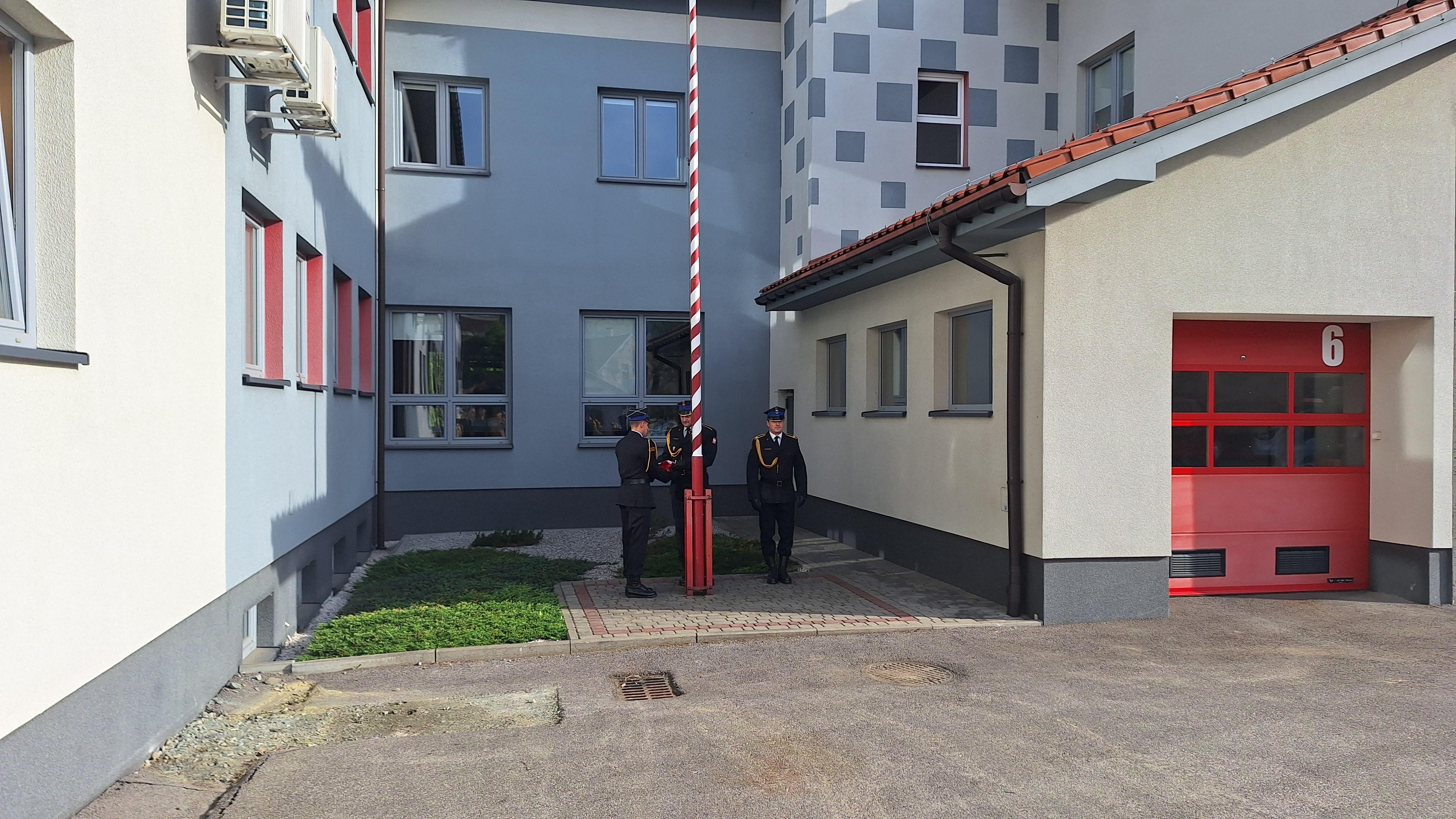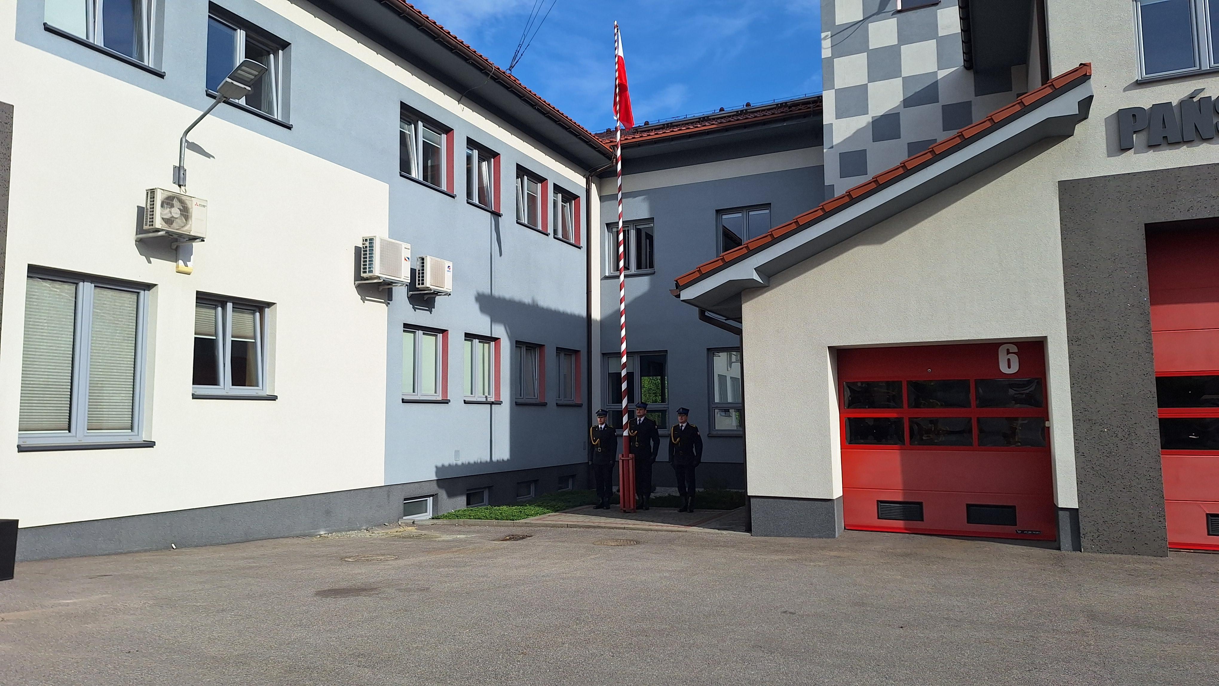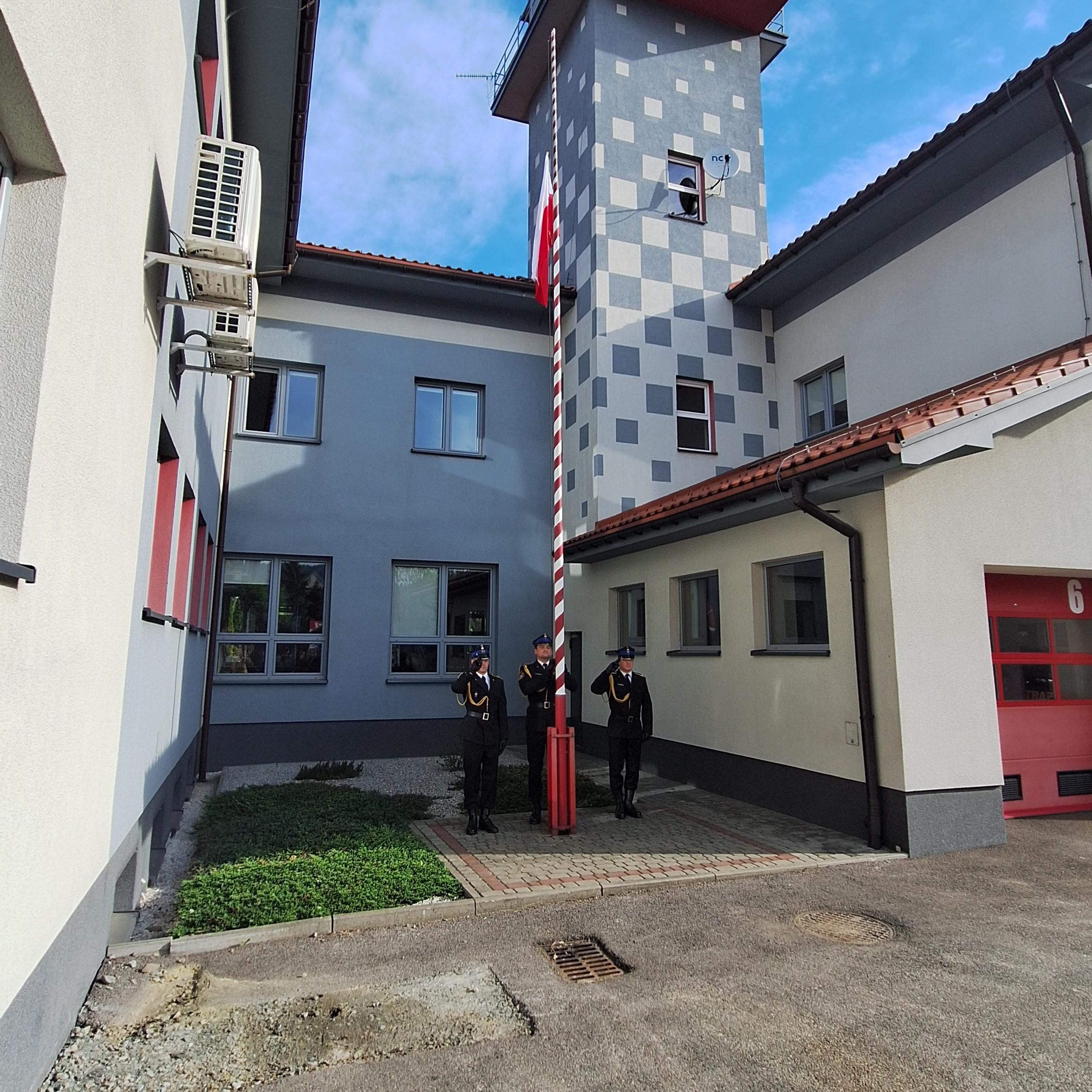 Uroczyste podniesienie flagi państwowej na maszt oraz odśpiewanie hymnu. Tak żywieccy strażacy uczcili 2 maja – Dzień Flagi Rzeczypospolitej Polskiej.