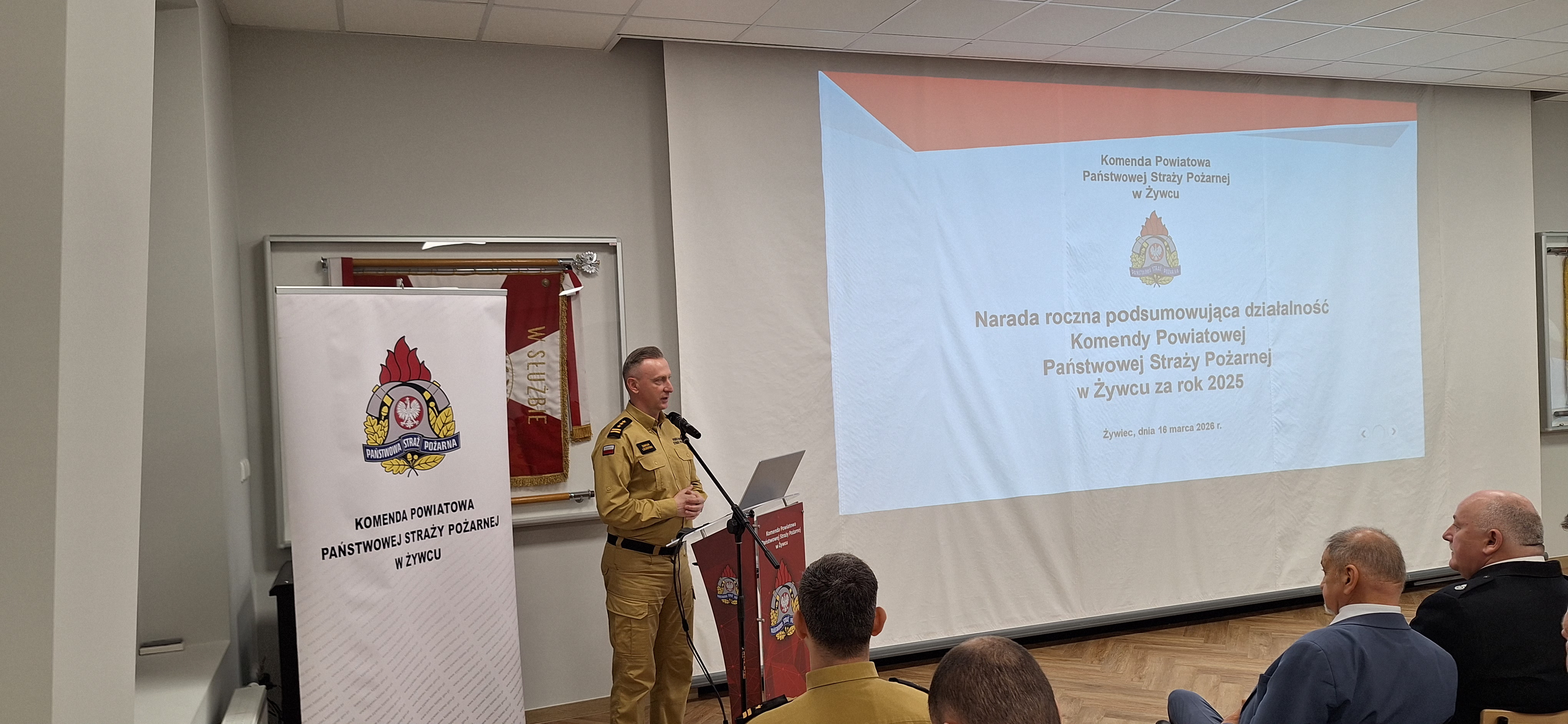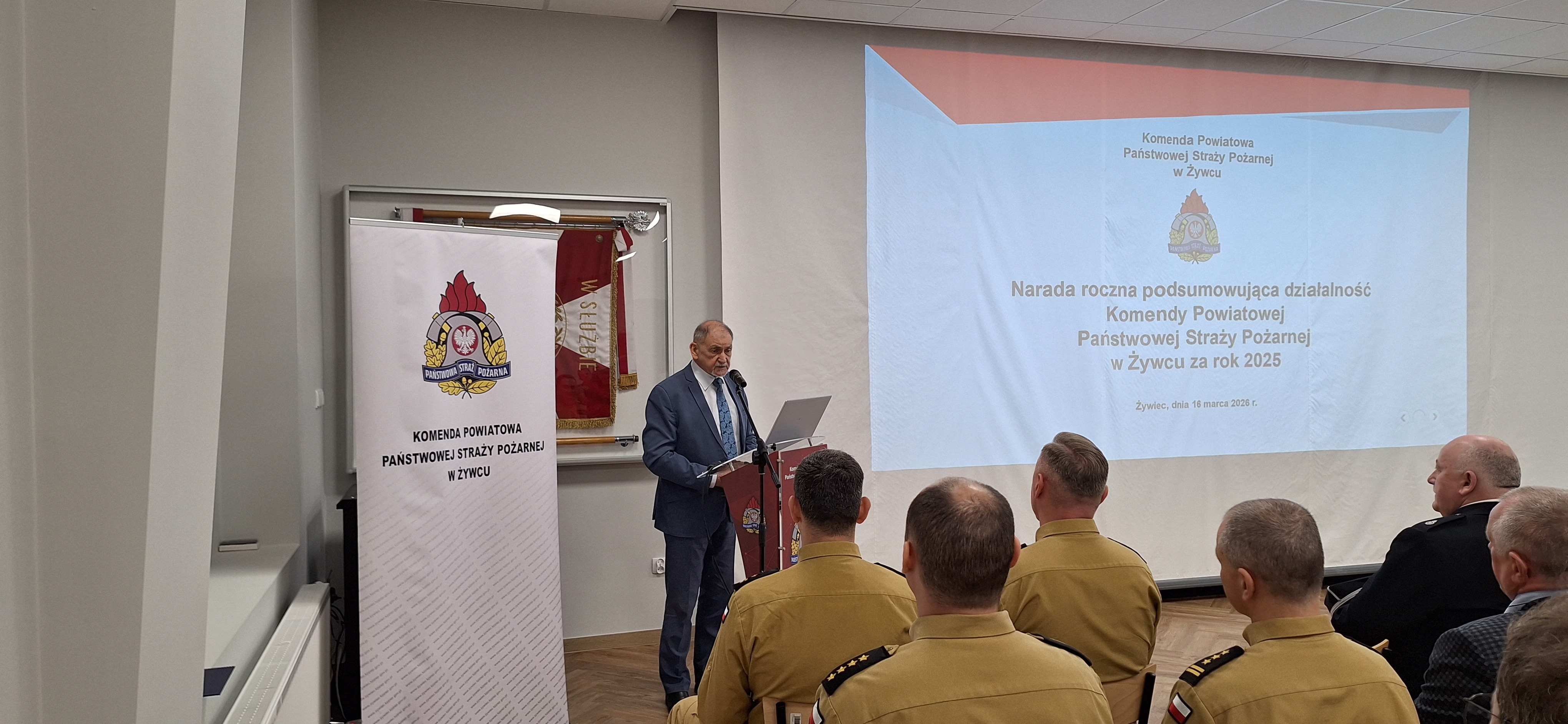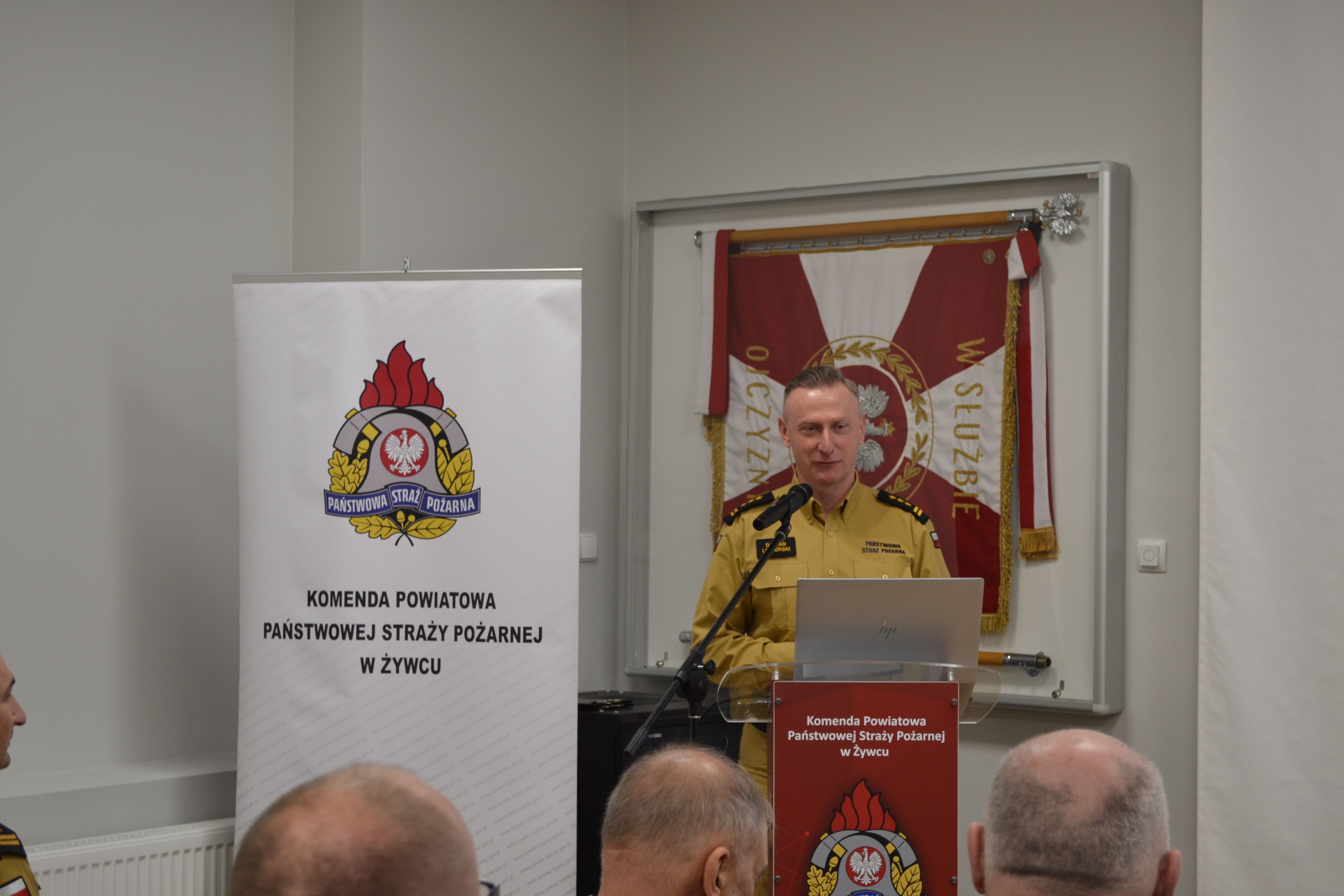 Podczas narady Komendant Powiatowy PSP w Żywcu mł. bryg. Jarosław Polak przedstawił szczegółowe podsumowanie działań podejmowanych przez strażaków w minionym roku. W swoim wystąpieniu odniósł się do liczby oraz charakteru działań ratowniczo-gaśniczych, w których uczestniczyli strażacy PSP i druhowie z jednostek OSP. Podkreślił zaangażowanie funkcjonariuszy w działania związane z pożarami, miejscowymi zagrożeniami oraz zdarzeniami drogowymi.