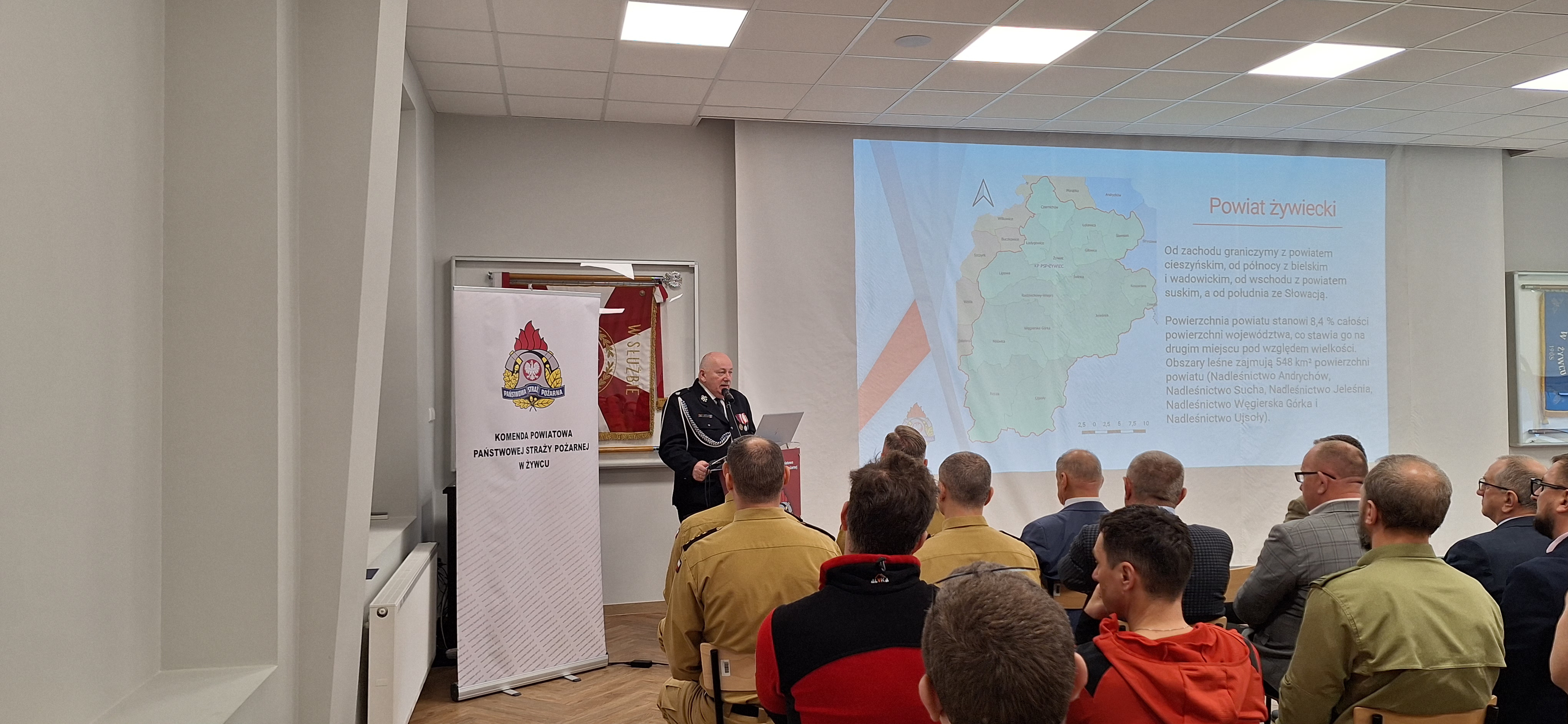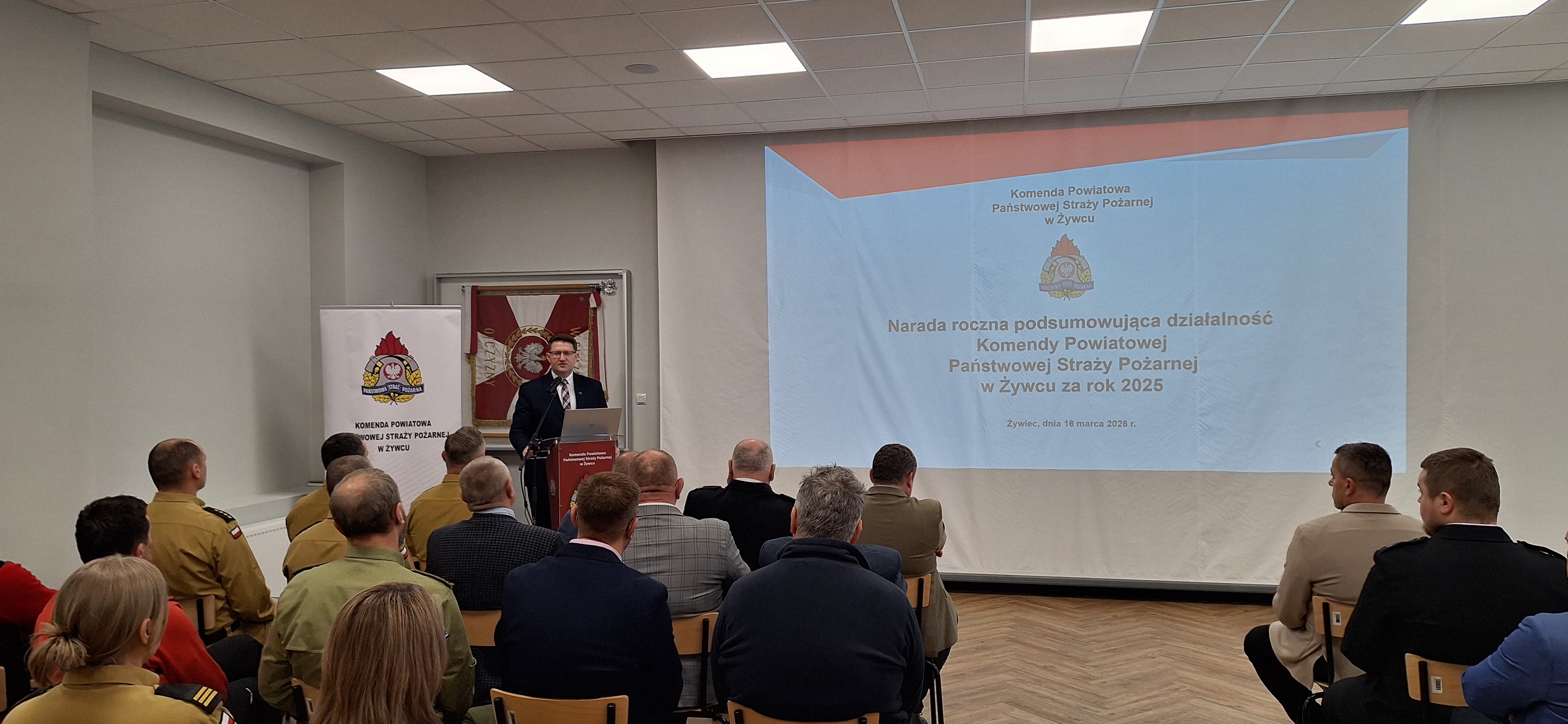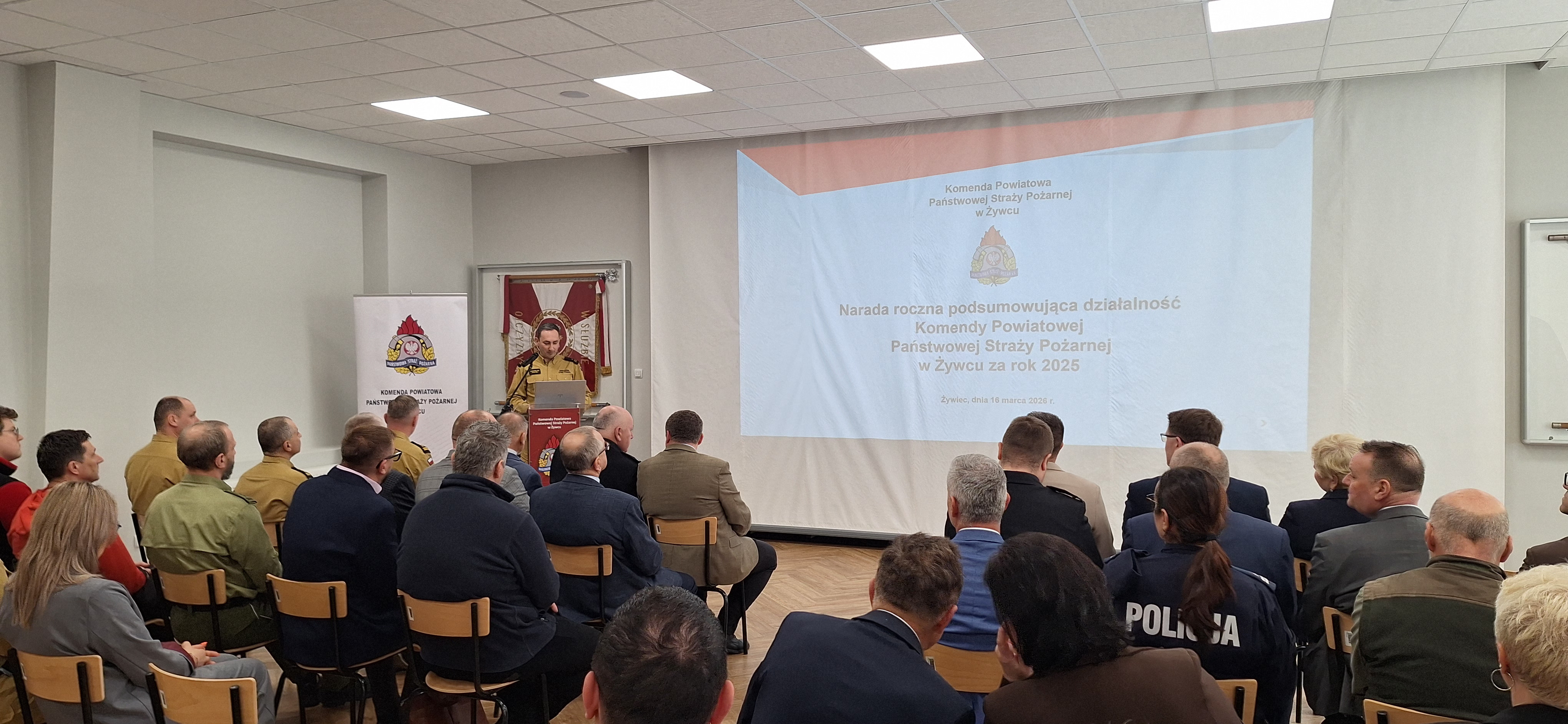 Podczas narady Komendant Powiatowy PSP w Żywcu mł. bryg. Jarosław Polak przedstawił szczegółowe podsumowanie działań podejmowanych przez strażaków w minionym roku. W swoim wystąpieniu odniósł się do liczby oraz charakteru działań ratowniczo-gaśniczych, w których uczestniczyli strażacy PSP i druhowie z jednostek OSP. Podkreślił zaangażowanie funkcjonariuszy w działania związane z pożarami, miejscowymi zagrożeniami oraz zdarzeniami drogowymi.