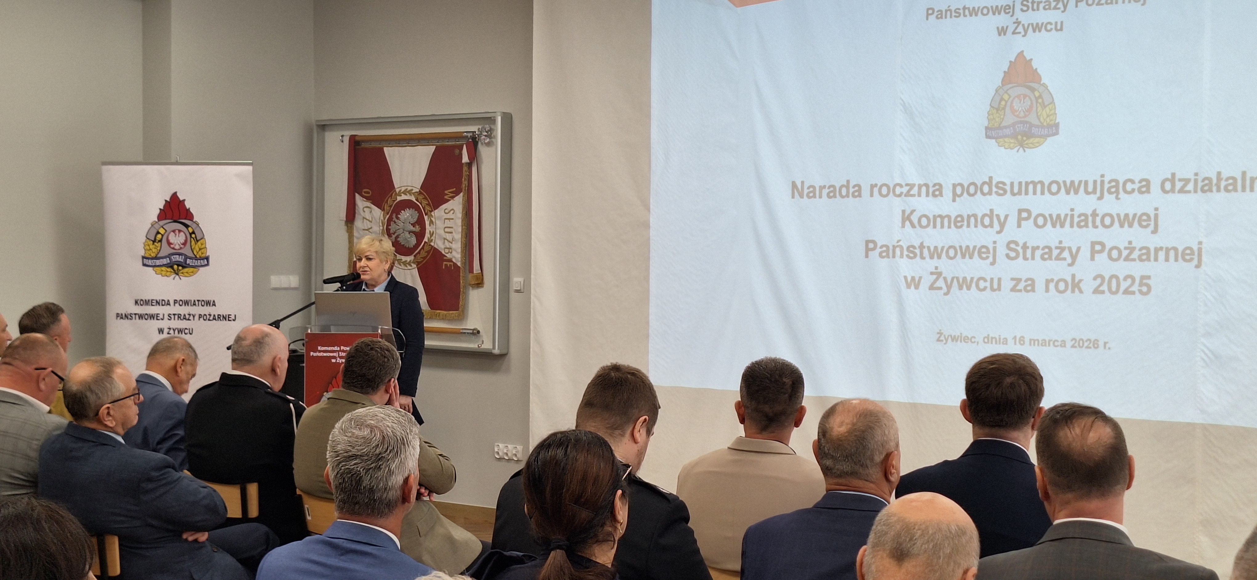 Dziś w Komendzie Powiatowej Państwowej Straży Pożarnej w Żywcu odbyła się narada roczna podsumowująca działalność jednostki w 2025 roku. W spotkaniu uczestniczyli m.in. Śląski Komendant Wojewódzki PSP st. bryg. Damian Legierski, parlamentarzyści – Pani Poseł RP Małgorzata Pępek oraz Pan Senator RP Andrzej Kalata – a także Starosta Powiatu Żywieckiego Pan Adrian Midor, radni powiatowi oraz wójtowie i przedstawiciele samorządów gmin powiatu żywieckiego.