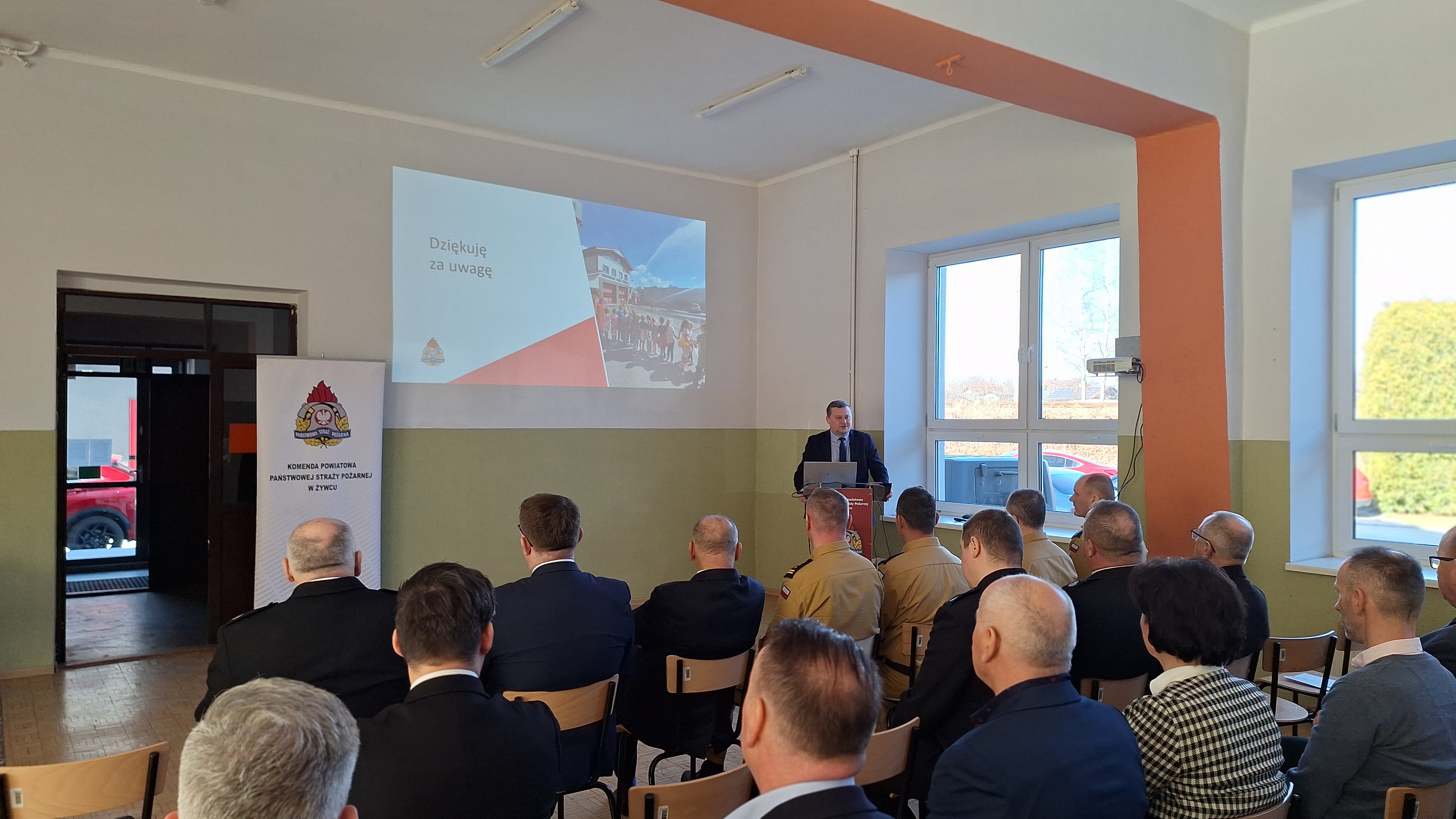 Podczas narady Komendant Powiatowy PSP w Żywcu mł. bryg. Jarosław Polak przedstawił charakterystykę jednostek ochrony przeciwpożarowej w powiecie żywieckim oraz szczegółowo omówił działania Komendy Powiatowej Państwowej Straży Pożarnej w Żywcu realizowane w 2024 roku podejmowane w zakresie działań ratowniczo-gaśniczych, spraw operacyjno-szkoleniowych, kontrolno-rozpoznawczych oraz na rzecz prewencji społecznej. Następnie Komendant Powiatowy PSP w Żywcu podziękował p.o. Śląskiego Komendanta Wojewódzkiego PSP st. bryg. Damianowi Legierskiemu oraz Panu Staroście Powiatowemu Adrianowi Midorowi za okazane wsparcie oraz pomoc w realizacji wszelkich przedsięwzięć. Komendant Powiatowy PSP w Żywcu skierował również podziękowania za współpracę przedstawicielom innych służb i instytucji.