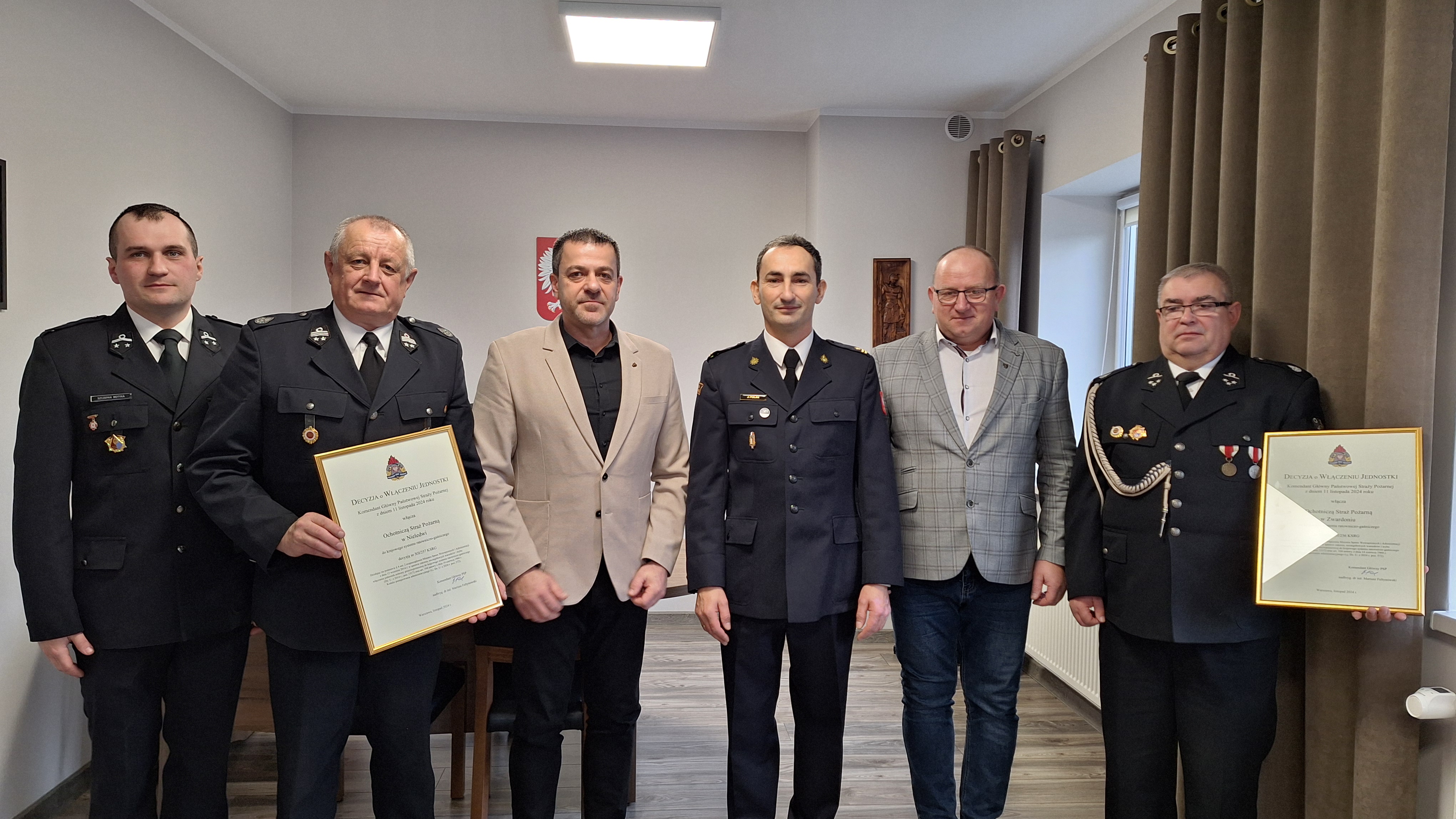 Decyzję o włączeniu jednostek OSP do KSRG Komendant Powiatowy PSP w Żywcu mł. bryg. Jarosław Polak wręczył Krzysztofowi Kamińskiemu - Wójtowi Gminy Milówka, Prezesowi OSP Nieledwia dh. Markowi Tetłakowi, Naczelnikowi OSP Nieledwia dh. Szczepanowi Motyce oraz Dariuszowi Płoskonce - Wójtowi Gminy Rajcza i Naczelnikowi OSP Zwardoń dh. Janowi Jachowiczowi.