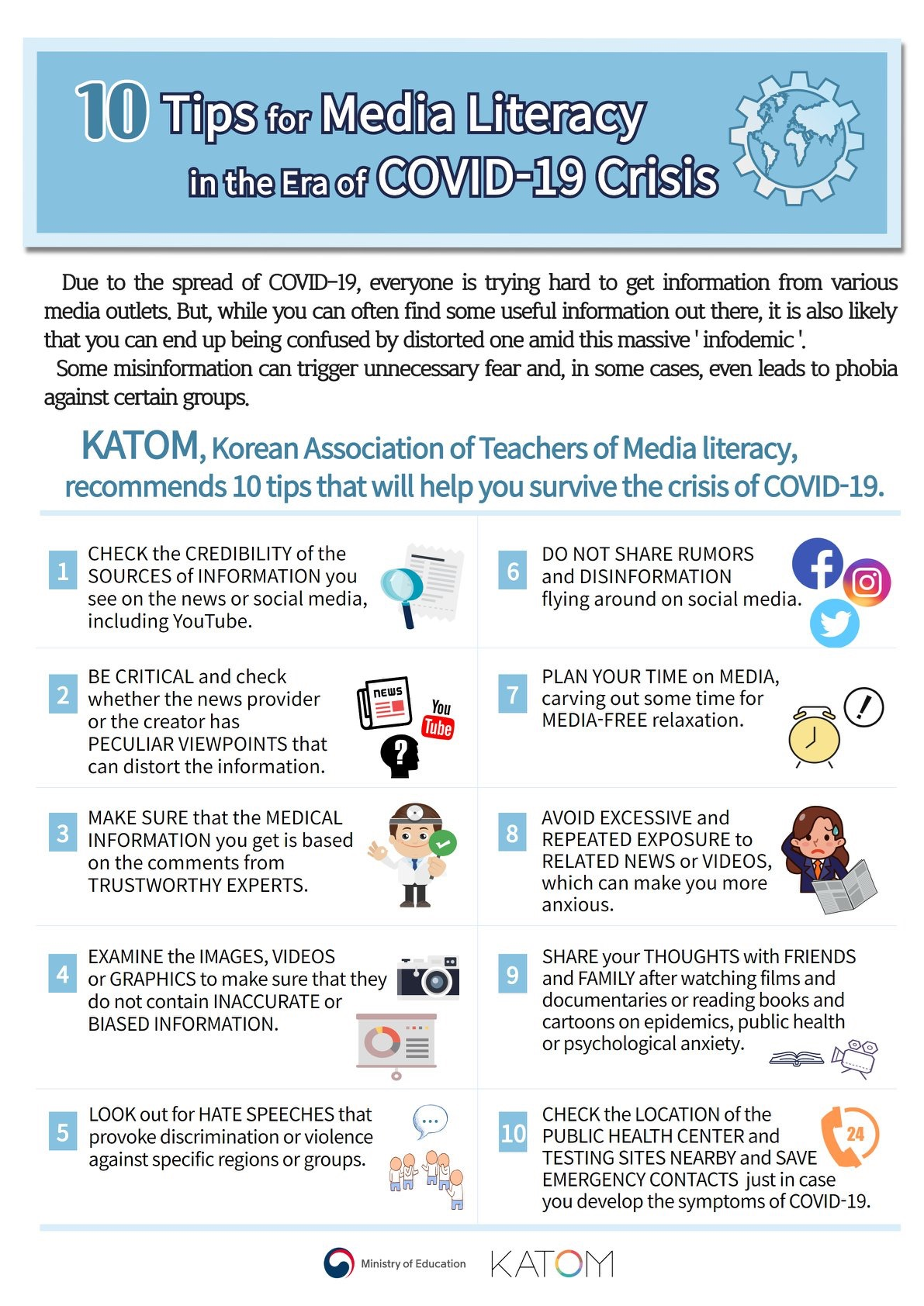 Korzystając z pozaurzędowych źródeł informacji w sprawie koronawirusa, pomocne mogą okazać się zasady opracowane przez Stowarzyszenie Nauczycieli Edukacji Medialnej (KATOM) i Ministerstwo Edukacji z Korei Południowej: