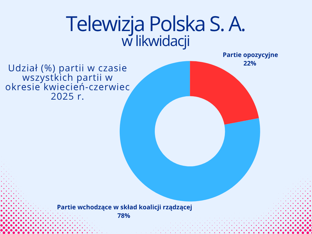 Telewizja Polska S.A. w likwidacji, w okresie od kwietnia do czerwca 2025 roku, poświęciła 214 godzin i 42 minuty (czyli 78%) partiom tworzącym koalicję rządzącą, natomiast 60 godzin i 12 minut (czyli 22%) – ugrupowaniom opozycyjnym. Łączny czas poświęcony partiom politycznym w programach TVP w likwidacji wyniósł 274 godziny i 54 minuty.