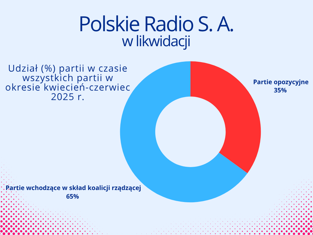 Polskie Radio S.A. w likwidacji, w okresie od kwietnia do czerwca 2025 roku, poświęciło 56 godzin i 55 minut (65%) partiom koalicyjnym, natomiast 31 godzin i 11 minut (35%) – partiom opozycyjnym. Łączny czas antenowy przeznaczony na prezentację partii politycznych w programach Polskiego Radia w likwidacji wyniósł 88 godzin i 6 minut.