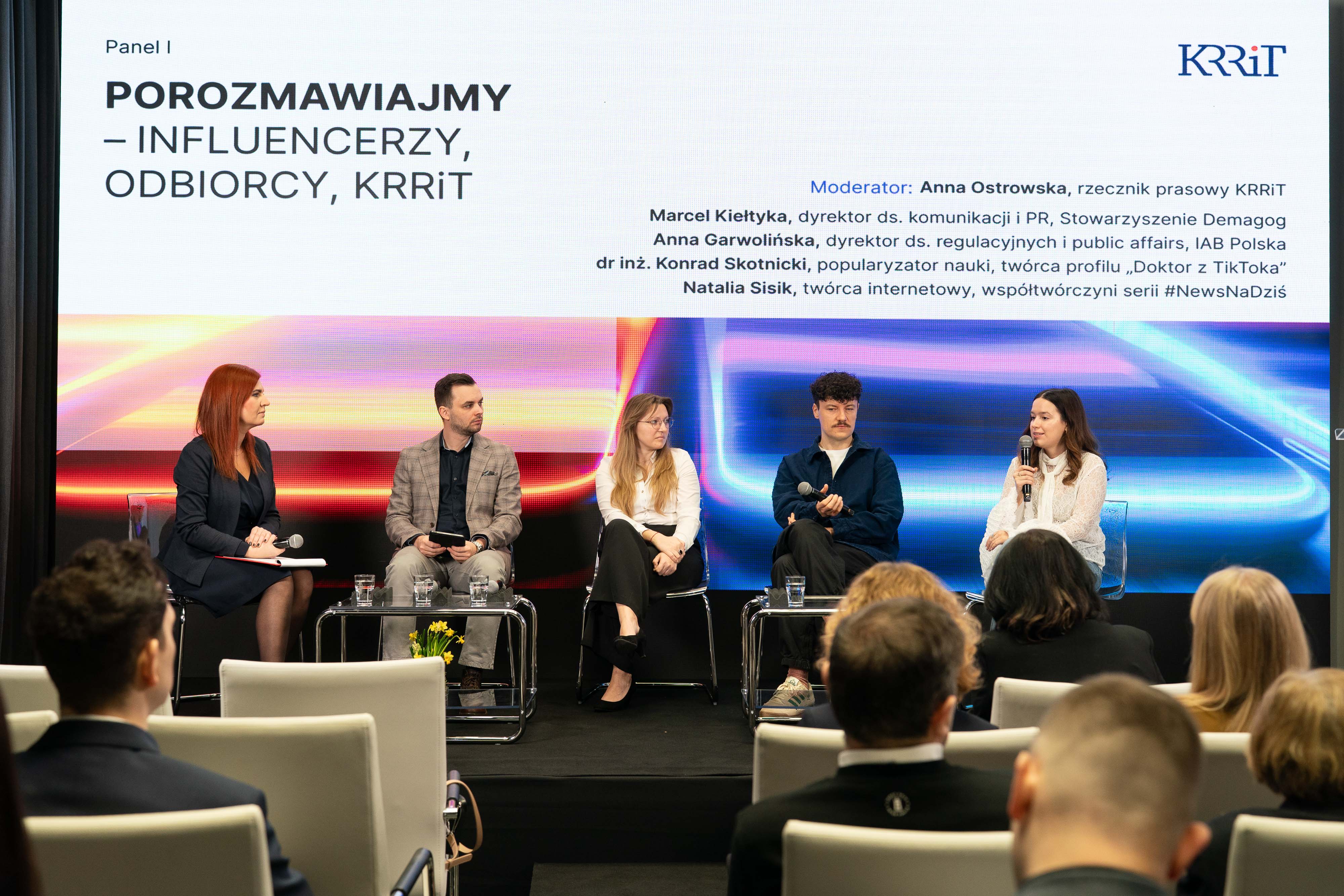 Konferencja została podzielona na dwa panele tematyczne. Pierwszy panel, „Porozmawiajmy – influencerzy, odbiorcy, KRRiT”, prowadzony przez Annę Ostrowską, rzecznika prasowego KRRiT zgromadził ekspertów reprezentujących branżę internetową, twórców oraz organizacje zajmujące się fact-checkingiem i edukacją medialną.
