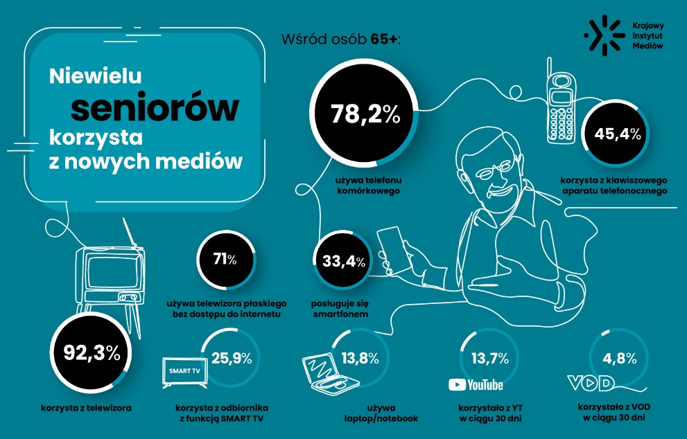"Dane dotyczące korzystania przez seniorów z urządzeń do odbioru mediów dowodzą, że poziom użytkowania nowoczesnych sprzętów jest niski. Może to skutkować obniżeniem poziomu życia związanym z ograniczeniem dostępu do kultury, usług itp. Umiejętność korzystania z nowych mediów coraz bardziej determinuje funkcjonowanie w zdigitalizowanym społeczeństwie. Osoby starsze często nie potrafią się zaadaptować i doświadczają wykluczenia cyfrowego. Przyczyną może być utrudniony dostęp do najnowocześniejszych urządzeń i technologii z powodów ekonomicznych". – mówi Maja Kurzelewska, Dyrektor Departamentu Badan i Analiz KIM.