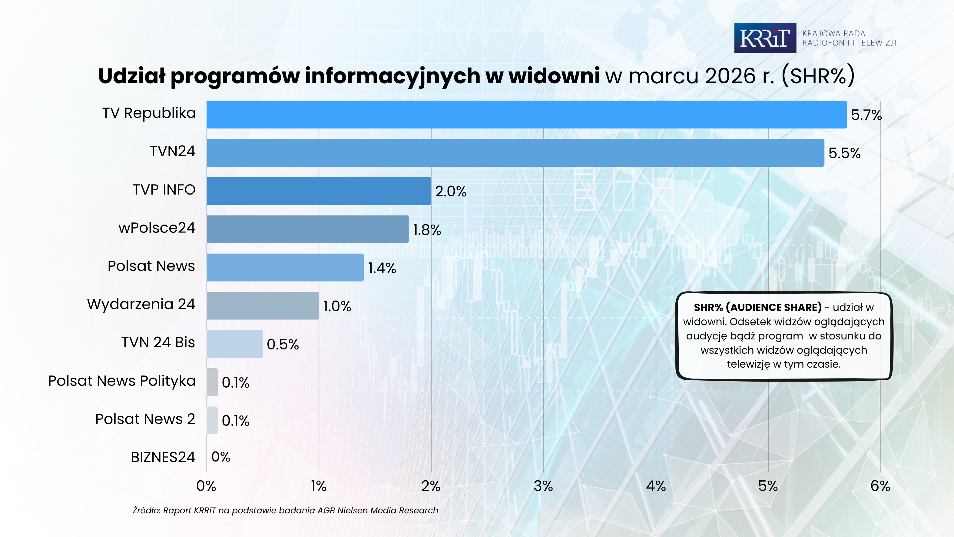 Dane zaprezentowane w raporcie zostały opracowane na podstawie wyników badania AGB Nielsen Media Research. Obejmują one zestawienie 20 programów telewizyjnych o największej liczbie widzów, ranking programów informacyjnych oraz 20 audycji informacyjnych o najwyższej oglądalności w marcu 2026 roku. W przypadku audycji cyklicznych uwzględniono wydanie o największej oglądalności.