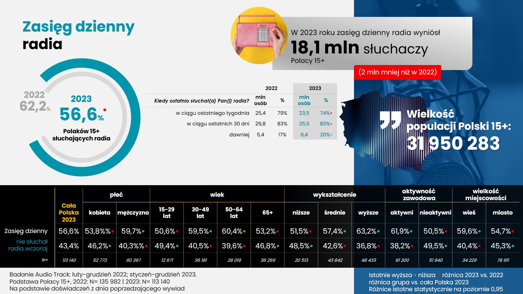 W 2023 r., w kategorii 15+, radio gromadziło średnio 18,1 mln słuchaczy dziennie (56,6% ogółu mieszkańców Polski w tej kategorii) vs. 20,1 mln (62,2%) w 2022 roku.