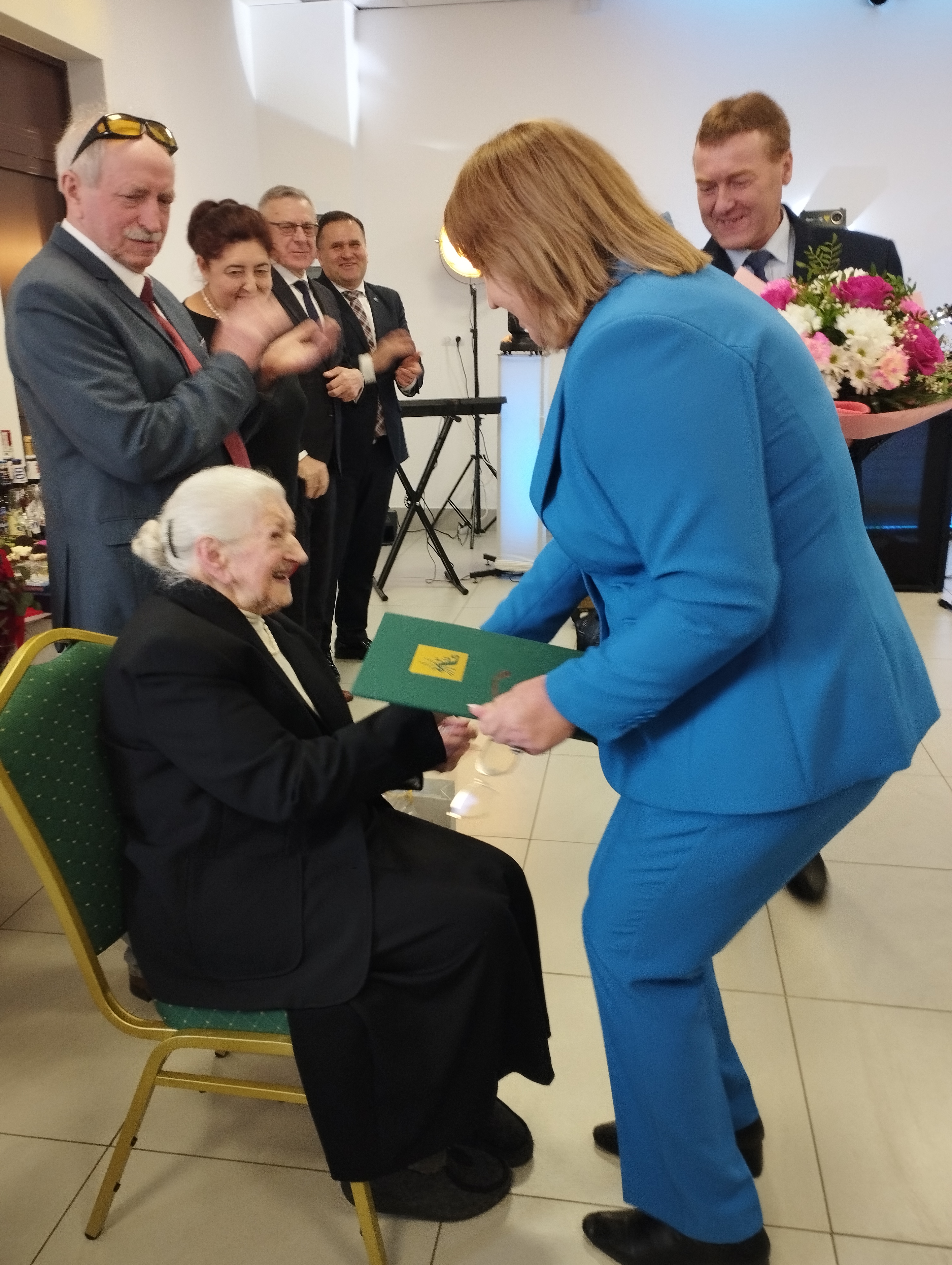 W tym wyjątkowym dniu Jubilatkę odwiedzili Wójt Gminy Pokrzywnica, Adam Dariusz Rachuba oraz Kierownik Placówki Terenowej KRUS w Ciechanowie, Jacek Biliński i Kierownik Placówki Terenowej KRUS w Pułtusku Anna Łojewska, którzy wręczyli Jubilatce list gratulacyjny Prezesa KRUS ,decyzję o przyznaniu świadczenia honorowego z tytułu ukończenia 100 lat i bukiet kwiatów.
