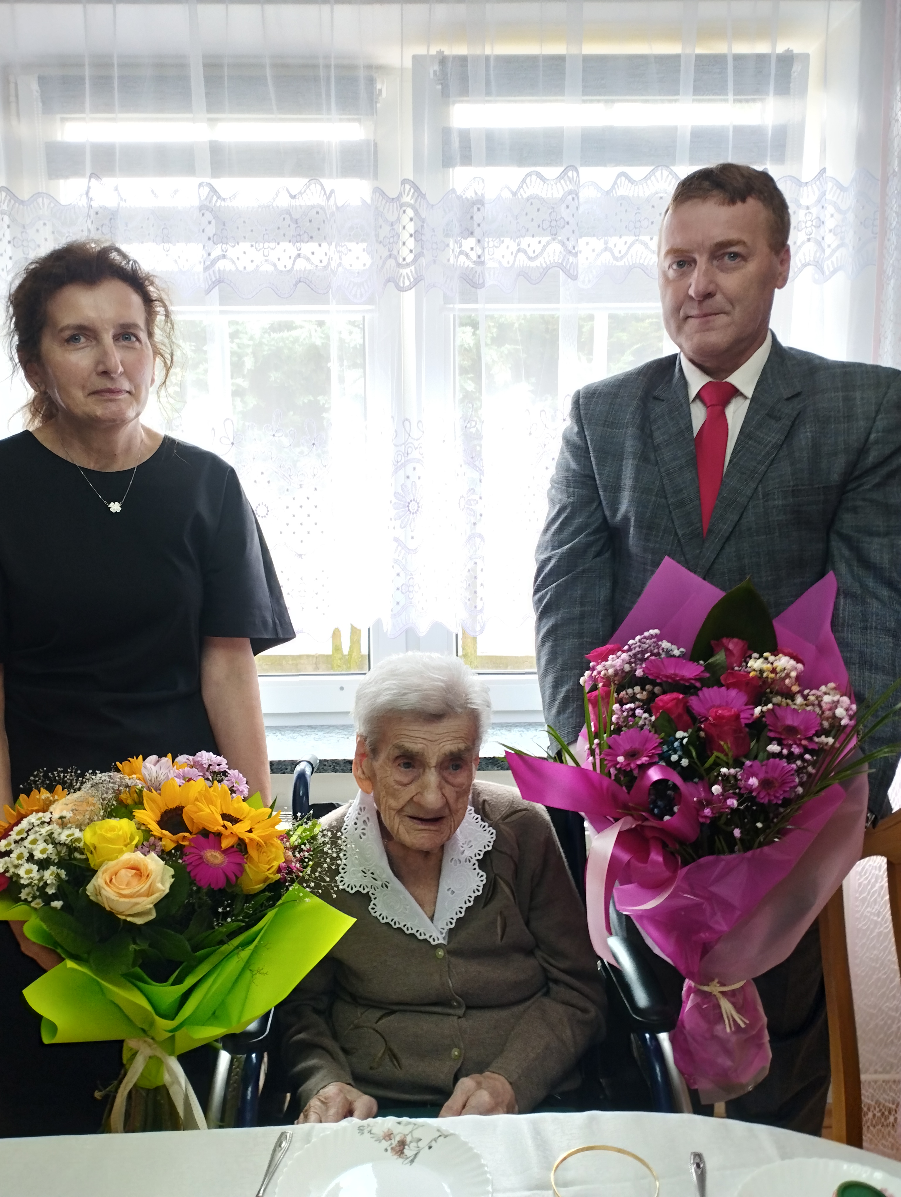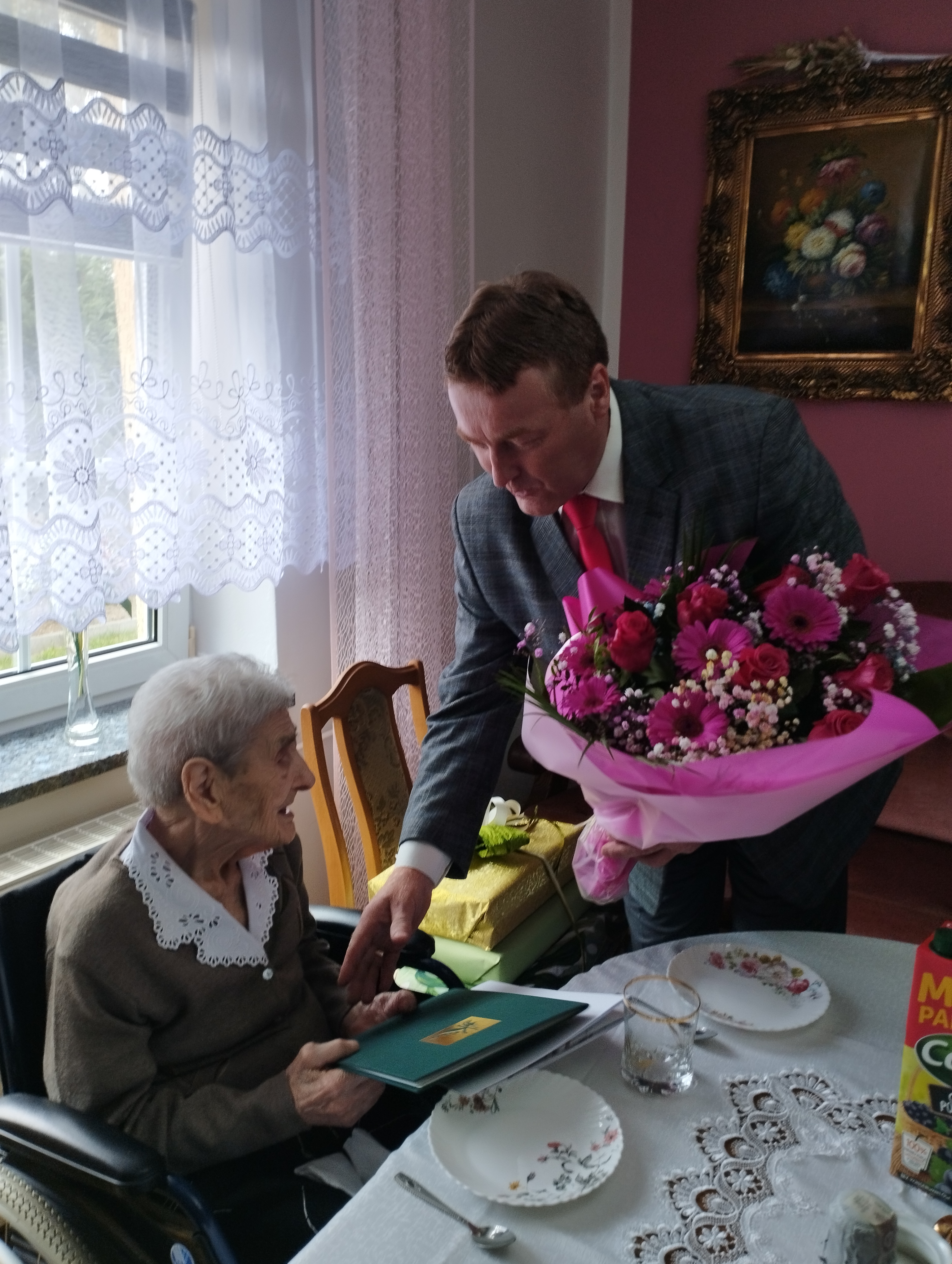 W tym wyjątkowym dniu Jubilatkę odwiedzili Wójt Gminy Kuczbork-Osada Jacek Grzybicki wraz z Kierowniczką Urzędu Stanu Cywilnego Agnieszką Kowalską oraz Kierownik Placówki Terenowej KRUS w Ciechanowie Jacek Biliński i Zastępca Kierownika Wydziału Świadczeń Placówki Terenowej KRUS w Ciechanowie Joanna Ankiewicz-Kołakowska, którzy wręczyli Jubilatce bukiet kwiatów oraz list gratulacyjny Prezesa KRUS ,decyzję o przyznaniu świadczenia honorowego z tytułu ukończenia 100 lat.