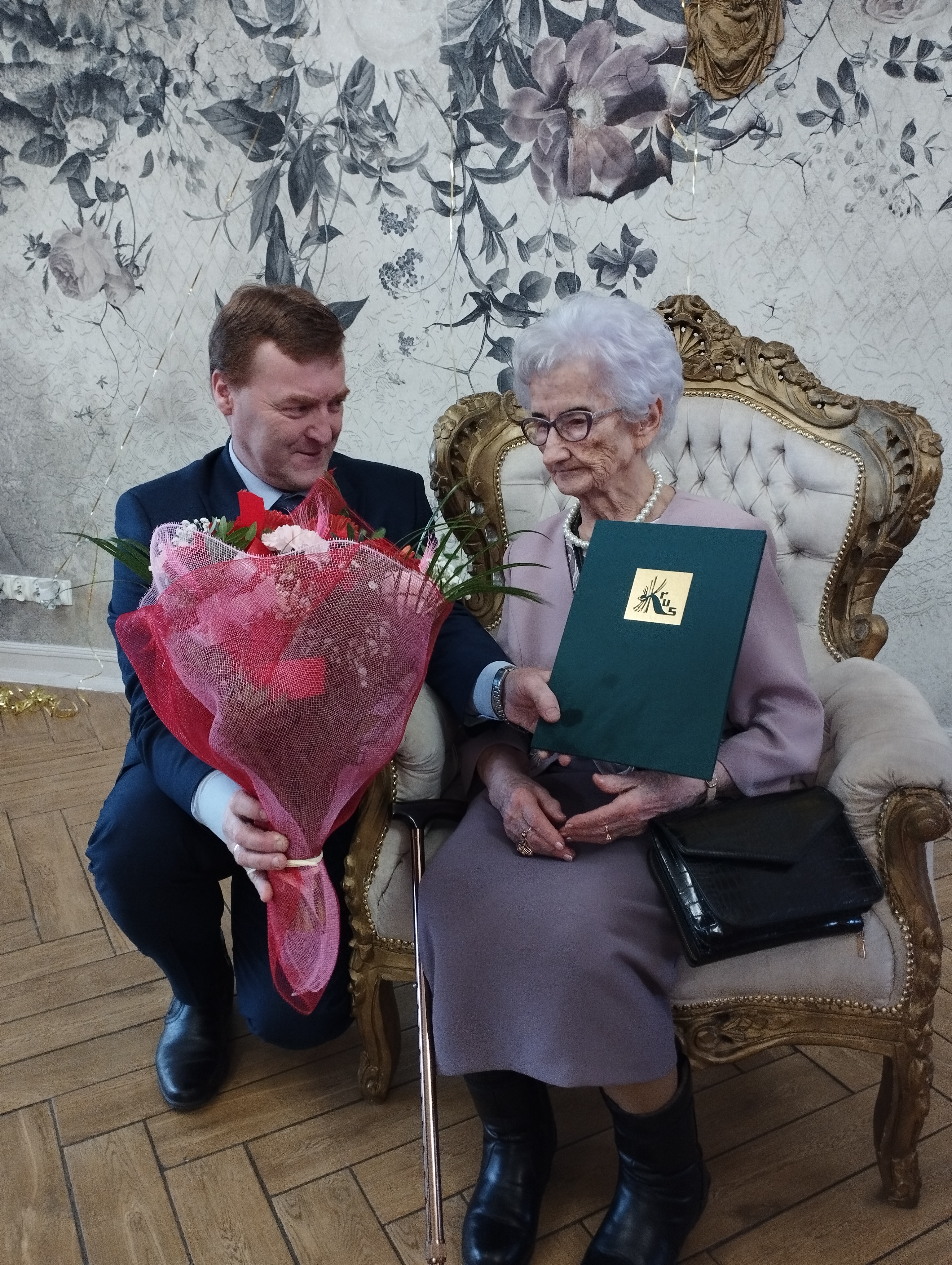 W tym wyjątkowym dniu Jubilatkę odwiedził Kierownik Placówki Terenowej KRUS w Ciechanowie Jacek Biliński, który wręczył jej bukiet kwiatów oraz list gratulacyjny Prezesa KRUS z decyzją o przyznaniu świadczenia honorowego z tytułu ukończenia 100 lat.