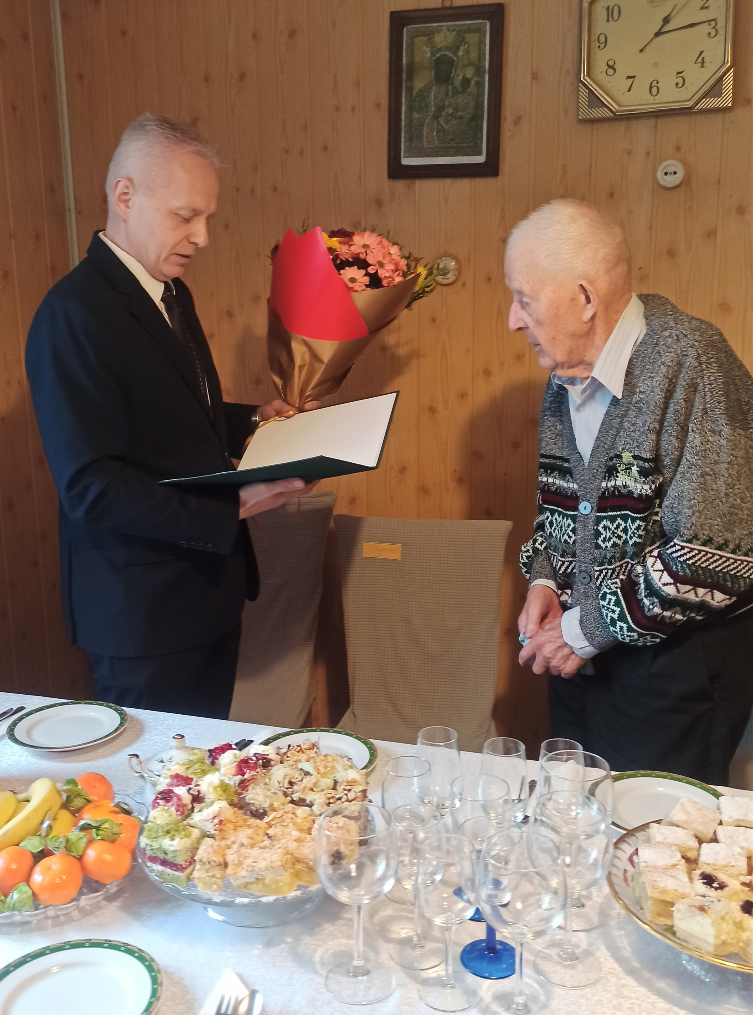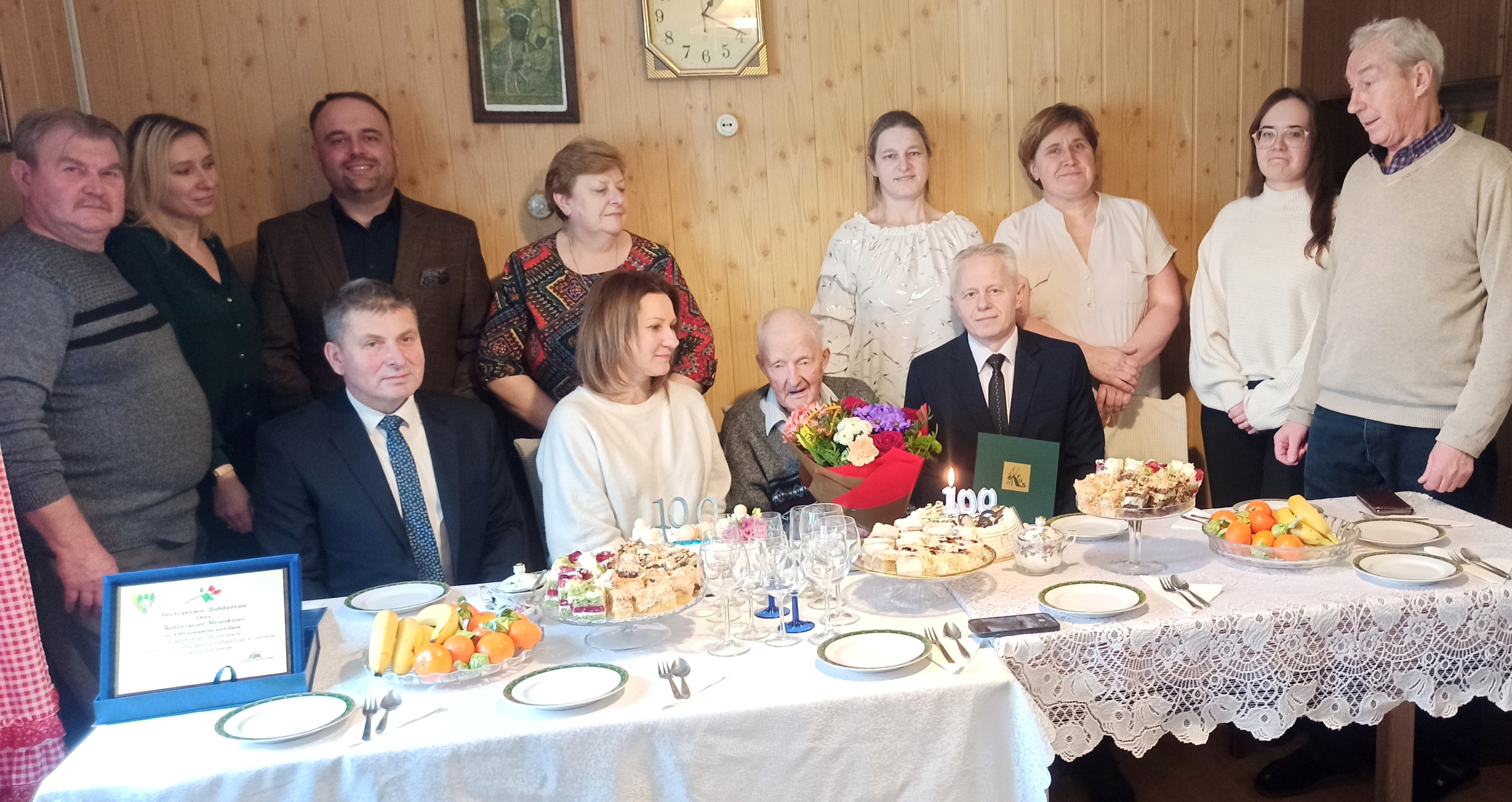 Szacownego Jubilata odwiedził Kierownik Placówki Terenowej Kasy Rolniczego Ubezpieczenia Społecznego w Węgrowie Jarosław Gago, Wójt Gminy Stoczek Zbigniew Kłusek, Sekretarz Gminy Renata Flak, Przewodniczący Rady Gminy Piotr Wszołczyk-Lipka, Kierownik Urzędu Stanu Cywilnego Anna Paśnik, Kierownik Delegatury w Siedlcach Mazowieckiego Urzędu Wojewódzkiego Alicja Cichoń oraz członkowie rodziny i sąsiedzi.