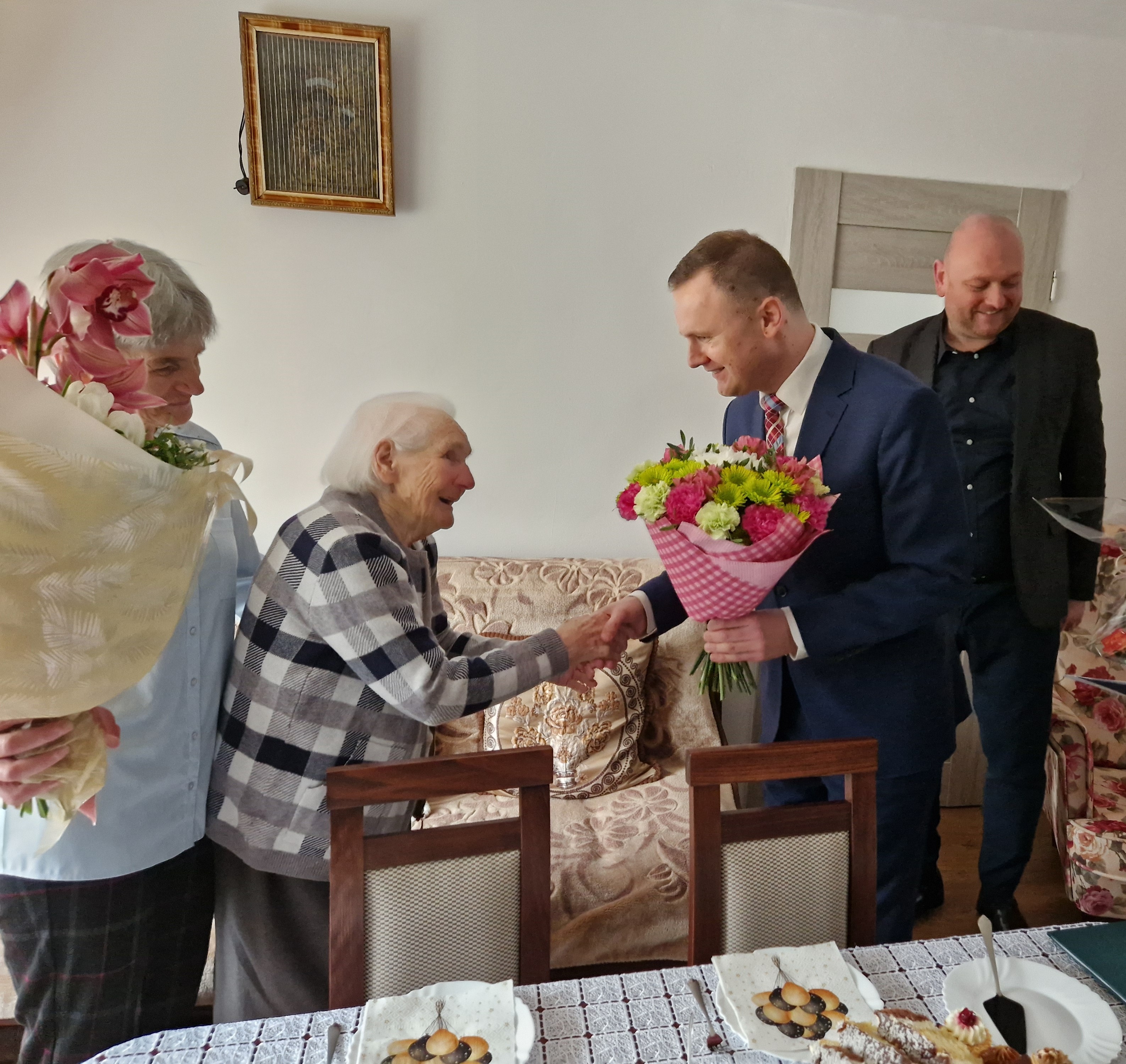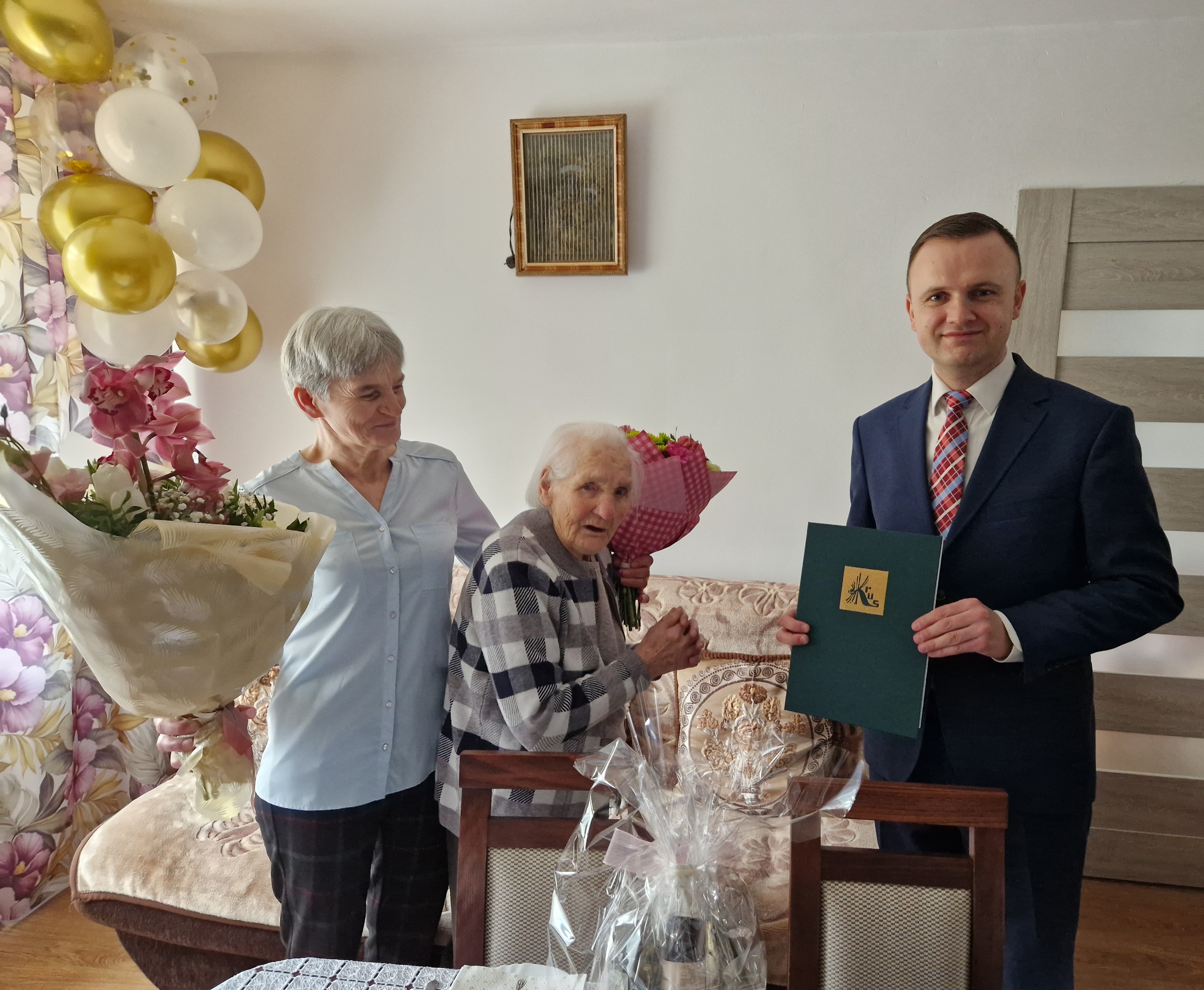 W tym uroczystym dniu szanowną Jubilatkę odwiedził i złożył najserdeczniejsze życzenia: Kierownik PT KRUS w Mławie Michał Pol, który wręczył list gratulacyjny i bukiet pięknych kwiatów. Z życzeniami do Jubilatki przybył również Wójt Gminy Radzanów Przemysław Pakuszewski.