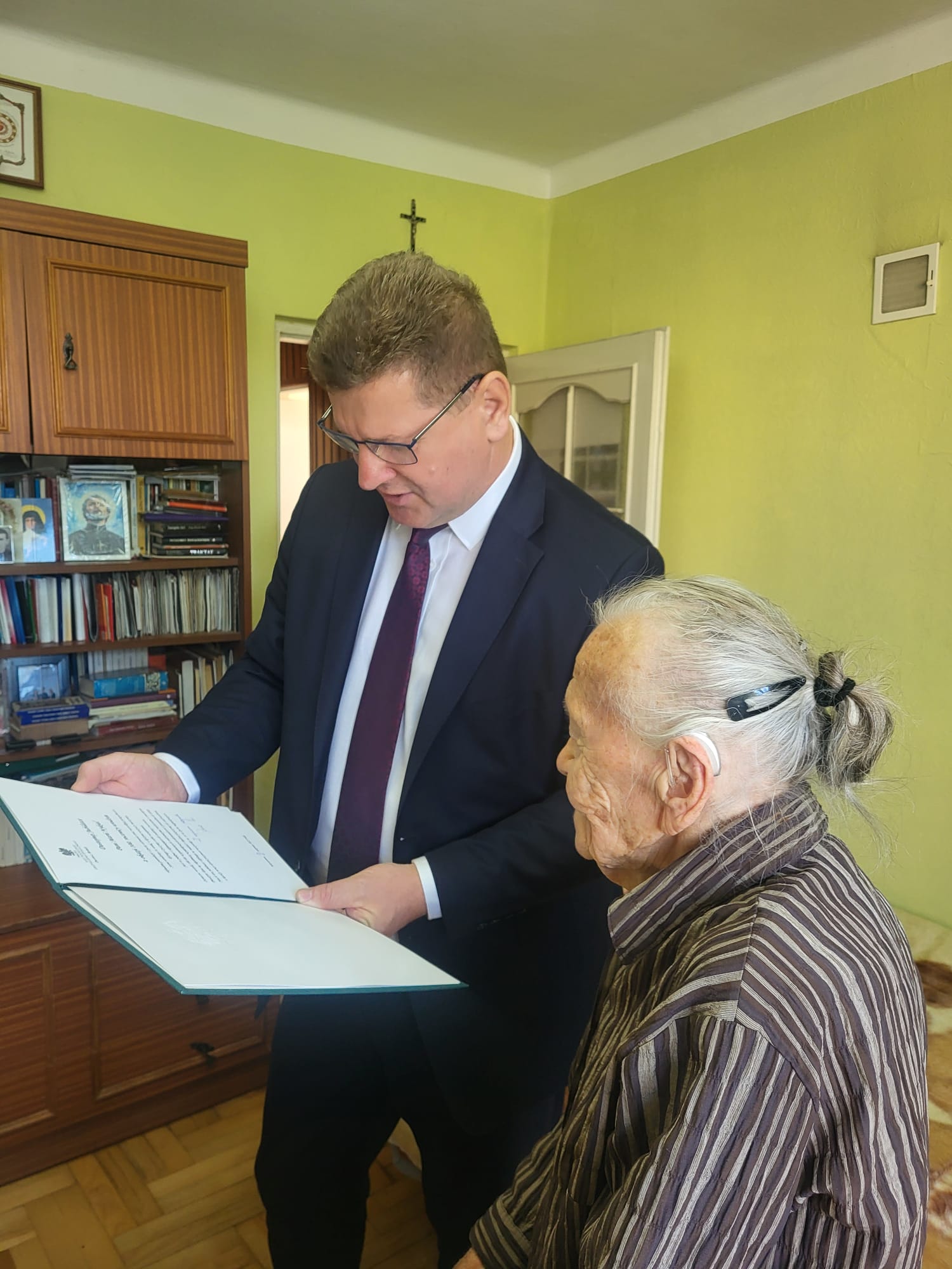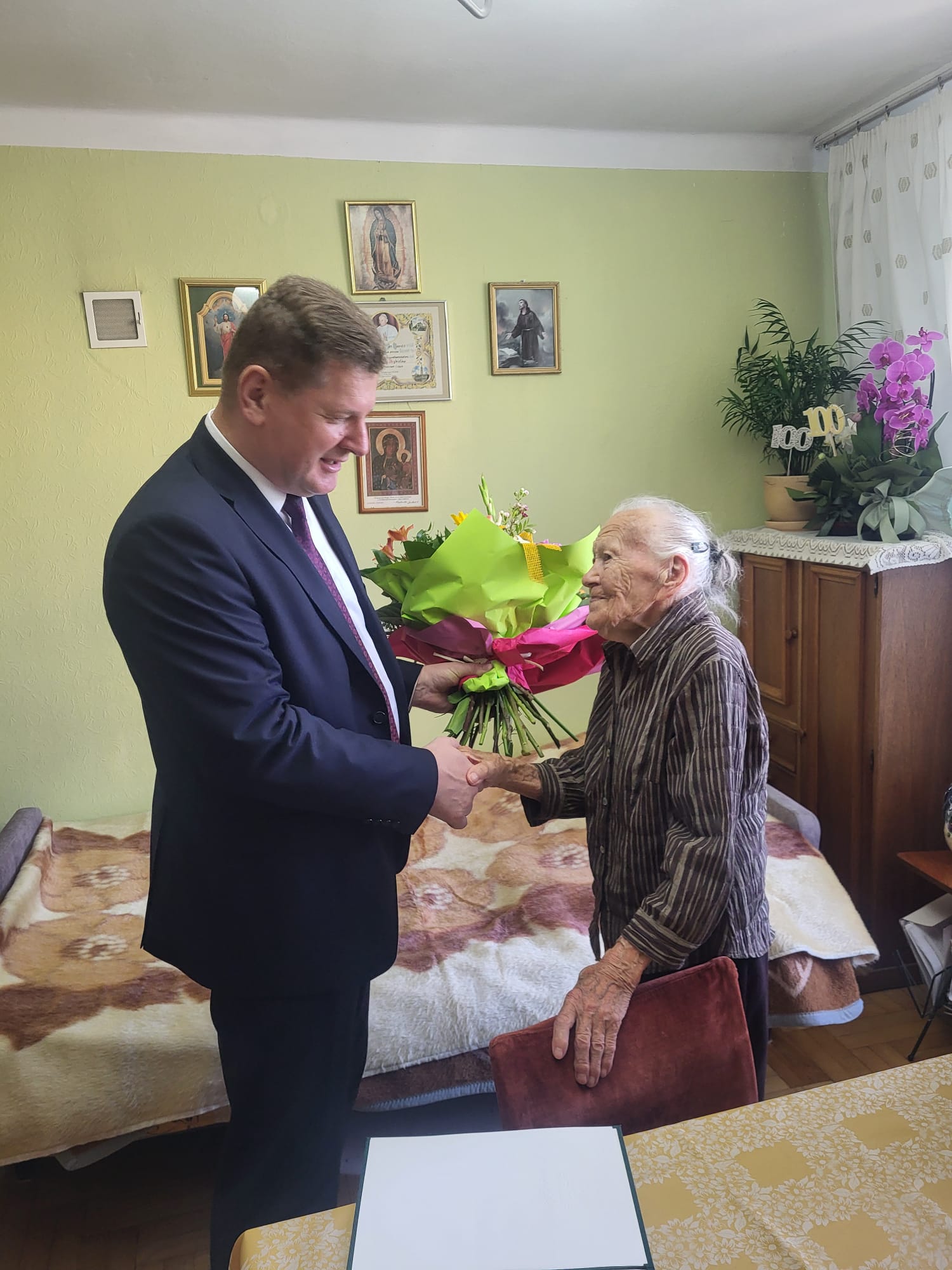 Tak wyjątkowa rocznica urodzin była doskonałą okazją do złożenia Szacownej Jubilatce wizyty, podczas której Kierownik PT KRUS w Jarosławiu Bogusław Gilarski wraz z Małgorzatą Pyrą mieli zaszczyt złożyć na ręce Pani Marii bukiet kwiatów oraz list gratulacyjny Prezesa KRUS Dariusza Rohde.