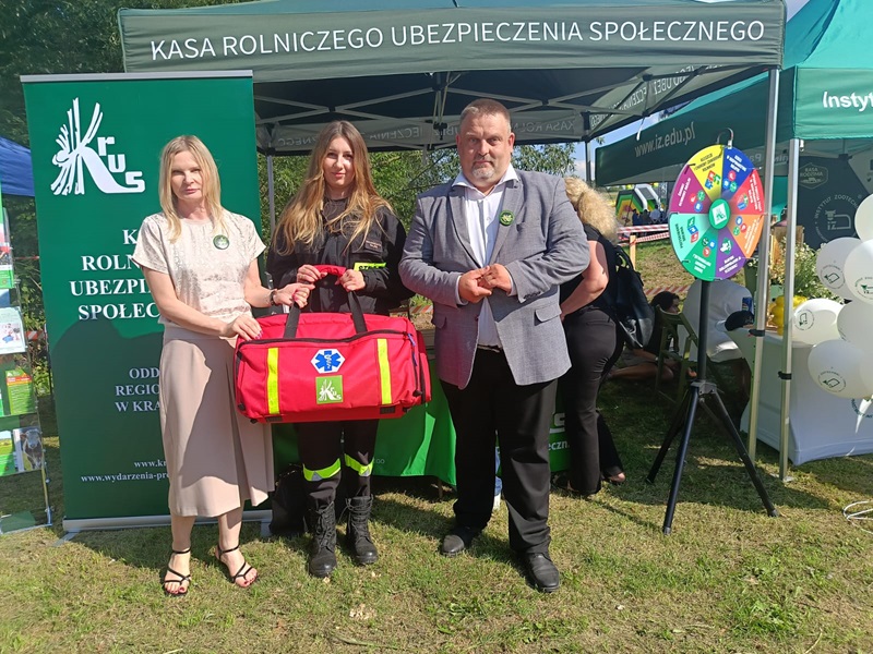 Dyrektor Oddziału Regionalnego KRUS w Krakowie Iwona Szablińska, Przedstawiciel Ochotniczej Straży Pożarnej Małgorzata Wajda, Kierownik Placówki Terenowej KRUS w Proszowicach Andrzej Król przy stoisku informacyjno-prewencyjnym