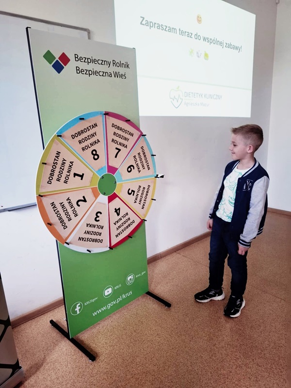 W zabawie z „krusowskim” Kołem Fortuny dzieci odpowiadały na quiz wiedzy o zdrowiu i bezpieczeństwie. Zajęcia praktyczne i pokaz udzielania pierwszej pomocy przygotowany przez uczniów szkoły i strażaków PSP Sanok zapoznały dzieci z zagrożeniami w gospodarstwie rolnym.