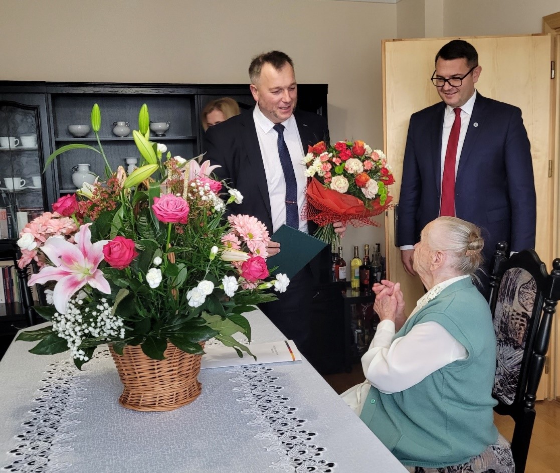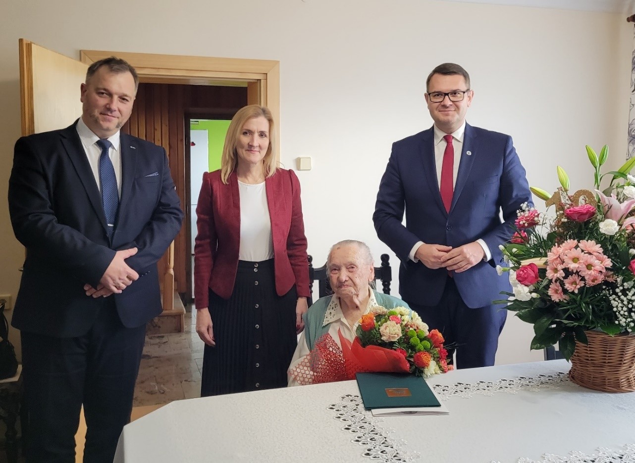 W związku z tą wyjątkową uroczystością Kierownik Placówki Terenowej KRUS w Myślenicach Marcin Misiek wręczył Jubilatce bukiet kwiatów, list gratulacyjny oraz życzenia od Prezesa Kasy Rolniczego Ubezpieczenia Społecznego Aleksandry Hadzik. W tym szczególnym dniu szanowną Jubilatkę odwiedził również Burmistrz Miasta i Gminy Myślenice Jarosław Szlachetka oraz Kierownik Urzędu Stanu Cywilnego w Myślenicach Agnieszka Hudaszek.