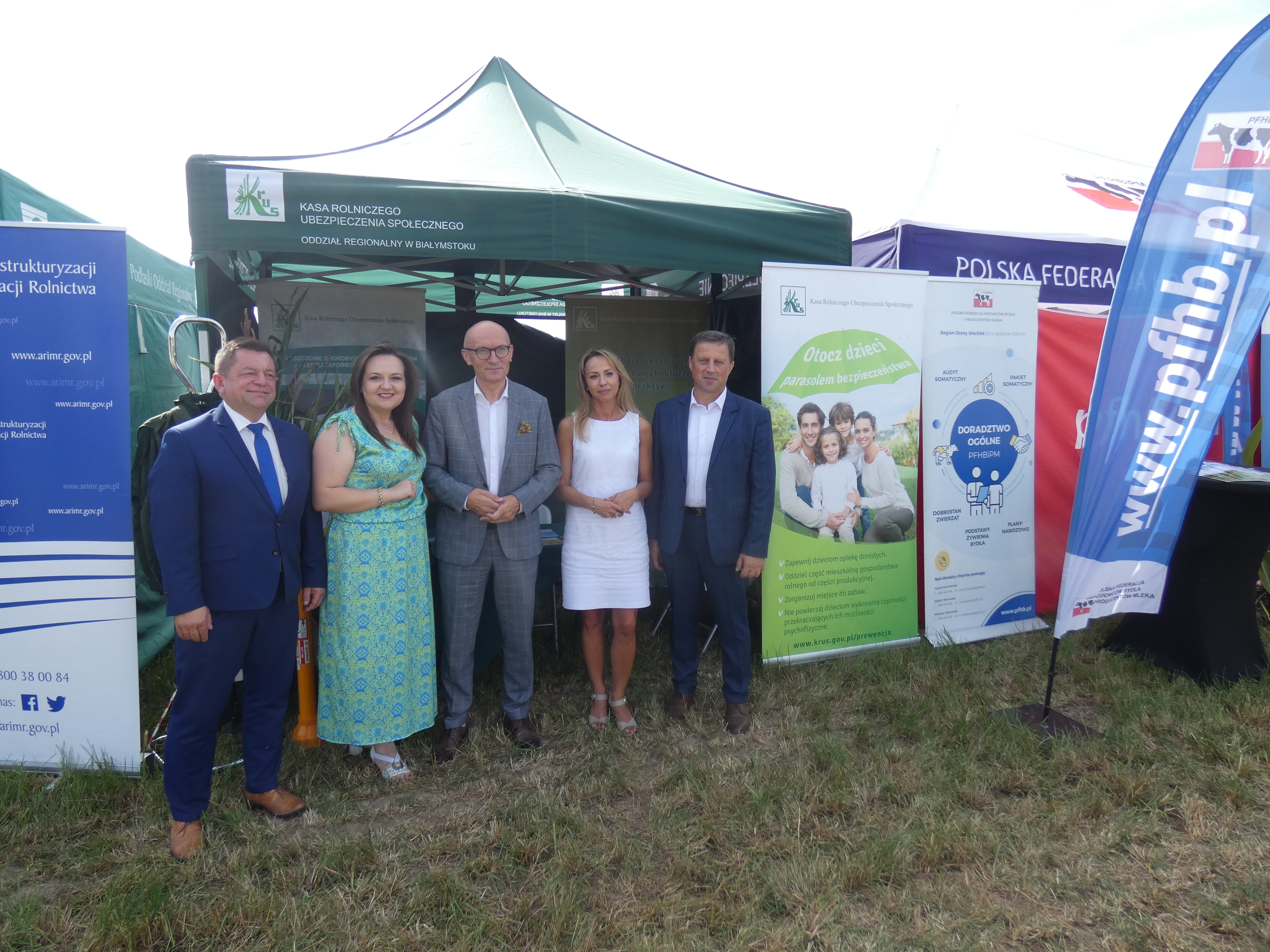 Kasę Rolniczego Ubezpieczenia Społecznego reprezentował Kierownik Placówki Terenowej w Wysokiem Mazowieckiem Krzysztof Czajkowski wraz z pracownikami ds. prewencji, którzy rozmawiali z odwiedzającymi stoisko rolnikami i domownikami na tematy dotyczące ubezpieczeń, świadczeń oraz prewencji i rehabilitacji leczniczej. Zwracali szczególną uwagę na zdarzenia wypadkowe związane z pracą na wysokości, w zagłębieniach i zbiornikach, z wykorzystaniem maszyn i urządzeń rolniczych oraz przy obsłudze zwierząt. W trakcie przedsięwzięcia zapraszano rolników i domowników do wzięcia udziału w pokazie wzorcowej odzieży roboczej oraz wymianie osłony wała odbioru mocy. Pracownicy Placówki Terenowej zorganizowali również konkurs pod hasłem „Bezpieczny rolnik, bezpieczna wieś”, który polegał na rozwiązaniu testu. Dla laureatów konkursu przygotowano nagrody rzeczowe. Uczestnikom dożynek oraz rolnikom odwiedzającym stoisko zostały przekazane broszury oraz materiały prewencyjne.