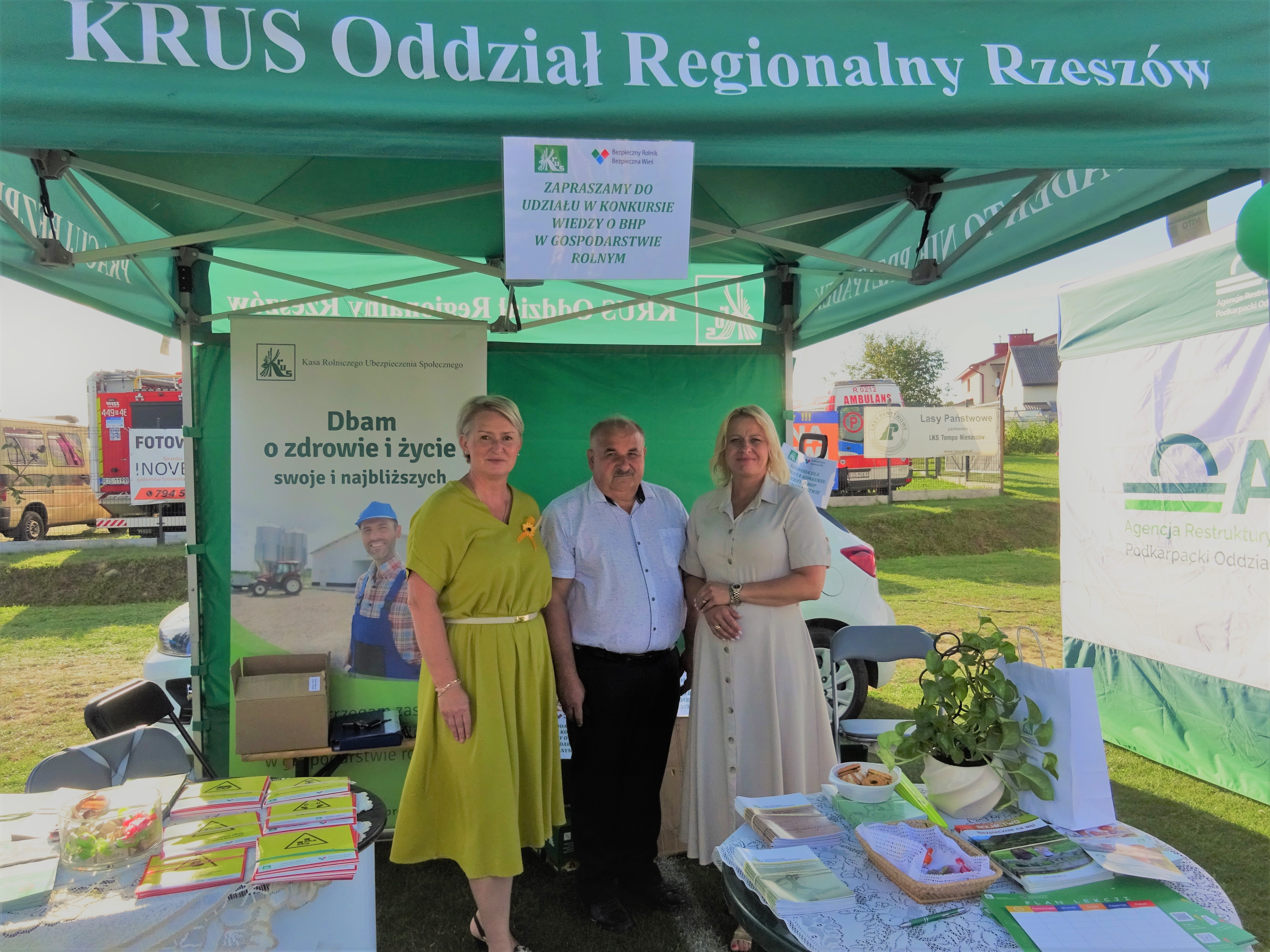 17 sierpnia 2025 roku na stadionie sportowym w Nienaszowie odbyły się Dożynki Powiatowe i Lato z Kulturą Powiatu Jasielskiego. Podczas wydarzenia Placówka Terenowa KRUS w Jaśle zorganizowała stoisko informacyjno-prewencyjne. Pracownicy obsługujący stoisko Kasy przekazywali informacje z zasad bezpiecznej pracy w gospodarstwie rolnym, z profilaktyką chorób odkleszczowych oraz z zagrożeniami występującymi podczas pracy i zabawy dzieci w gospodarstwie rolnym rodziców. Ponadto udzielali informacji na temat ustawowej działalności Kasy, a także prowadzonej nieodpłatnej rehabilitacji leczniczej w CRR KRUS. W ramach nowej kampanii prewencyjnej przebiegającej pod hasłem „Dobrostan Rolnika” popularyzowali wiedzę o zdrowiu oraz profilaktyce chorób cywilizacyjnych.