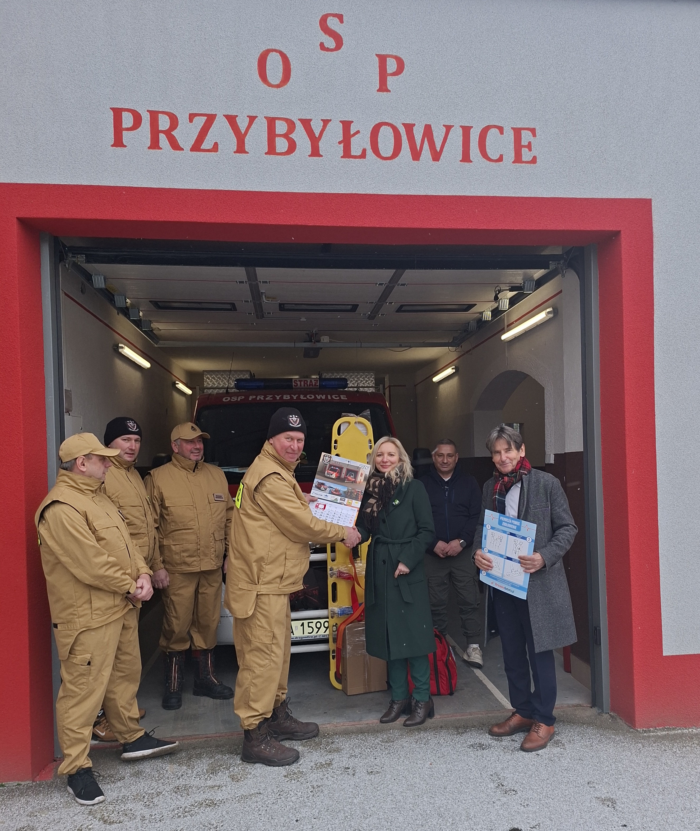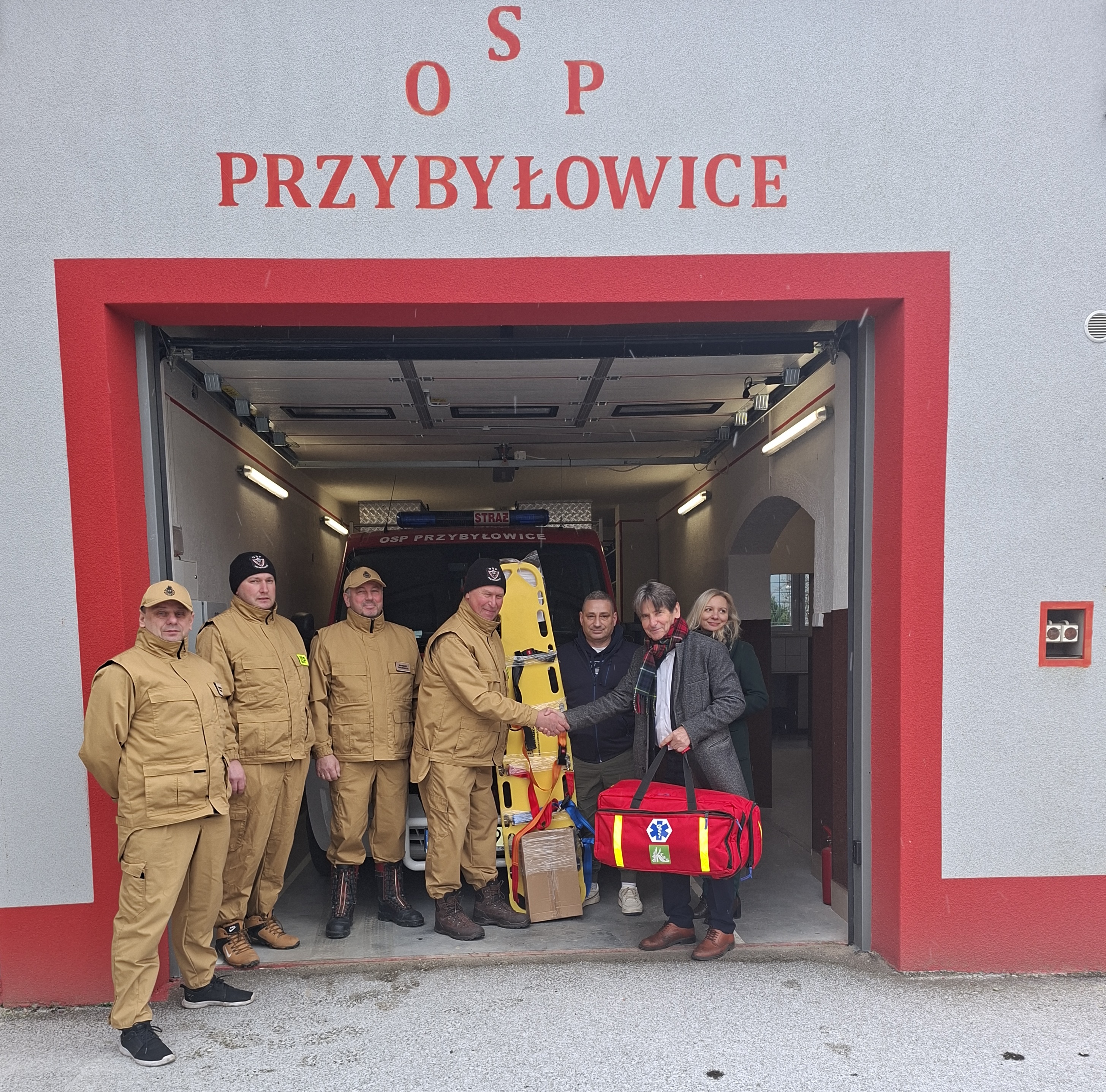31 grudnia 2025 r. w miejscowości Przybyłowice w gminie Męcinka w ramach obowiązującego porozumienia Prezesa Kasy Rolniczego Ubezpieczenia Społecznego i Prezesa Związku Ochotniczych Straży Pożarnej RP w sprawie wdrożenia ratownictwa przedlekarskiego na terenach wiejskich, Dyrektor Oddziału Regionalnego Kasy Rolniczego Ubezpieczenia Społecznego we Wrocławiu Jan Socha wręczył torbę medyczną z zestawem ratownictwa PSP R-1 Prezesowi Ochotniczej Straży Pożarnej w Przybyłowicach Zdzisławowi Dąbrowskiemu. W spotkaniu uczestniczyli również Kierownik PT KRUS w Legnicy Sylwia Kaczorowska, Pełnomocnik Marszałka ds. Aktywizacji Środowisk Lokalnych Radosław Zysnarski oraz druhowie OSP Przybyłowice.