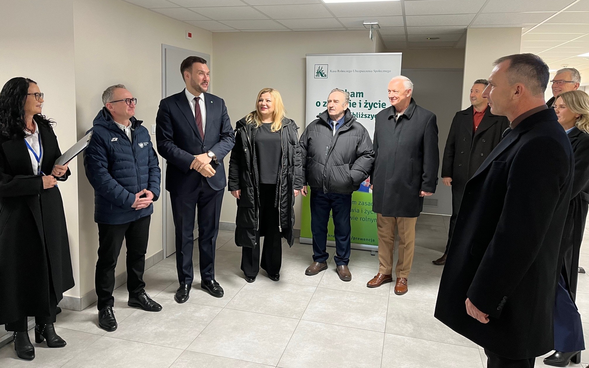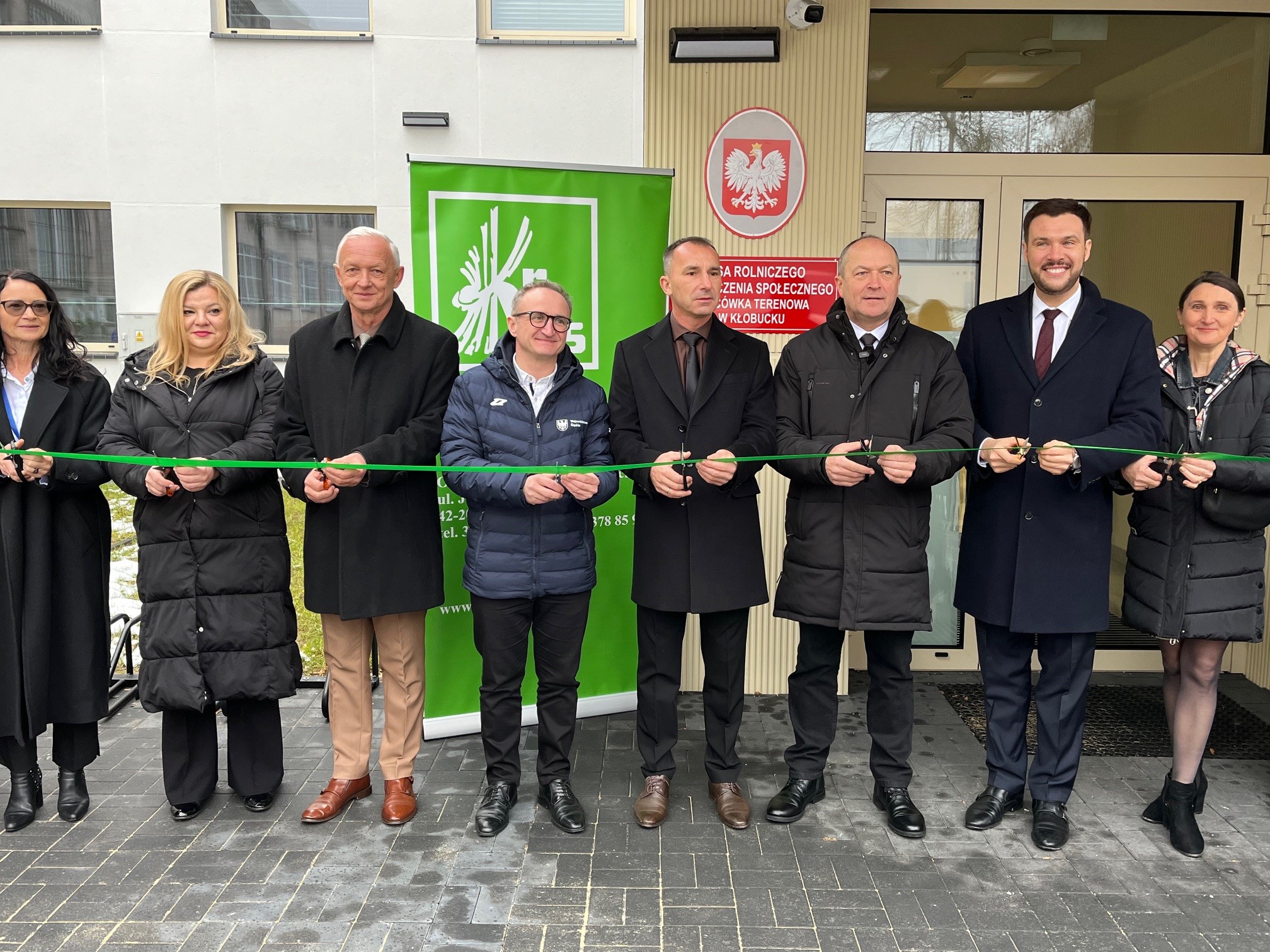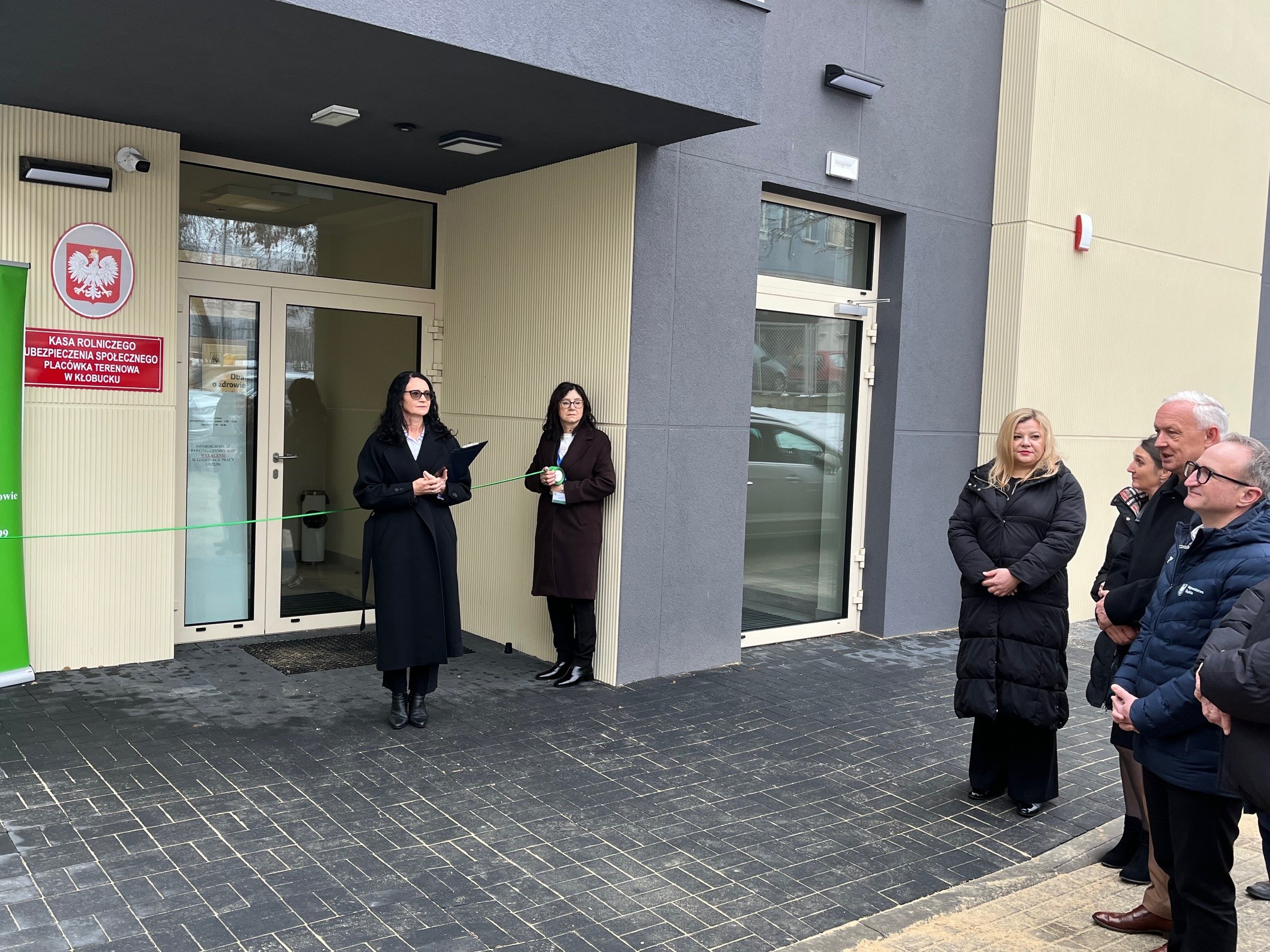 1 grudnia Prezes Kasy Rolniczego Ubezpieczenia Społecznego i Prezes Zarządu Funduszu Składkowego Ubezpieczenia Społecznego Rolników Tomasz Ślusarczyk, Dyrektor Oddziału Regionalnego KRUS w Częstochowie Marzena Kędziora, Kierownik Placówki Terenowej KRUS w Kłobucku Irena Praska oraz przedstawiciele Biura Funduszu Składkowego Ubezpieczenia Społecznego Rolników dokonali oficjalnego otwarcia odnowionego budynku Placówki Terenowej KRUS w Kłobucku.