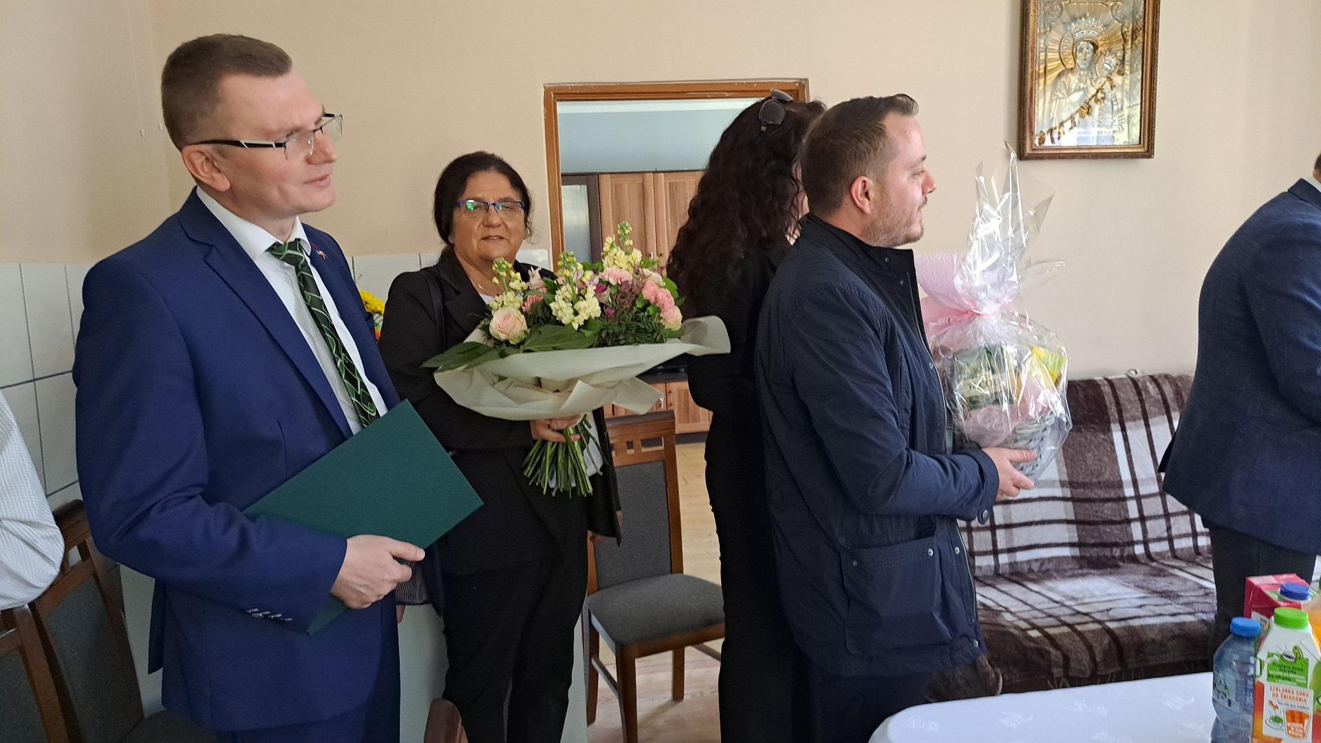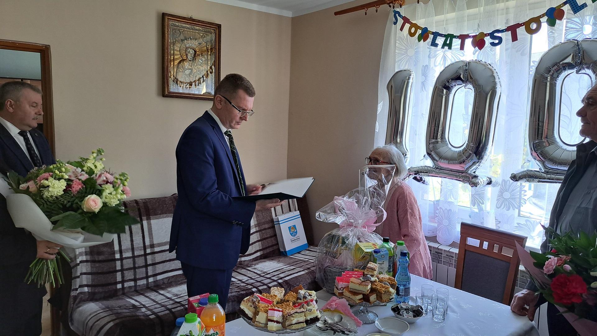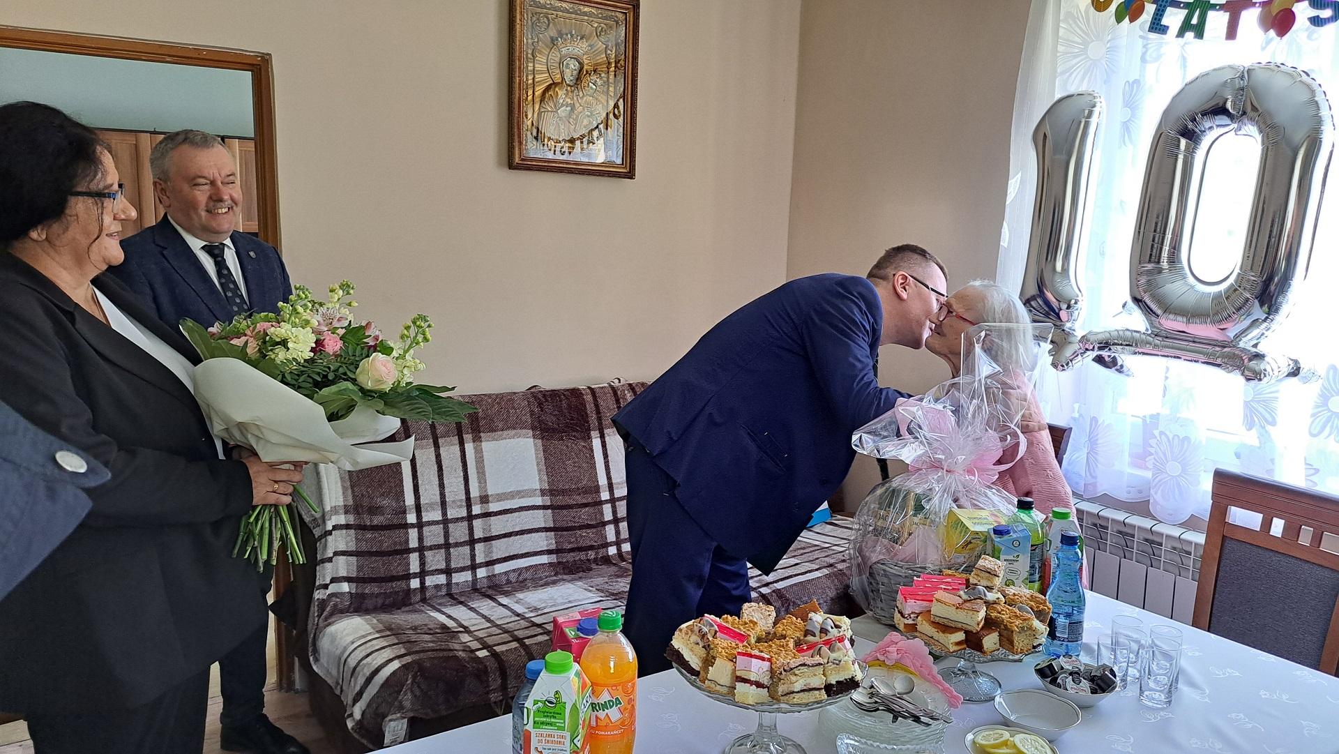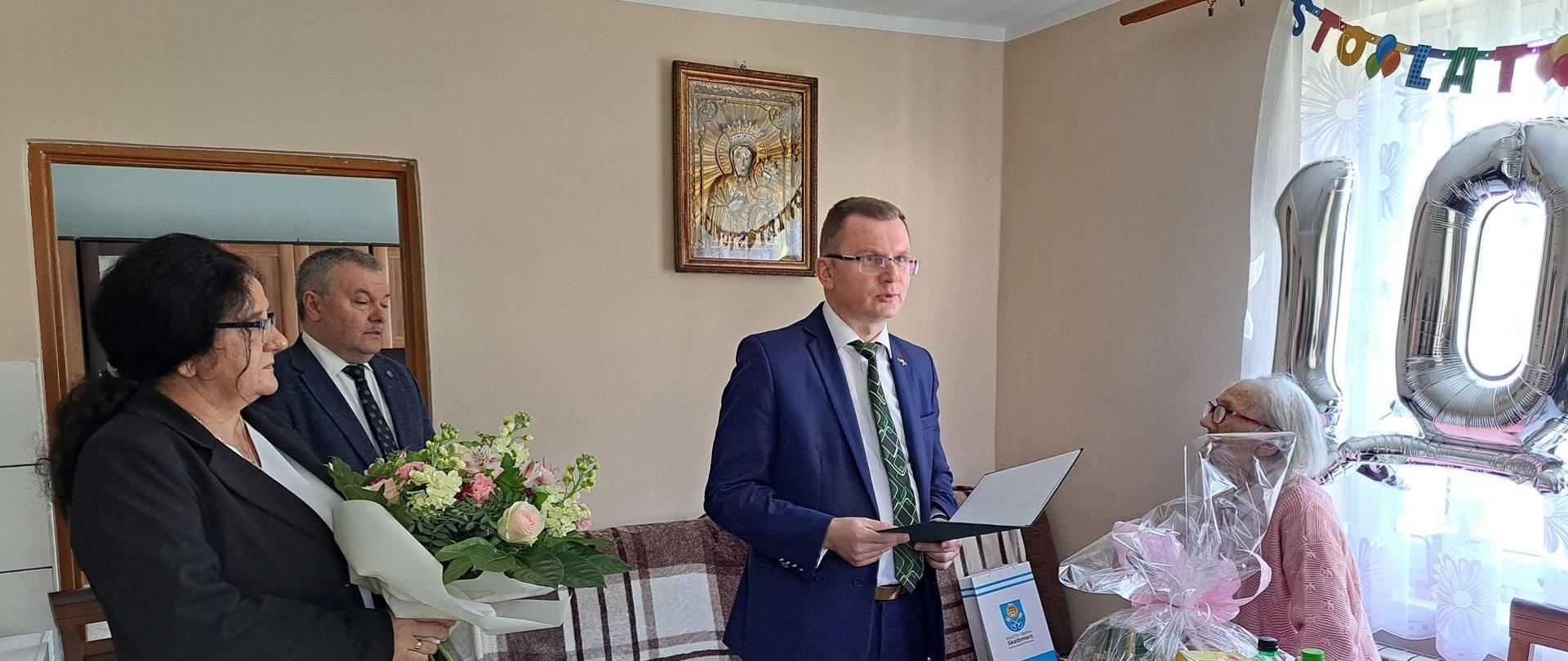 Z okazji tak wyjątkowego jubileuszu do Szanownej Jubilatki z listem Gratulacyjnym, kwiatami i upominkami udali się przedstawiciele skalbmierskiego samorządu : burmistrz Marek Juszczyk, zastępca burmistrza Kamil Włosowicz, skarbnik Agnieszka Basiak, radny Stanisław Grądek, radny elekt Mateusz Pudo, oraz sołtys Baranowa Szczepan Solarz, a także dyrektor Oddziału Regionalnego Kasy Rolniczego Ubezpieczenia Społecznego w Kielcach, Doktor Adam Stoksik oraz kierownik placówki terenowej KRUS w Kazimierzy Wielkiej, Elżbieta Kotyza.