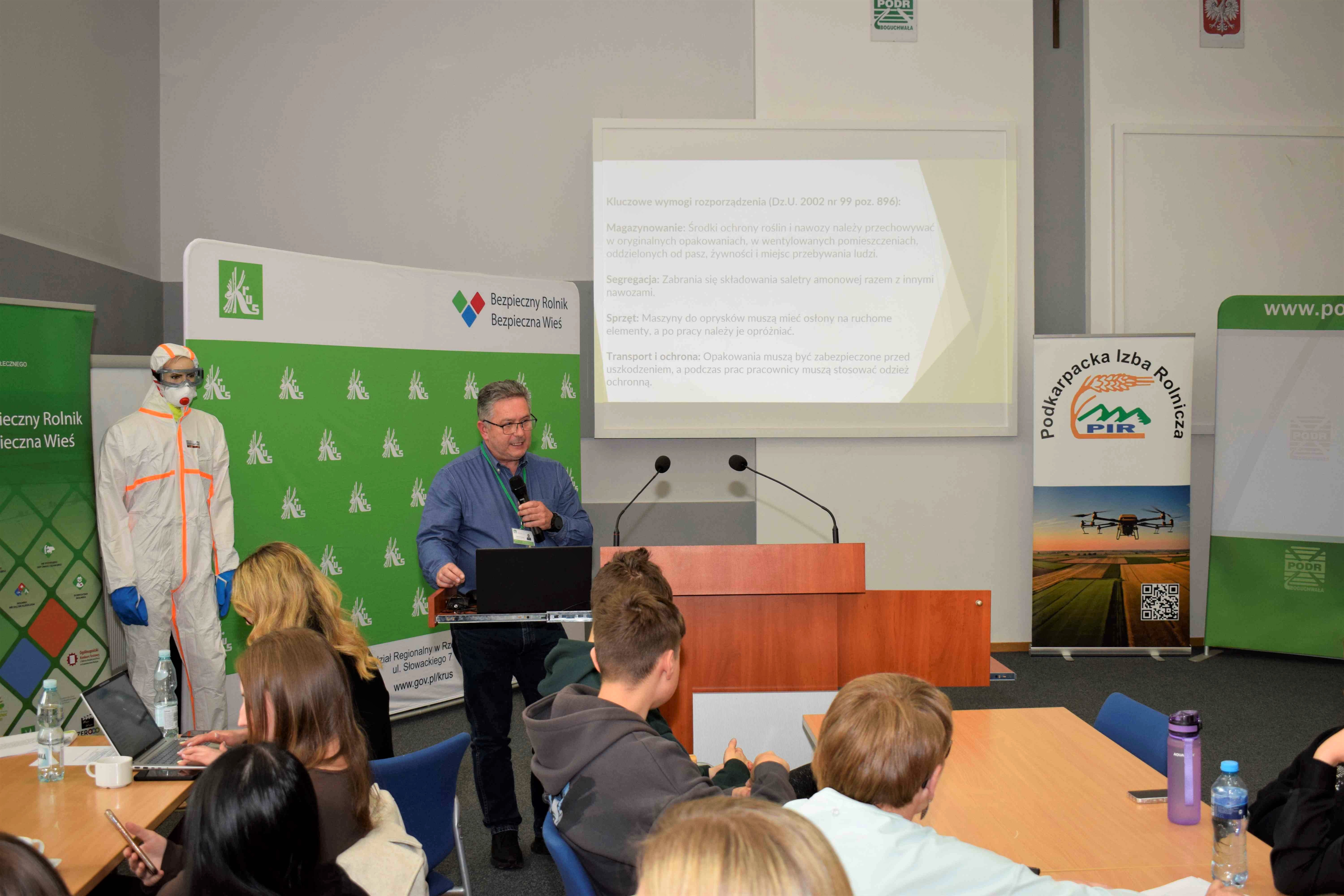 Szkolenie odbyło się 15 kwietnia 2026 r. w siedzibie PODR w Boguchwale Współorganizatorami spotkania był Podkarpacki Ośrodek Doradztwa Rolniczego oraz Podkarpacka Izba Rolnicza. Pracownicy OR KRUS w Rzeszowie: Agata Borcz oraz Bartłomiej Kałucki przedstawili problematykę związaną z zasadami ochrony zdrowia i życia w gospodarstwie rolnym oraz stosowania i przechowywania w gospodarstwie niebezpiecznych i szkodliwych substancji.