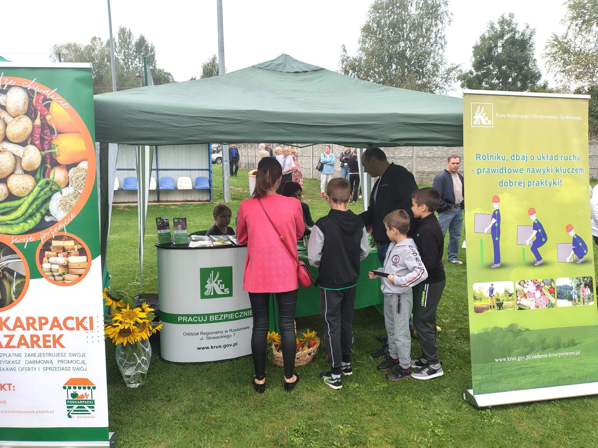 Organizatorzy imprezy ze sceny powitali kierownika Placówki Terenowej w Ropczycach Agnieszkę Żmudę i zaprosili rolników do odwiedzenia stoiska KRUS, gdzie pracownicy obsługujący stoisko Kasy udzielali informacji na temat zasad bezpiecznej pracy w gospodarstwie rolnym, dbałości o dobrostan rolników i ich rodzin oraz wielu innych ważnych informacji dotyczących ubezpieczeń, jak też rent i emerytur. Zachęcając do poszerzania wiedzy na temat zapobiegania chorobom odkleszczowym i wypadkom podczas pracy, zapraszali do odwiedzania placówki znajdującej się w Ropczycach przy ul. Rynek 7 oraz aktywnego udziału w konkursach i szkoleniach dla rolników i ich dzieci.