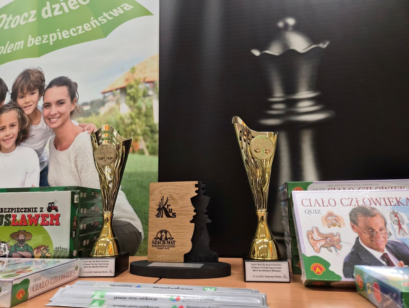 Każdy uczestnik otrzymał upominki przygotowane przez KRUS – gry edukacyjne, kalendarze oraz gadżety przypominające o zasadach bezpieczeństwa. Najlepsi zawodnicy odebrali efektowne statuetki z logiem KRUS, będące wyjątkową pamiątką zdobytego sukcesu.