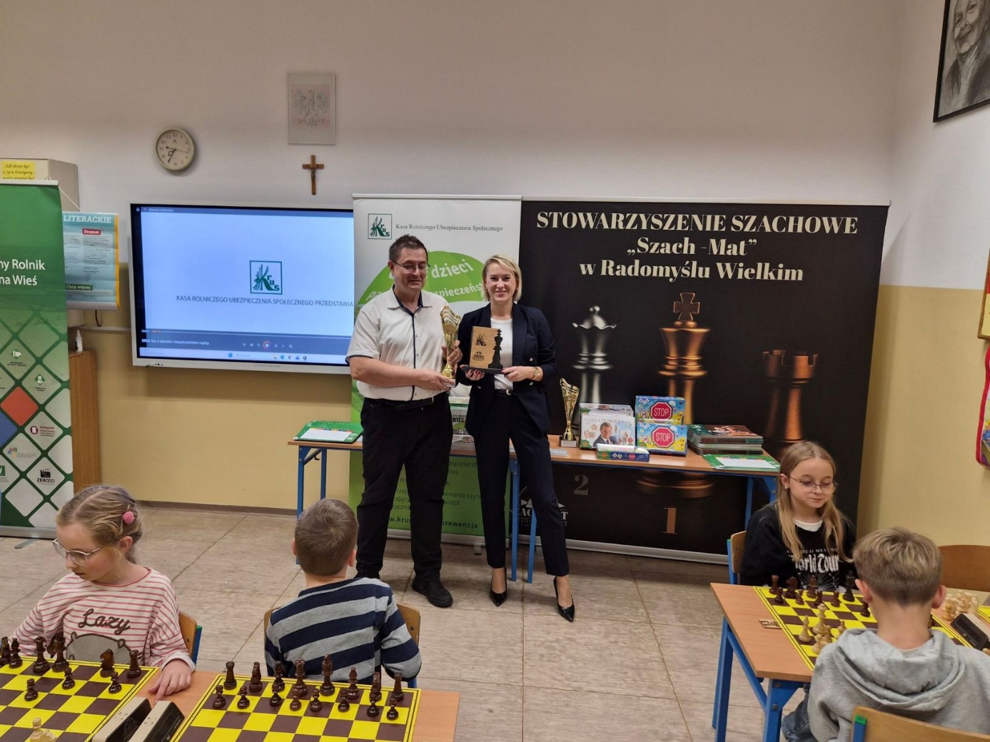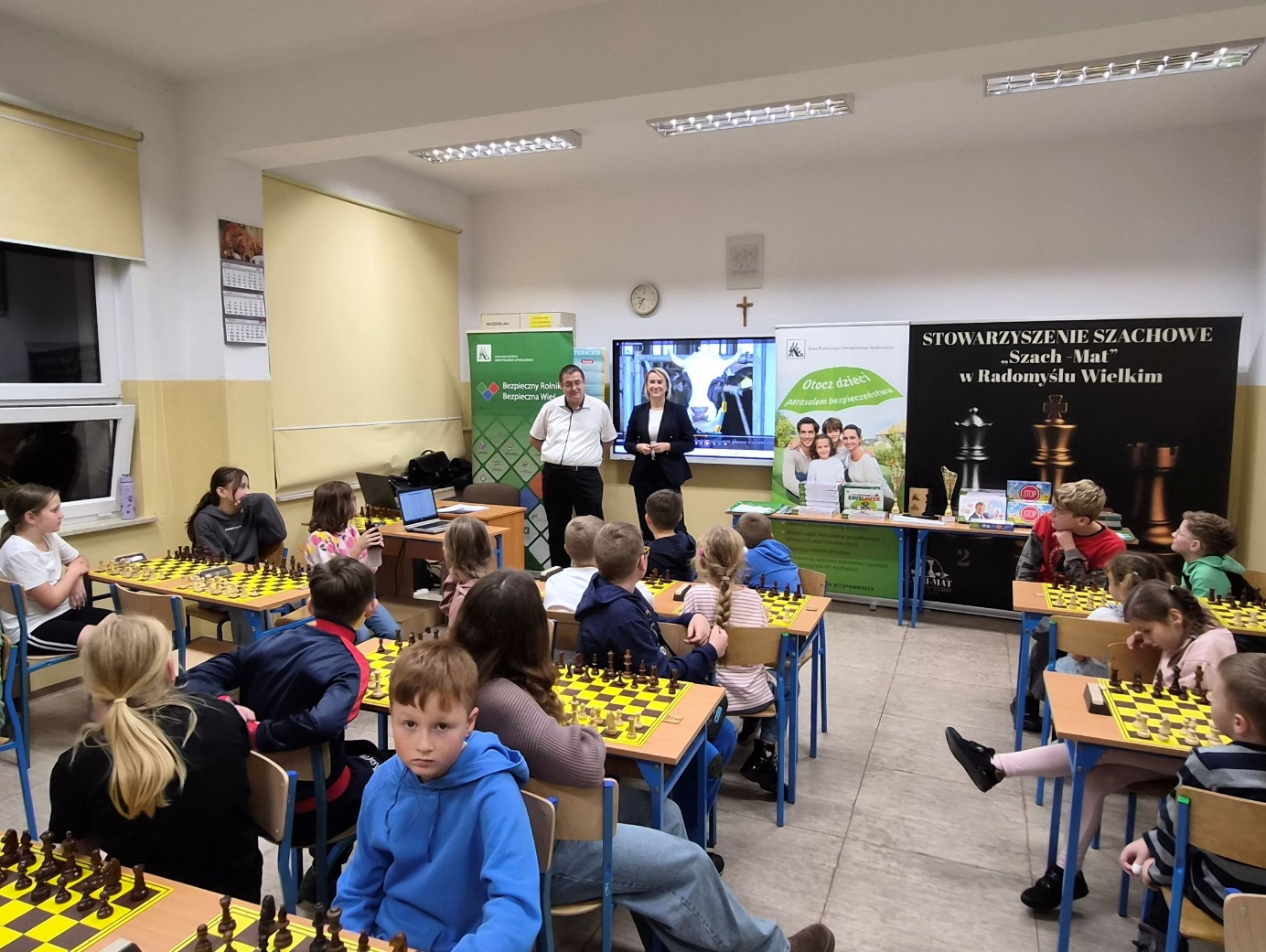 Przed rozpoczęciem turnieju uczestnicy wzięli udział w wartościowej części edukacyjnej. Pani Aneta Cebula - pracownik KRUS i utytułowana zawodniczka w szachowych spartakiadach, wraz z Panem Robertem Żyłą, poprowadzili prelekcję dotyczącą zasad bezpiecznej pracy w gospodarstwie rolnym. Dzieci obejrzały także edukacyjny film o bezpieczeństwie, który pokazał, jak unikać zagrożeń.