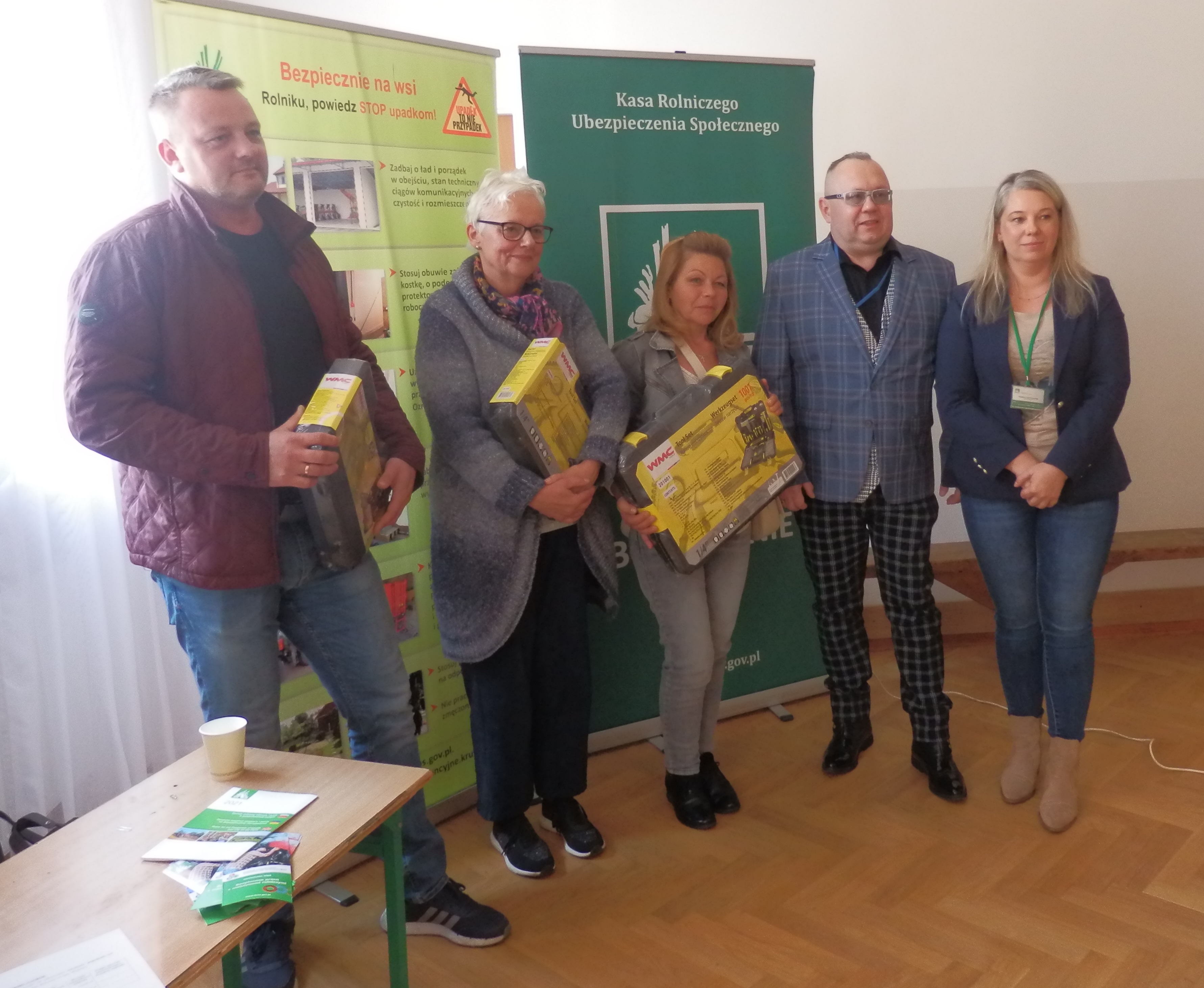 Podczas szkolenia rolnicy obejrzeli materiał filmowy „Bezpieczna obsługa maszyn i urządzeń rolniczych” oraz spot „Bezpieczny Rolnik, Bezpieczna Wieś”. Spotkanie zakończyło się konkursem testowym ze znajomości zasad BHP w gospodarstwie rolnym „Pracuj bezpiecznie”. Laureaci konkursu otrzymali nagrody rzeczowe ufundowane przez KRUS, które wręczył Kierownik Placówki Terenowej KRUS Mariusz Sobieraj. Laureatami konkursu „Pracuj bezpiecznie” zostali: