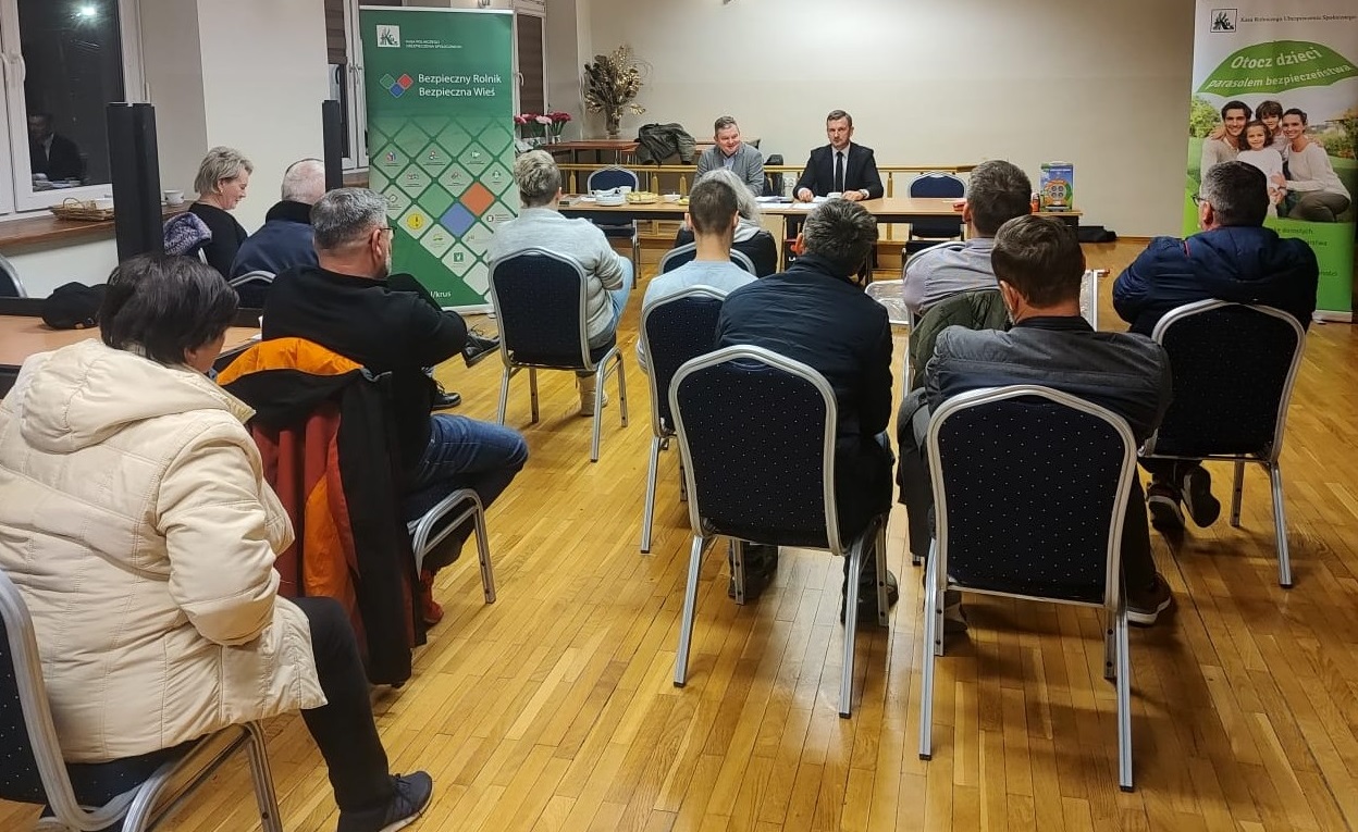 Podczas spotkania uczestnicy zapoznali się z zasadami bezpiecznej pracy w gospodarstwie rolnym, omówiono zagrożenia wypadkowe, przede wszystkim związane z upadkami osób, pochwyceniami i uderzeniami przez ruchome części maszyn i urządzeń oraz stosowaniem substancji niebezpiecznych.