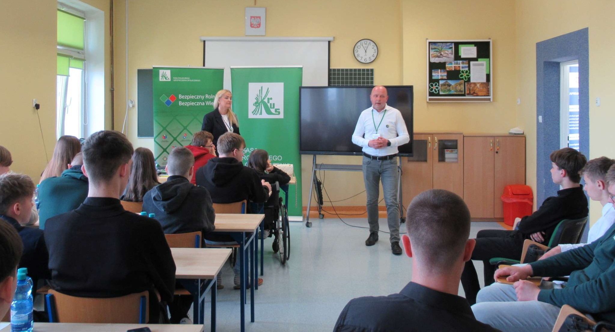 Uczniowie z uwagą wysłuchali wykładu, a później chętnie uczestniczyli w dyskusji. Pracownik PT KRUS w Myszyńcu Marcin Złotorawski wskazał aspekty dotyczące sytemu ubezpieczeń rolników, zakładania e-kont oraz płynących z tego tytułu korzyści. Pracownicy prewencji przekazali również informacje o organizowanych przez KRUS konkursach, w tym o konkursie dla młodzieży Moja Wizja ZERO.