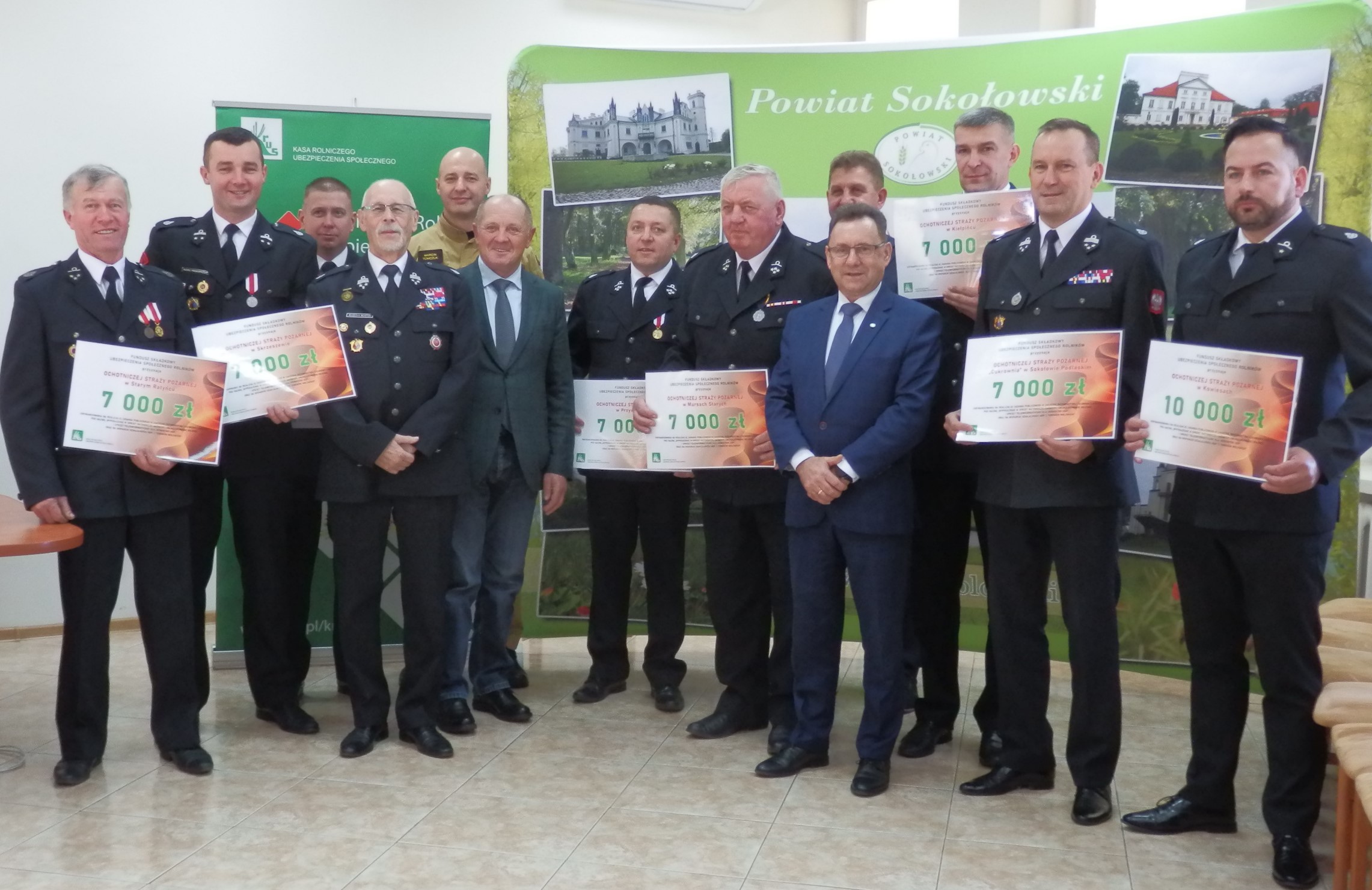 Wsparcie z Funduszu Składkowego Ubezpieczenia Społecznego Rolników otrzymały jednostki OSP: Kiełpiniec, Kowiesy, Mursy Stare, Przywózki, Skrzeszew, Cukrownia w Sokołowie Podlaskim, Stary Ratyniec, Wólka Okrąglik. Każda z nich otrzymała dofinansowanie w wysokości od 7000 zł do 10 000 zł.