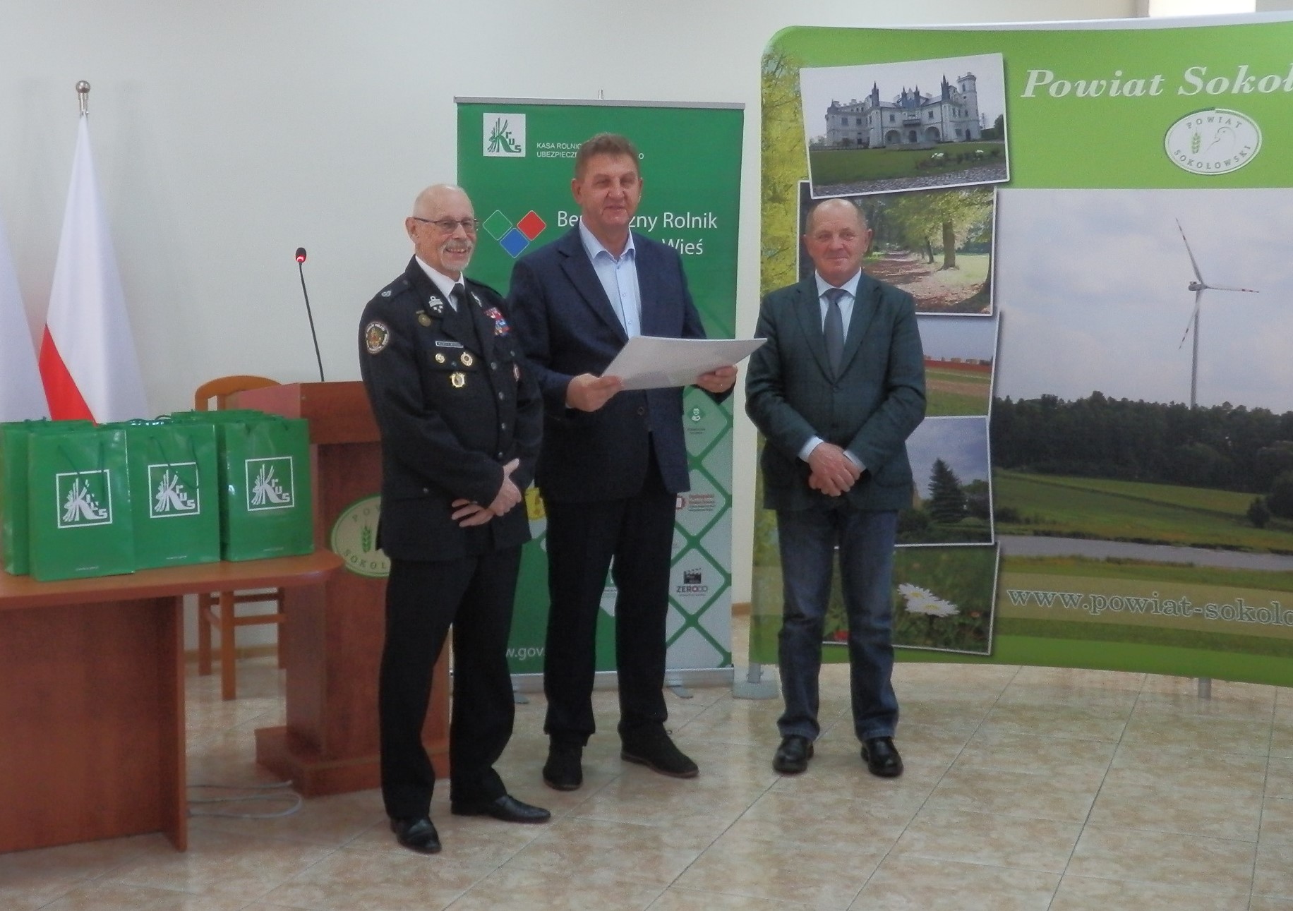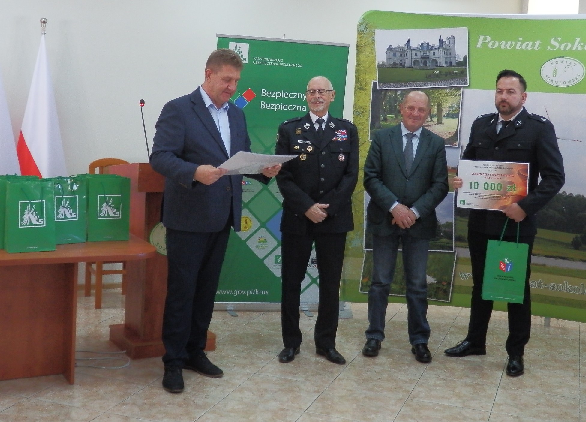 W spotkaniu udział wzięli przedstawiciele jednostek OSP korzystających ze wsparcia, marszałek senior – poseł na sejm RP Marek Sawicki, starosta sokołowski Adam Góral, komendant powiatowy Państwowej Straży Pożarnej w Sokołowie Podlaskim Marcin Tomczuk, szef powiatowych struktur OSP Wojciech Wicherski. Kasę Rolniczego Ubezpieczenia Społecznego reprezentował kierownik Placówki Terenowej w Sokołowie Podlaskim Tadeusz Hardej, który powitał obecnych na spotkaniu, podziękował za przybycie, przedstawił formy działalności FSUSR oraz wręczył promesy.