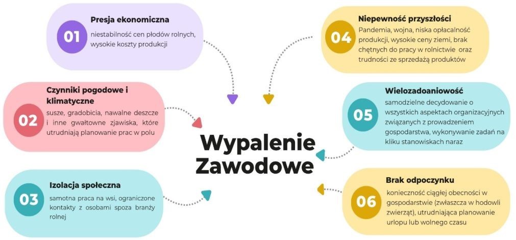 - objawy psychicznie – obniżony nastrój, apatia, lęki oraz problemy z koncentracją. Rolnik dotknięty wypaleniem może odczuwać spadek motywacji do pracy i życia codziennego, co może prowadzić do konfliktów rodzinnych oraz izolacji społecznej (np. unikanie kontaktów z bliskimi).