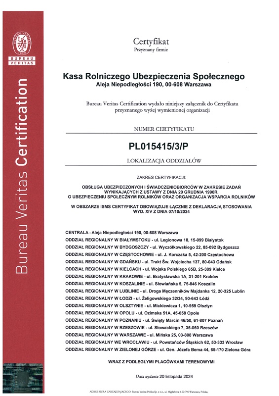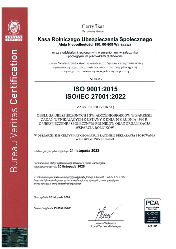 Cyklicznie, raz na 3 lata zewnętrzna jednostka certyfikująca przeprowadza w KRUS audyt recertyfikacyjny Zintegrowanego Systemu Zarządzania, polegający na sprawdzeniu wdrożonych wymagań norm ISO 9001 i ISO/IEC 27001. Dotychczas po każdym zrealizowanym audycie zewnętrznym, Kasie przyznawano certyfikat potwierdzający zgodność Systemu Zarządzania Jakością oraz Systemu Zarządzania Bezpieczeństwem Informacji funkcjonującego w KRUS z wymaganiami ww. norm w obszarze obsługi ubezpieczonych i świadczeniobiorców w zakresie zadań wynikających z ustawy z dnia 20 grudnia 1990 r. o ubezpieczeniu społecznym rolników oraz organizacja wsparcia rolników. Certyfikat przyznawany jest na 3 lata, a jego ważność jest weryfikowana i utrzymywana podczas przeprowadzanych corocznie audytów zewnętrznych. Utrzymanie ważności certyfikatu dowodzi przejrzystości działania instytucji ubezpieczenia społecznego rolników oraz potwierdza, że funkcjonujący w Kasie system jest stale doskonalony, a opisane wewnętrznymi procesami i procedurami standardy działania są powszechnie praktykowaną normą.