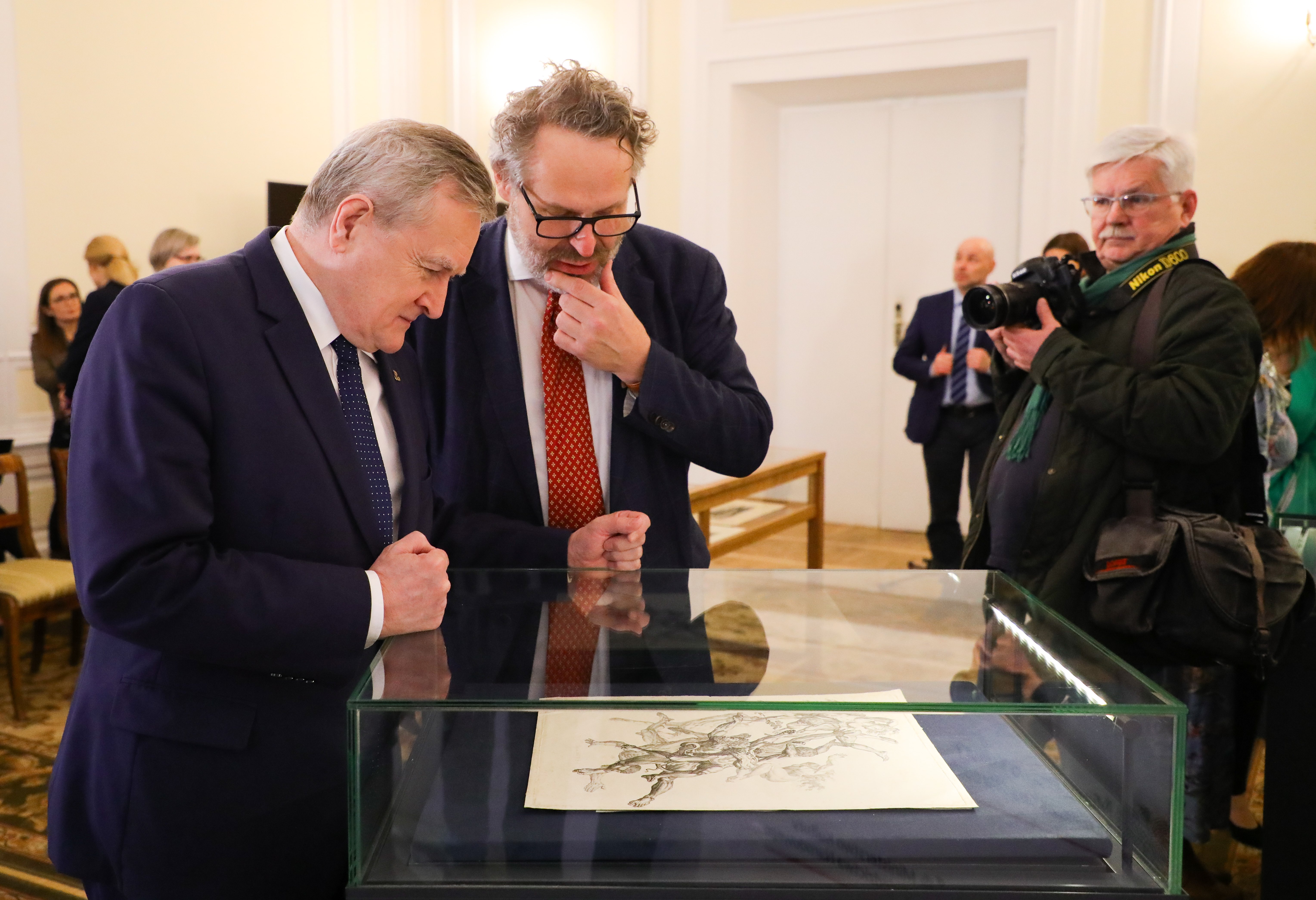 Minister kultury i dziedzictwa narodowego podkreślił, że pochodzenie grafik odkrył marszand oraz historyk sztuki - Sylwester Rudnik, o czym poinformował posiadacza dzieł, który – po zapoznaniu się z pochodzeniem obiektów – podjął decyzję o ich bezwarunkowym przekazaniu na rzecz Skarbu Państwa. Wicepremier przekazał, że zarówno posiadacz grafik, Piotr Molenda, jak i odkrywca ich pochodzenia, zostaną uhonorowani odznaką "Zasłużony dla Kultury Polskiej".