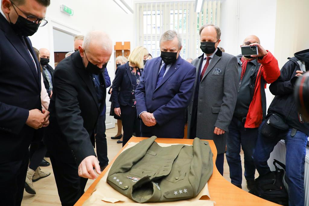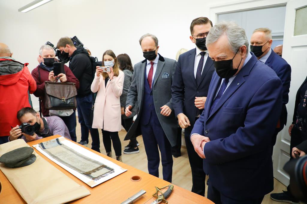 Podczas dzisiejszej wizyty w budynku archiwum Małopolskiego Urzędu Wojewódzkiego w Krakowie pokazana została część zbiorów, m.in. czapka maciejówka Legionów Polskich, kurtka mundurowa wz. 1936, ze stopniem rotmistrza, na kołnierzu aplikowany „wężyk” oraz proporczyki 5 dywizjonu taborów, pierwotnie błękitne z amarantowym paskiem, baretki odznaczeń, w tym Odznaka za Rany i Kontuzje, w kieszeni karteczka z odręcznym pismem „kpt Aleksander KORALEWSKI…”, szarfa z pogrzebu Władysława Beliny-Prażmowskiego w 1938 r. w dwóch częściach, na wstędze w barwach Virtuti Militari napis „beliniacy” i szabla wz. 17, Polska, po 1917, po Ludwiku Angelusie. Można było zobaczyć także sztandary, modele architektoniczne i ołtarz walizkowy
