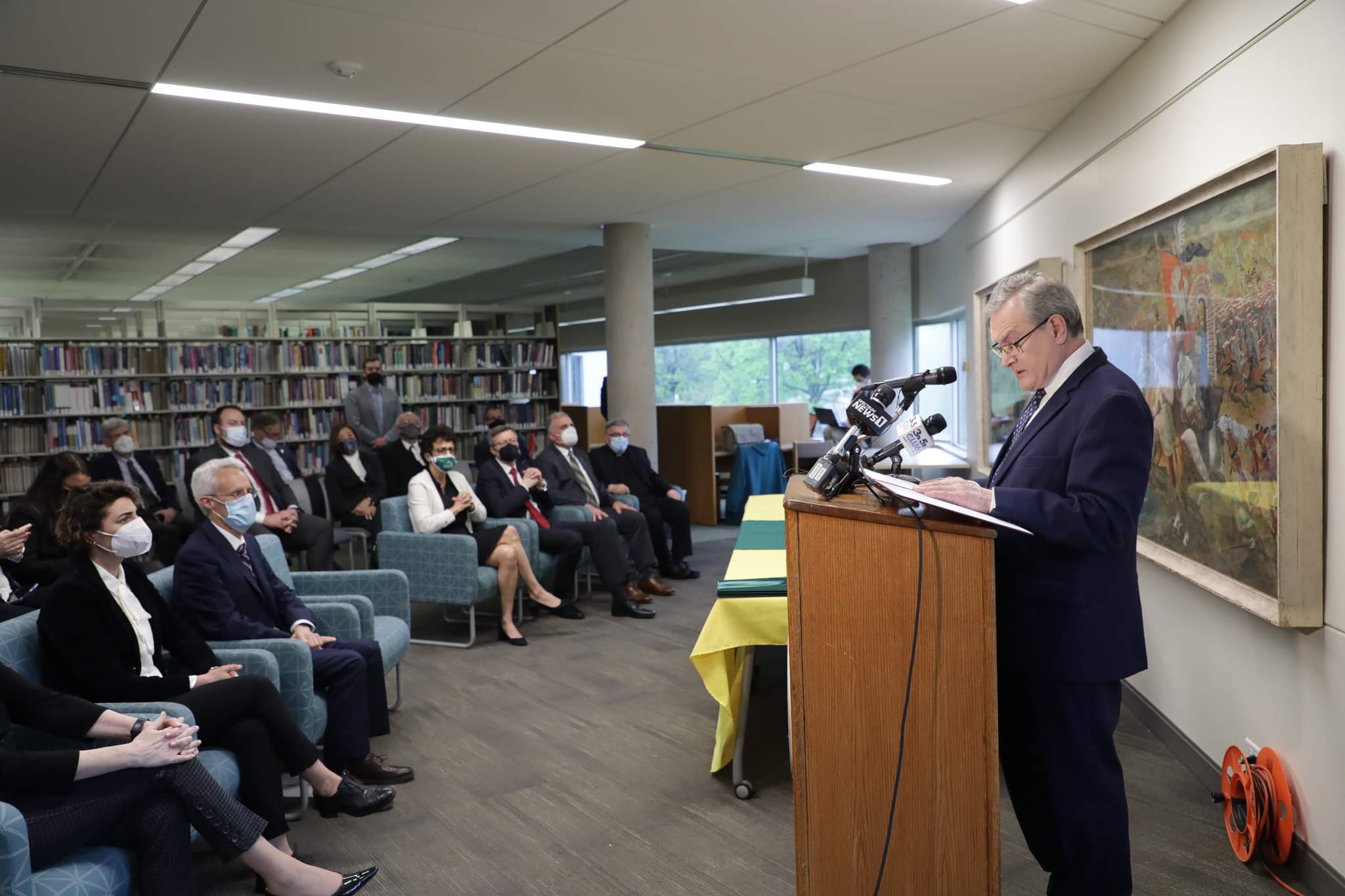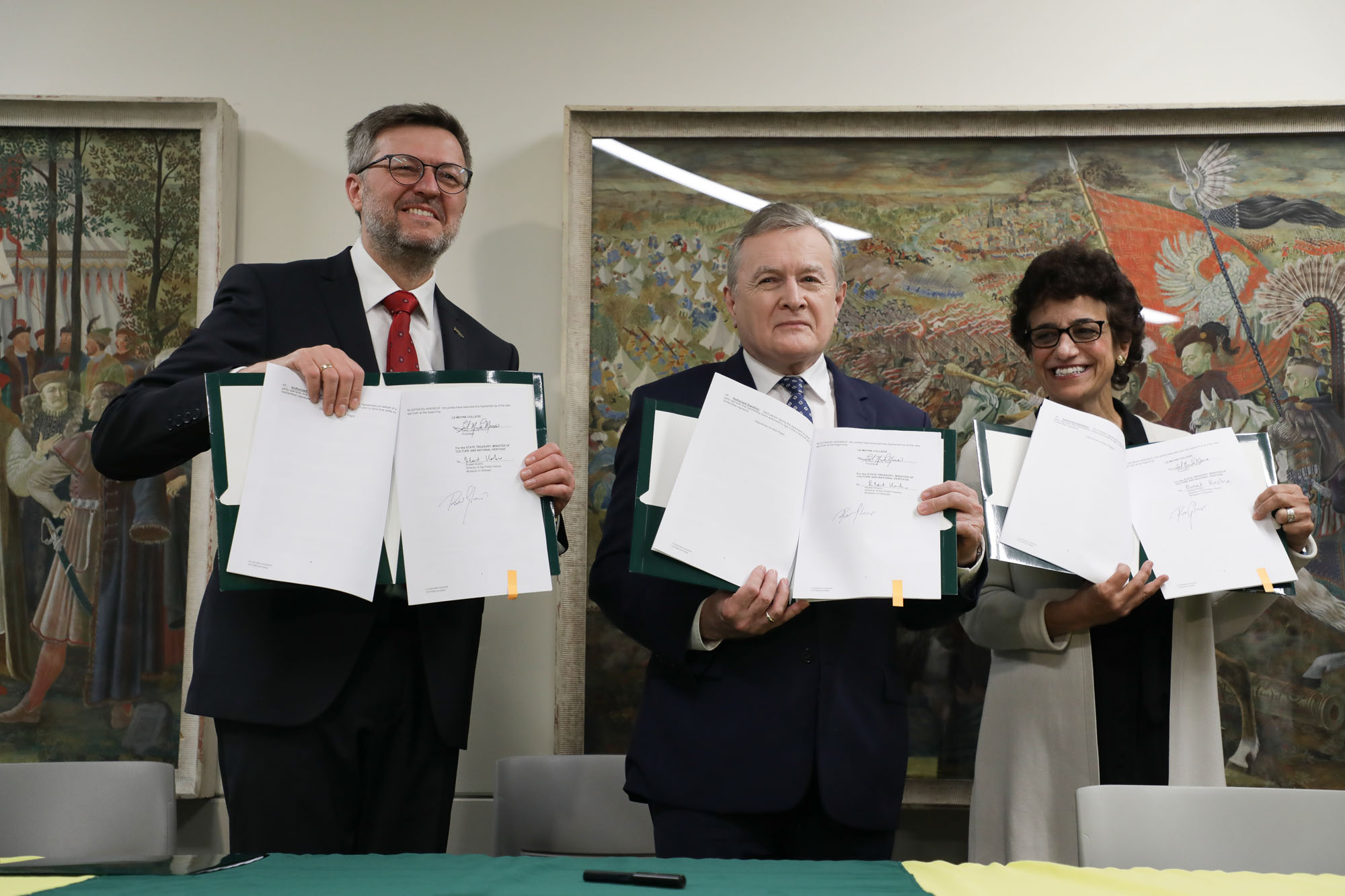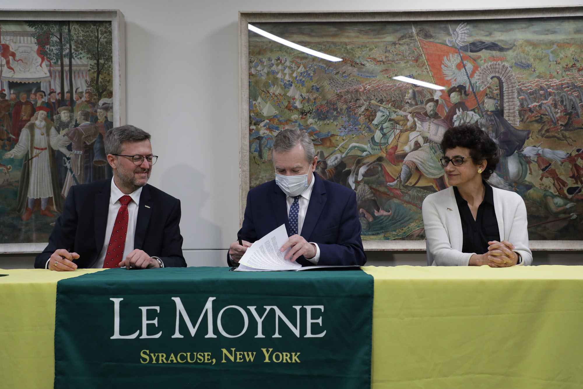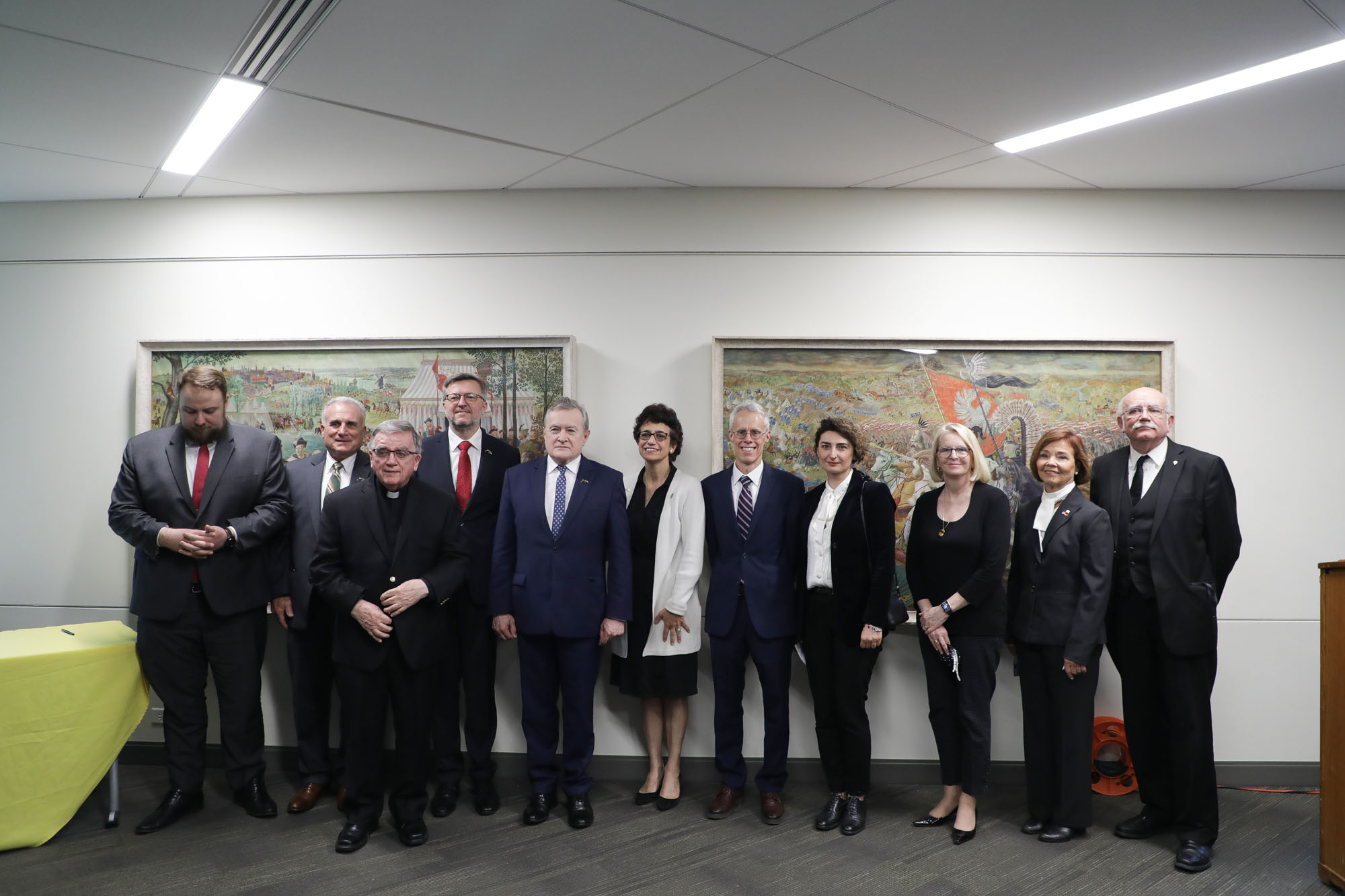 To wydarzenie szczególne dla polskiego dziedzictwa. Przez wiele lat różne środowiska i instytucje zabiegały, aby historia obrazów i makat z Le Moyne College nie została zapomniane. Naszym wspólnym sukcesem jest to, że spotykamy się dzisiaj w Syracuse, w Le Moyne College, aby podpisać umowę o przekazaniu dzieł polskich artystów z powrotem do Polski. W tym miejscu chciałbym jeszcze raz podziękować władzom Le Moyne College za współpracę i zrozumienie, jak ważne są dla nas te dzieła, a także za wieloletnią opiekę nad tym wyjątkowym zbiorem – powiedział wicepremier Piotr Gliński podczas uroczystości w Le Moyne College.